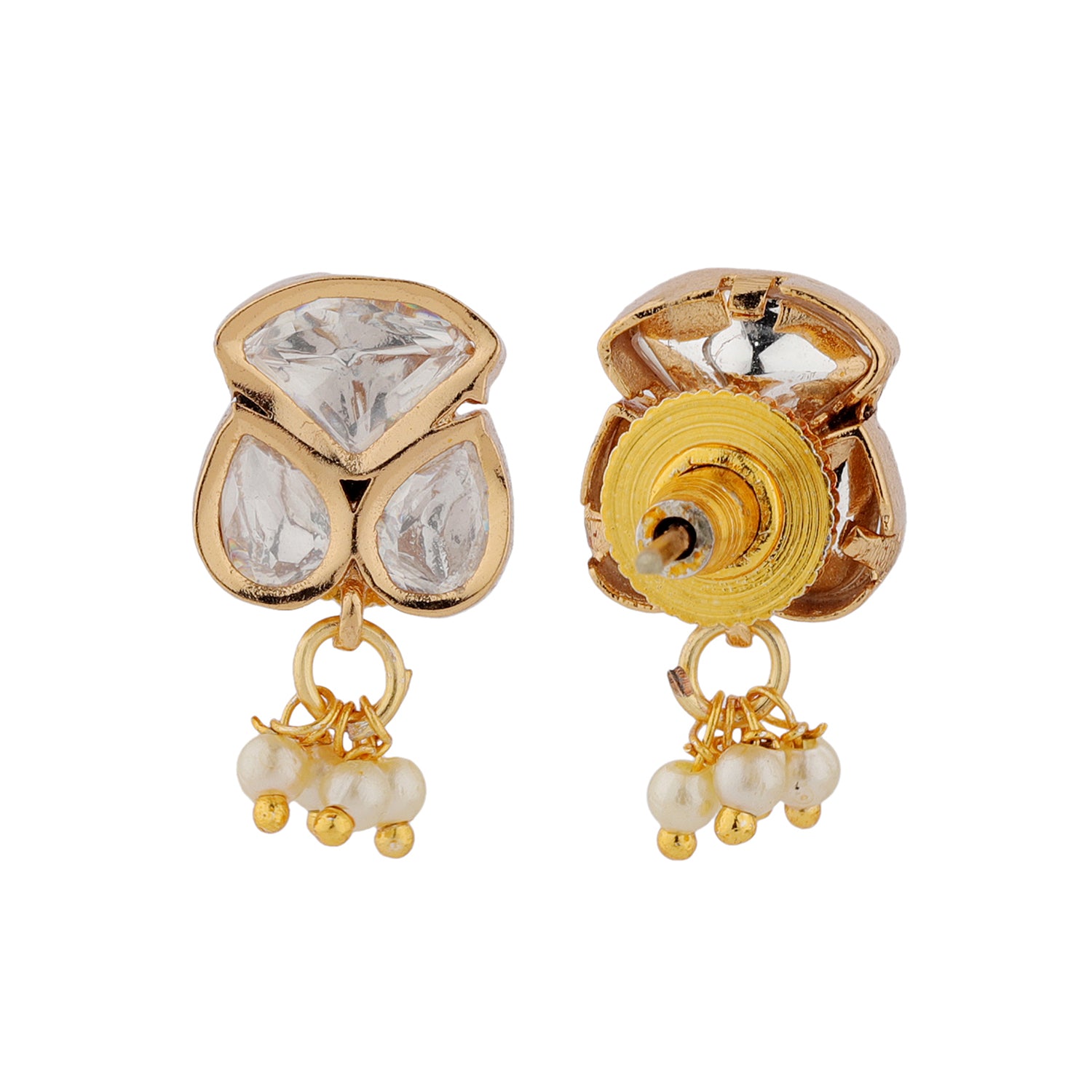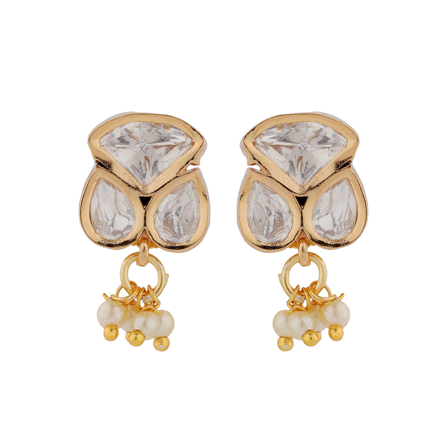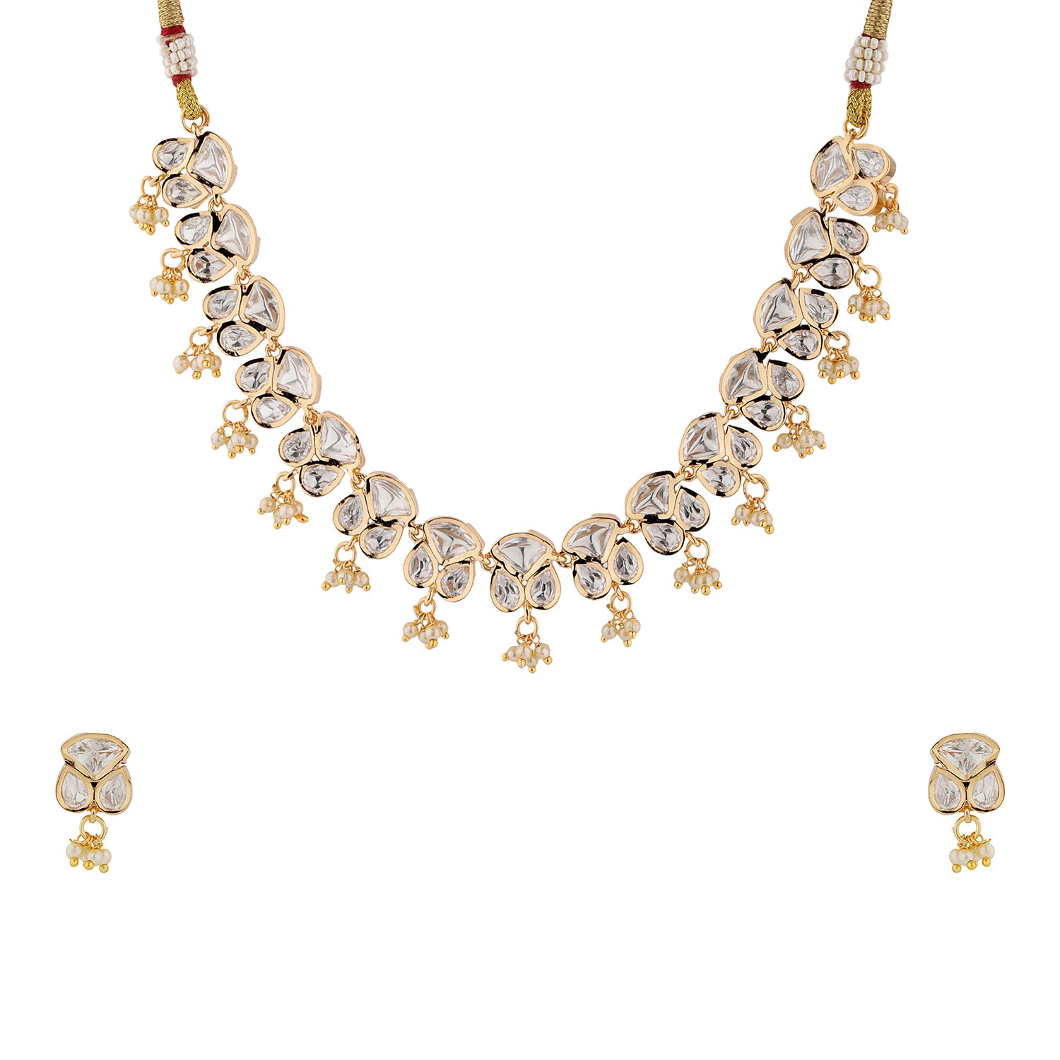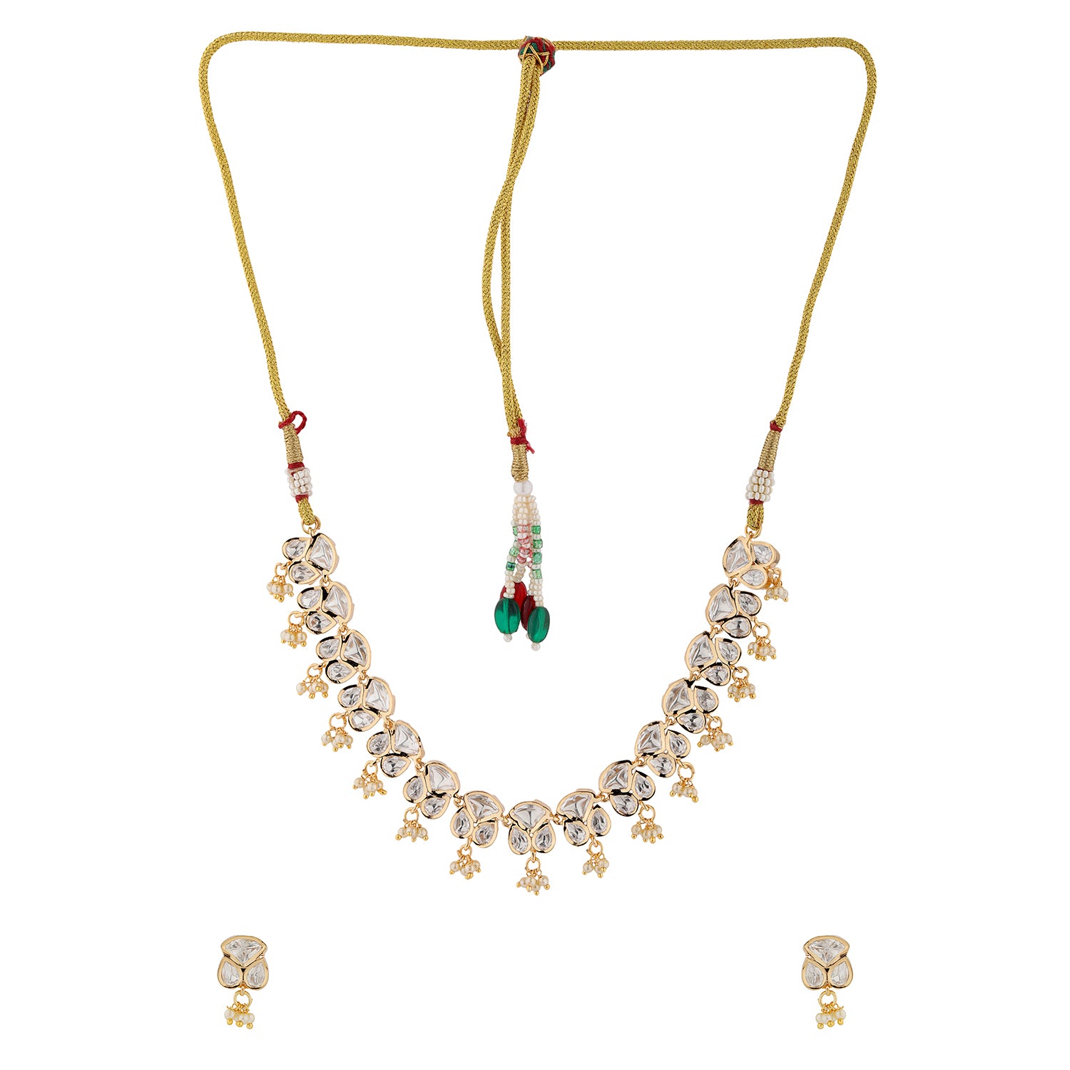 Grace your neckline with the timeless beauty of the Aaradhya Kundan Necklace Set, a masterpiece from our Kundan Elegance Collection. Handcrafted to perfection, this exquisite set celebrates the grandeur of traditional Indian jewelry, featuring an intricately designed necklace paired with matching earrings for a look that’s both regal and radiant. Made from premium brass and coated with a luxurious yellow gold plating, this necklace is adorned with hand-set Kundan stones that shimmer with heritage brilliance. The teardrop motifs, accented by delicate pearl clusters, exude royal charm and timeless femininity. Each detail reflects meticulous craftsmanship from the precise stone setting to the graceful finish,making it a statement piece for weddings, festivities, and celebrations. The Aaradhya Kundan Necklace Set captures the essence of Indian tradition while seamlessly blending it with contemporary sophistication. Whether it’s your wedding day or a festive occasion, this set is sure to make you feel like royalty.
