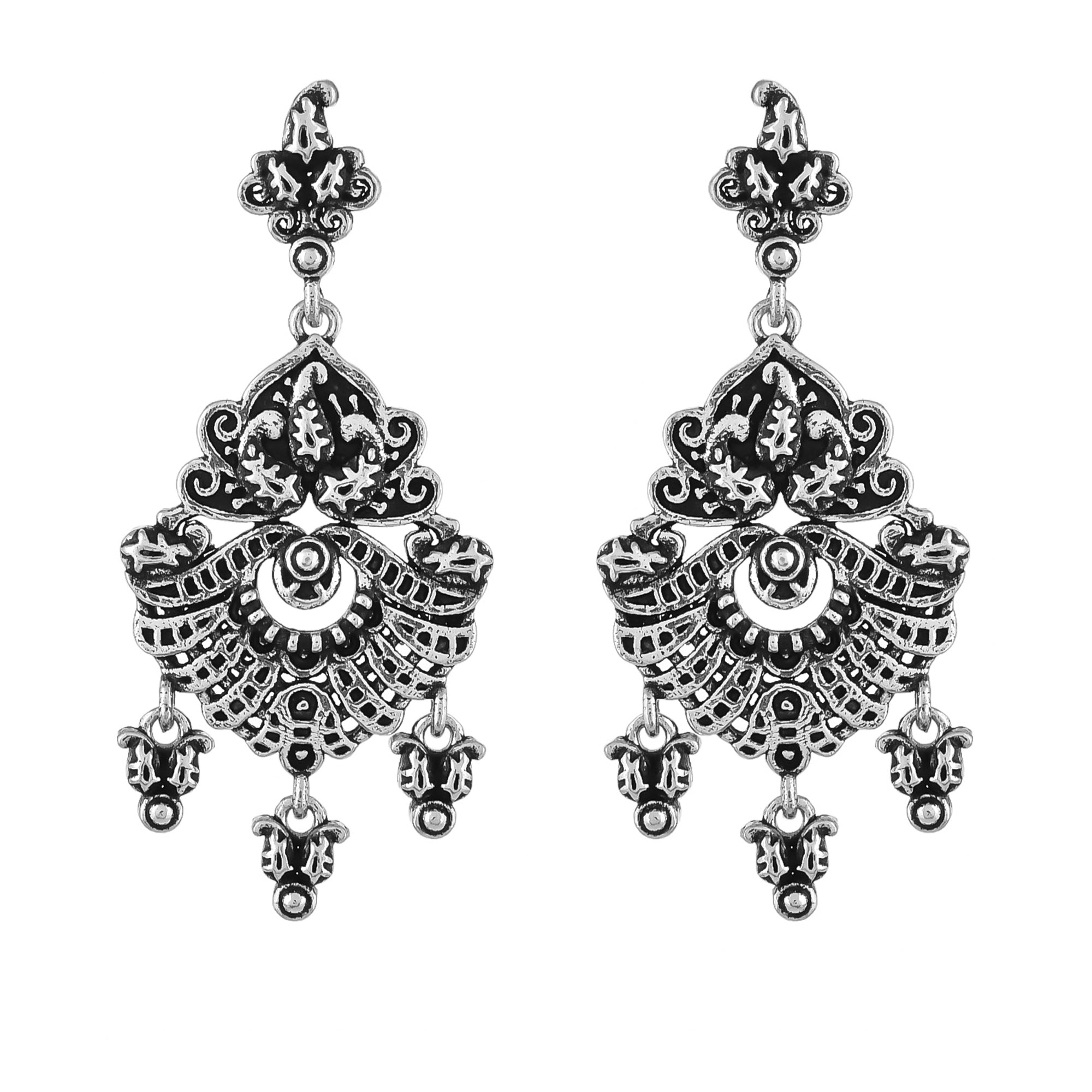 A statement Earrings And Ring Combo, designed to be the perfect Bohemian piece and inspired by the legendary Warli artform. Adjustable for maximum comfort, the silver plated ring has been crafted from high quality brass. Adorned with tribal motifs, the...