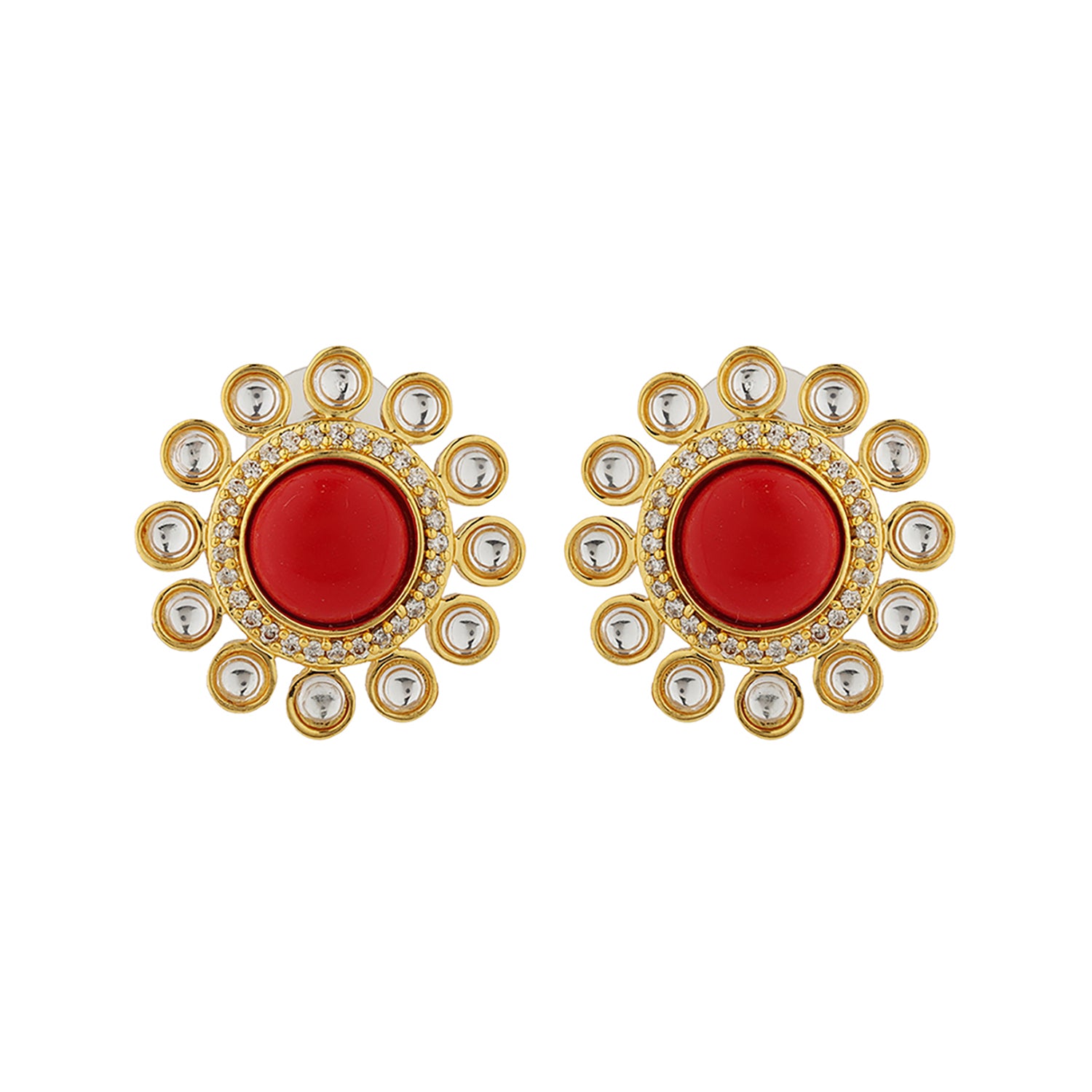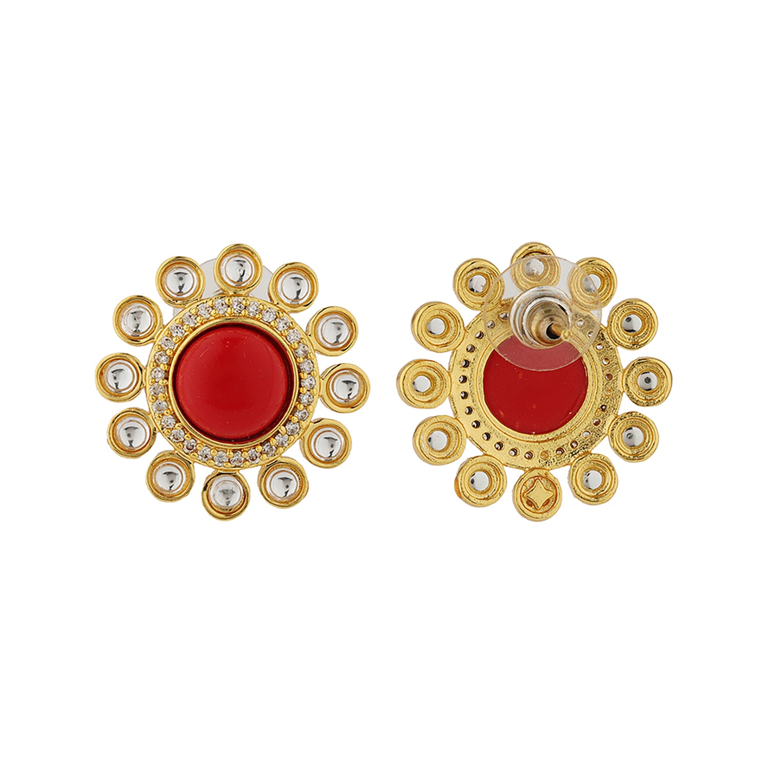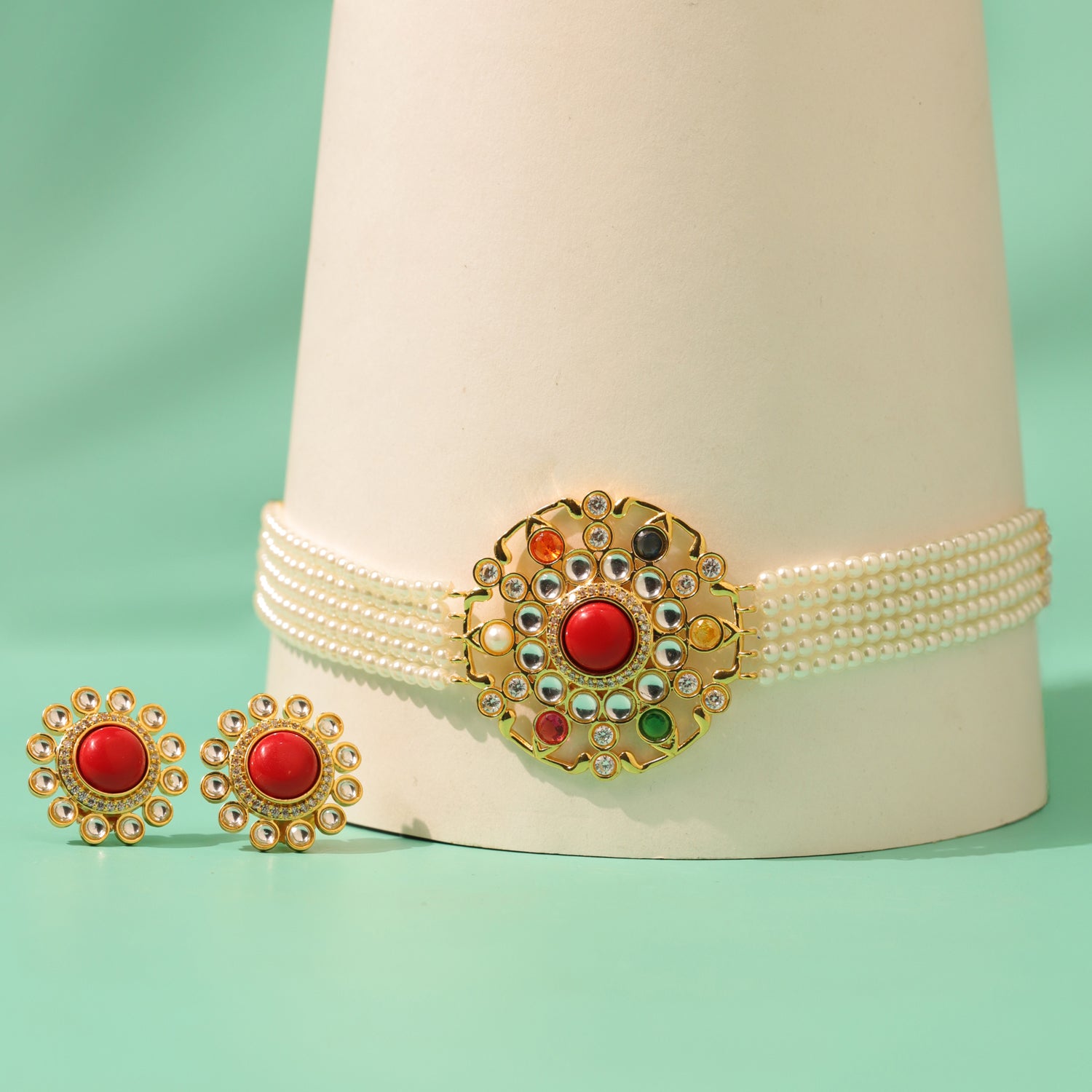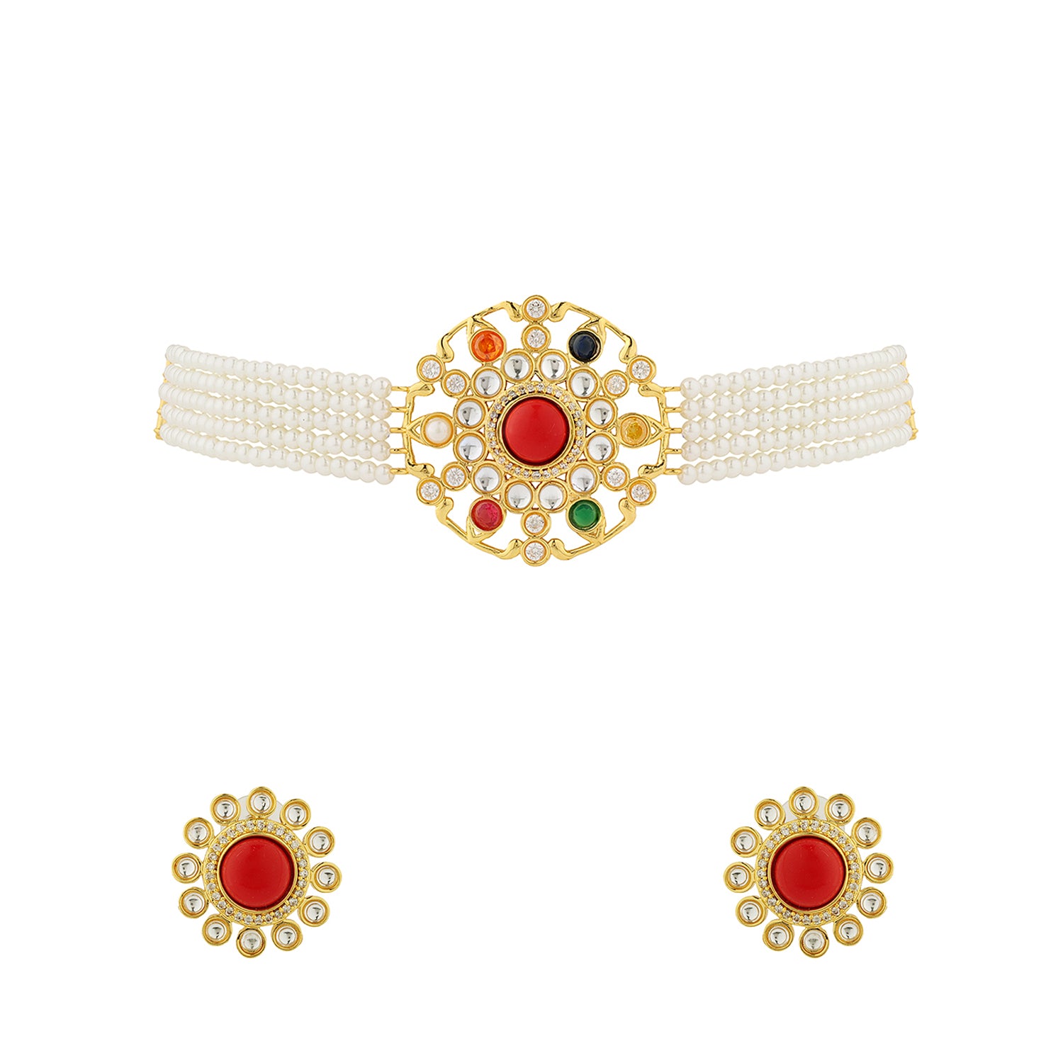 Step into regal elegance with the Navratan Crimson Bloom Choker Necklace Set, a piece that captures the brilliance of celestial beauty and timeless tradition. Belonging to the Navratan Collection, this design celebrates the harmony of nine sacred gemstones, each representing divine energy, prosperity, and balance. Designed for women who adore jewelry that carries meaning and magnificence, this choker beautifully combines cultural symbolism with contemporary charm. Crafted in brass and finished with radiant yellow gold plating, this designer necklace set for women features an intricately designed oval centerpiece adorned with a striking crimson stone surrounded by shimmering kundan and multicolored Navratan accents. The choker’s base is composed of multiple rows of delicate pearl strings, adding grace and sophistication. Complementary stud earrings complete the look, making it perfect for every festive or celebratory occasion. Ideal for wedding wear, festive wear, or pooja wear, this gold necklace set blends traditional opulence with modern finesse, ensuring you shine with divine allure wherever you go.