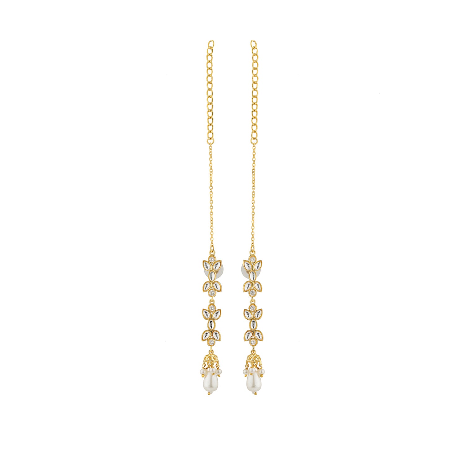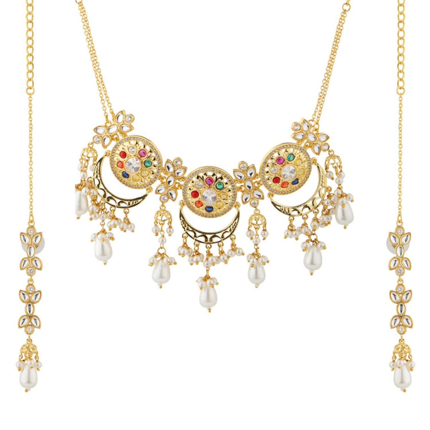 Embrace the divine harmony of tradition and timeless beauty with the Navratan Eternal Orbit Collar Necklace Set, a mesmerizing creation that captures the radiance of the cosmos in every detail. Inspired by the celestial power of the Navratan - the nine auspicious gemstones symbolizing balance, protection, and prosperity, this stunning piece from the Navratan Collection is designed for women who love jewelry that tells a story of grace and grandeur. Expertly handcrafted in brass and finished with a rich yellow gold plating, this designer necklace set for women features intricate circular motifs adorned with vibrant Navratan gemstones, lustrous pearls, and delicate kundan work. The crescent accents and dangling pearl drops give the design a fluid, rhythmic charm, reminiscent of celestial orbits in motion. Accompanied by elegant matching earrings, this gold necklace set perfectly complements your wedding wear, festive wear, or pooja attire, adding an aura of sophistication and divine allure. Whether it’s a celebration, ceremony, or heartfelt gift, this multicolored necklace set is a symbol of love, beauty, and cosmic elegance.
