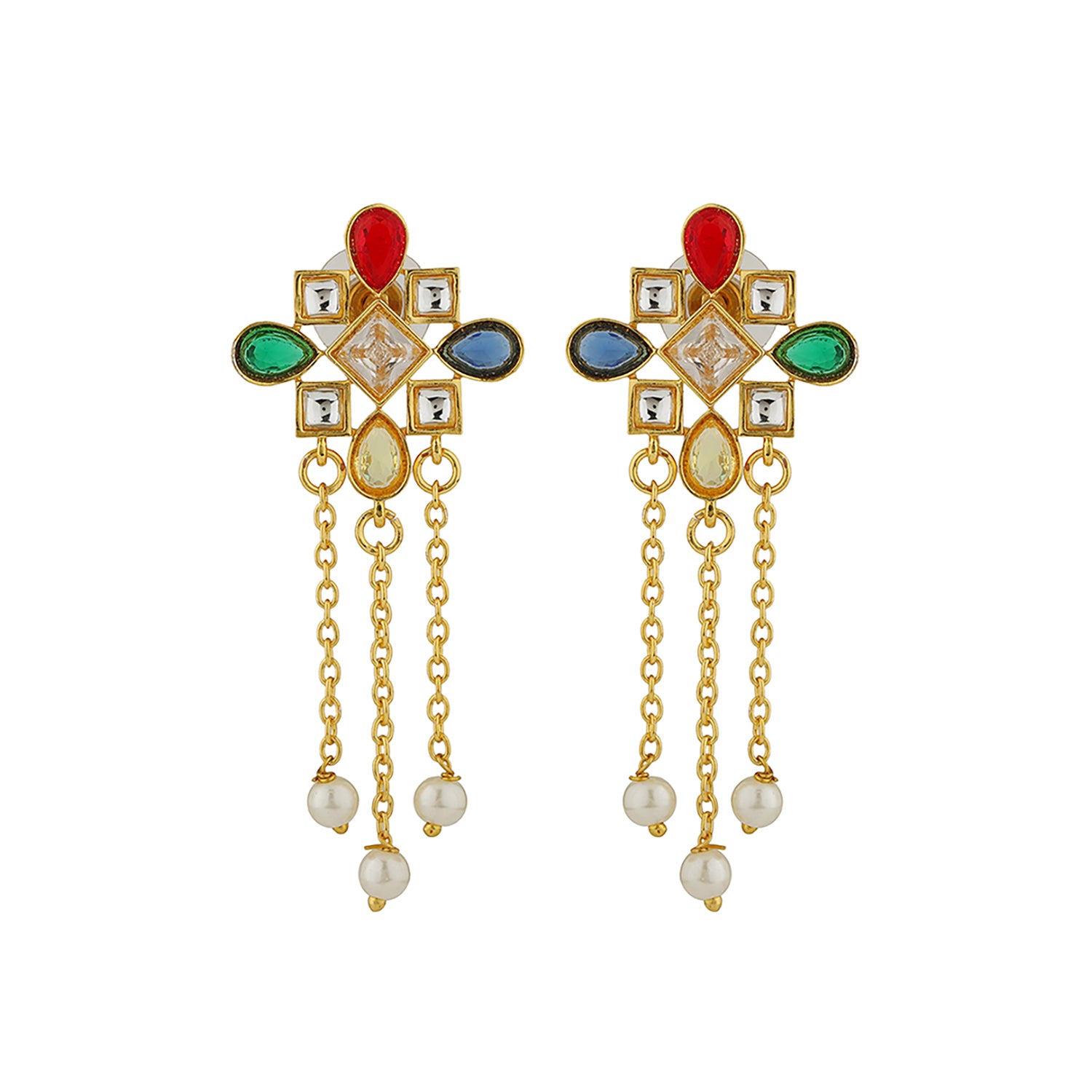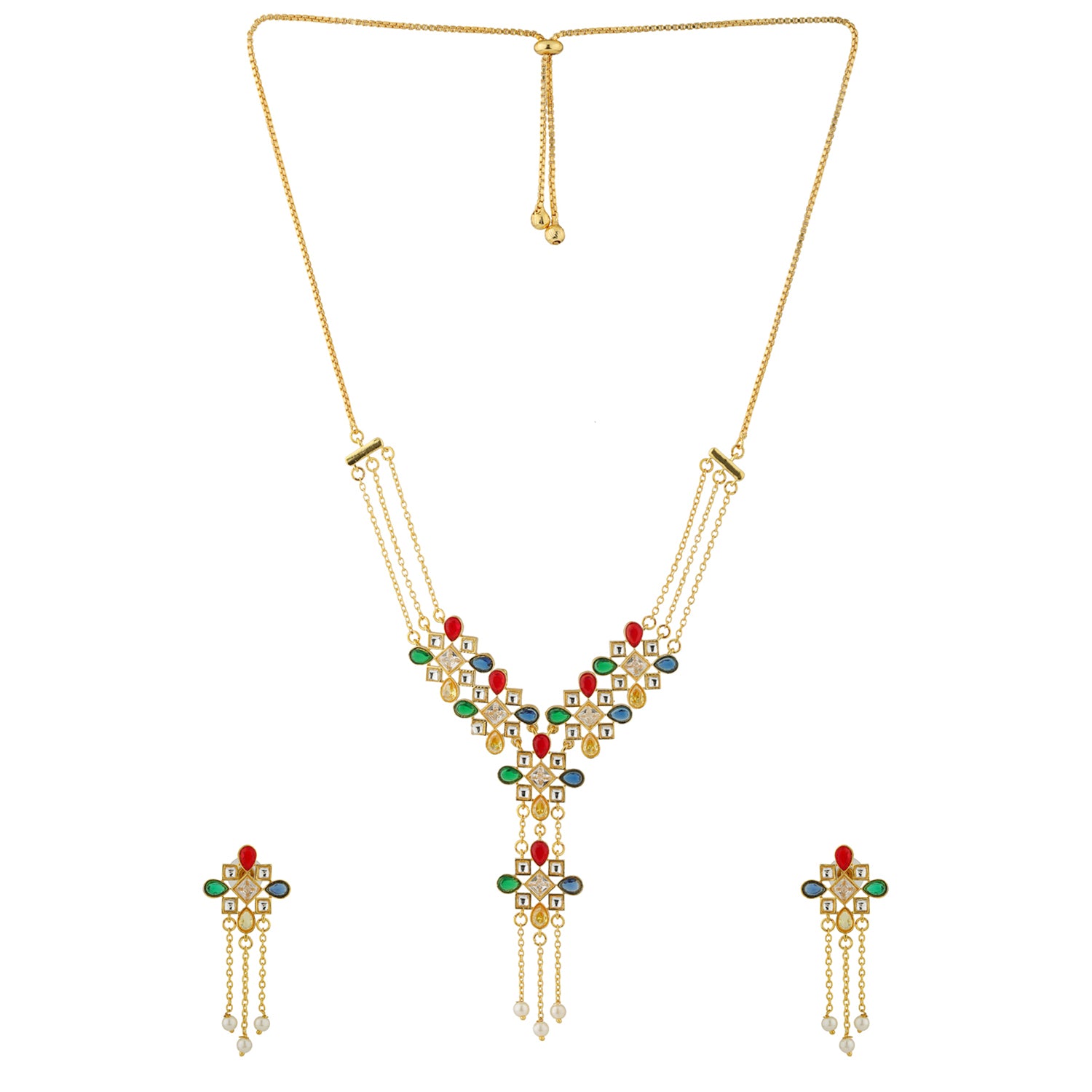 Embody divine balance and radiant charm with the Navratan Eternal Symmetry Short Necklace Set, a breathtaking piece from the Navratan Collection that celebrates harmony, elegance, and the timeless allure of color. Inspired by the sacred geometry of traditional Indian jewelry, this necklace is a perfect blend of spiritual symbolism and modern artistry. Crafted in brass with a rich yellow gold plating, this designer necklace set for women features an exquisite symmetrical Y-design adorned with radiant Navratan stones in deep red, emerald green, sapphire blue, and crystal white. The meticulous arrangement of stones represents balance and grace, while delicate bead hangings and matching earrings add a touch of festive charm. Perfect for weddings, festivals, or pooja ceremonies, this gold necklace set is designed to elevate your look with refined brilliance and vibrant hues, making it an unmissable addition to your jewelry collection.