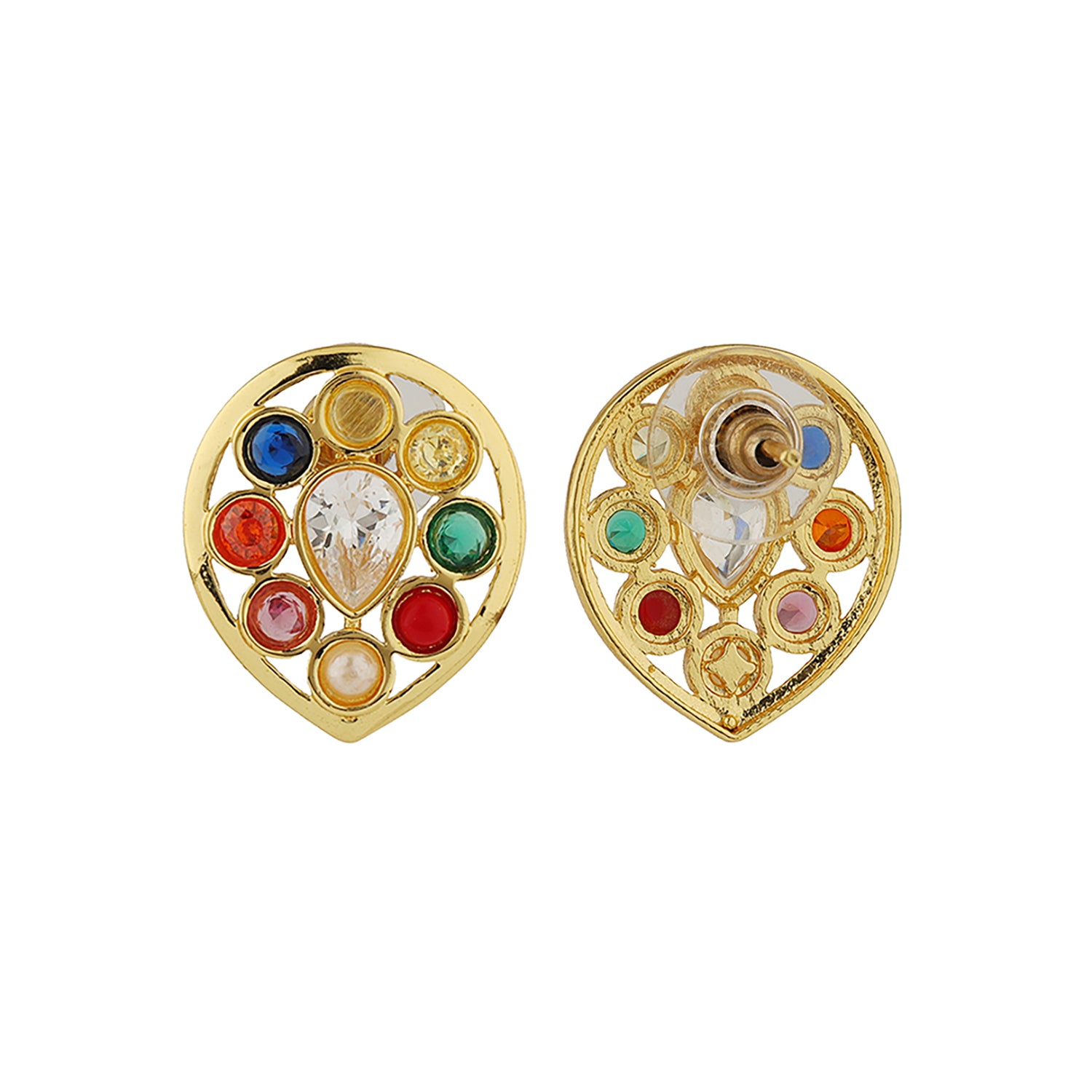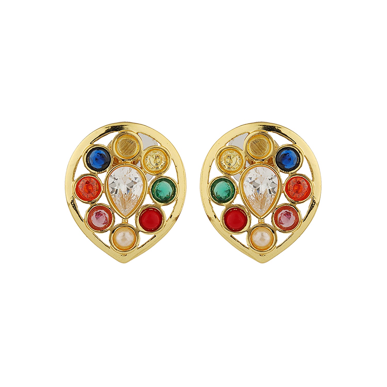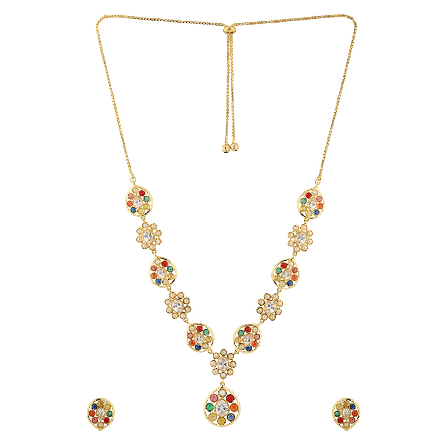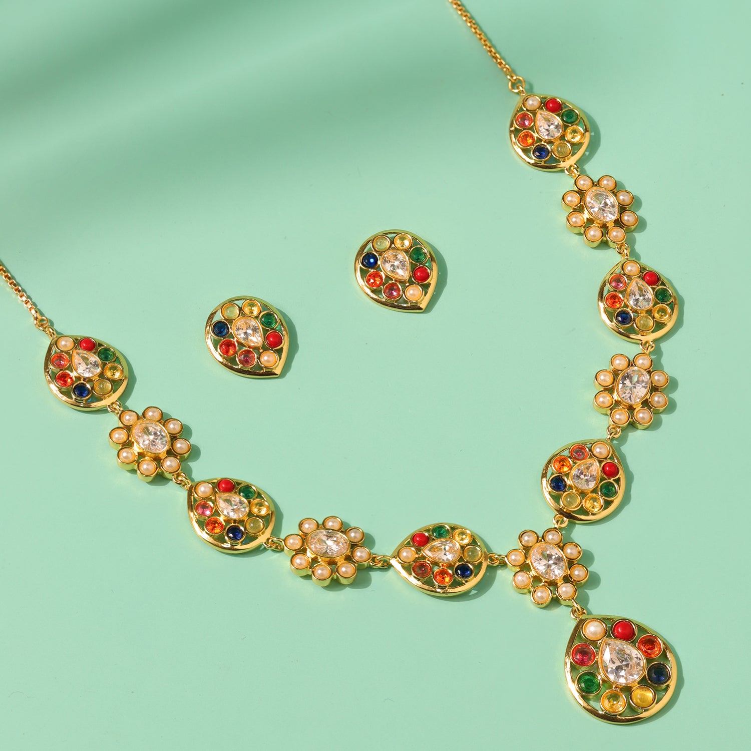 Embrace the timeless beauty of tradition with the Navratan Gem Cascade Short Necklace Set, a radiant creation that captures the essence of grace, balance, and color. Part of the divine Navratan Collection, this exquisite piece draws inspiration from the nine sacred gemstones that symbolize celestial harmony and positivity. Each stone represents strength, prosperity, and protection, coming together in a design that celebrates both culture and modern sophistication. Crafted in brass and finished with a gleaming yellow gold plating, this designer necklace set for women features a stunning arrangement of circular motifs inlaid with multicolored Navratan stones and sparkling kundan accents. The delicate floral detailing adds a touch of femininity, while the compact short-length design sits beautifully at the collarbone for a regal yet comfortable fit. Complementing earrings complete this elegant ensemble, making it perfect for festive occasions and grand celebrations alike. Whether you wear it for wedding functions, festive gatherings, or pooja wear, this gold necklace set adds a vibrant touch of tradition to your look while keeping it effortlessly chic and versatile.