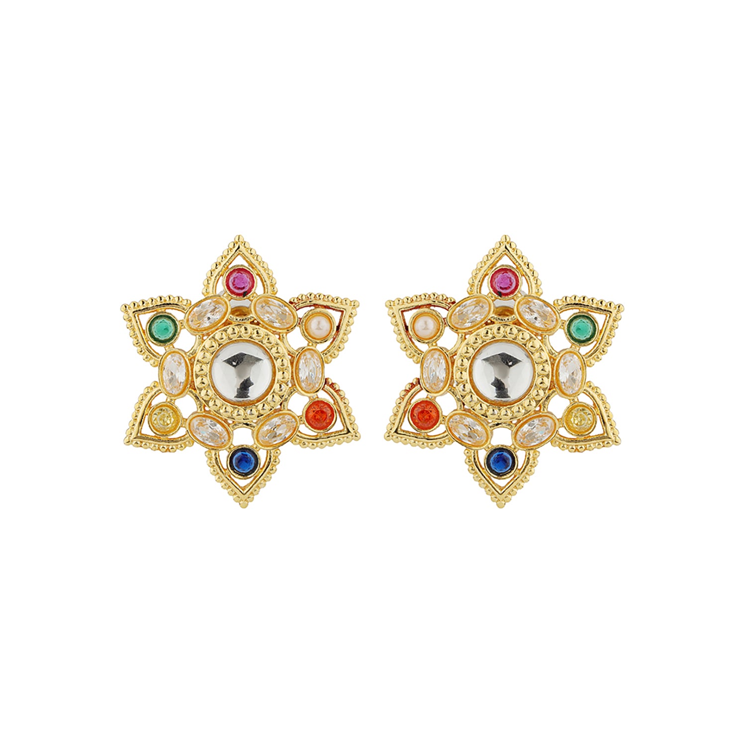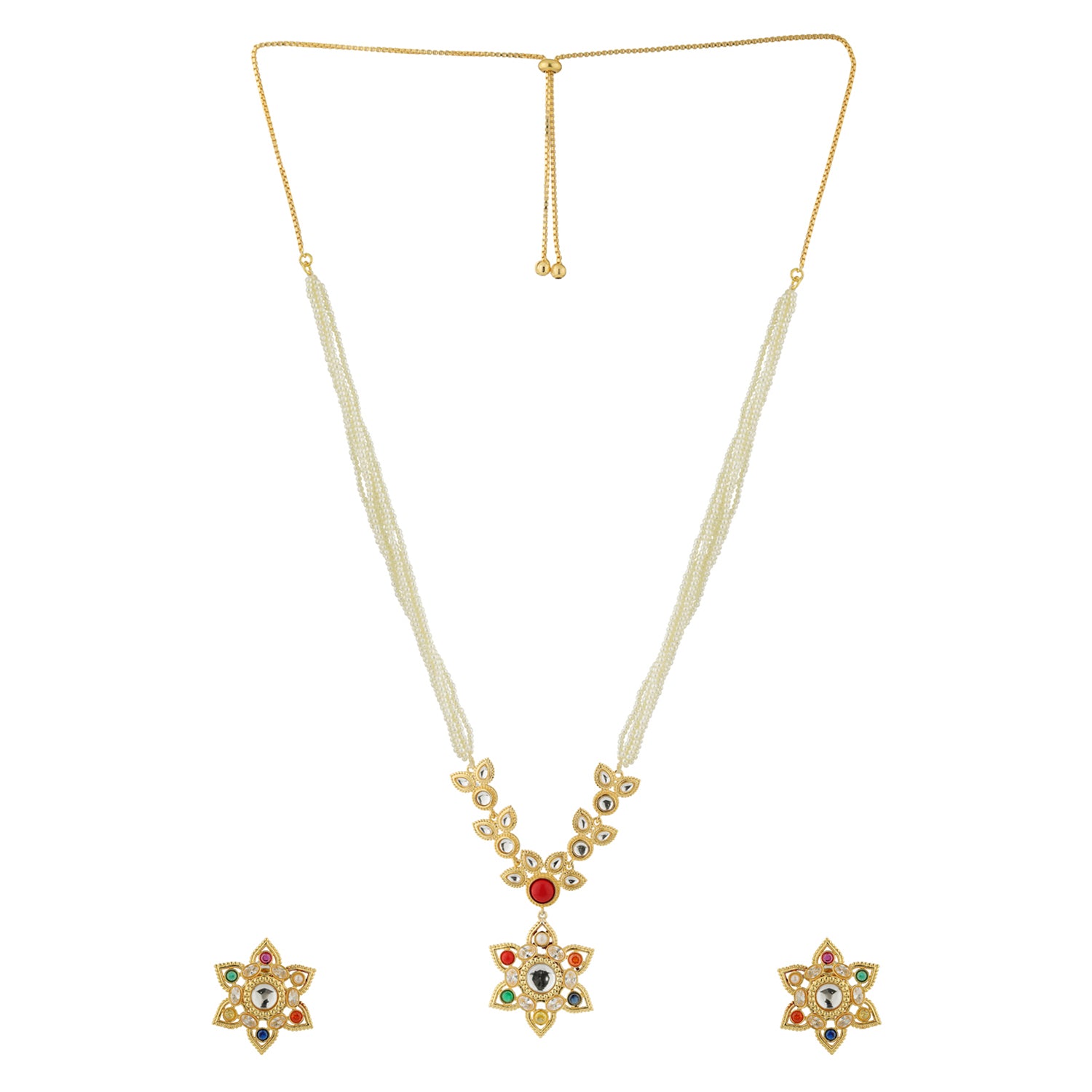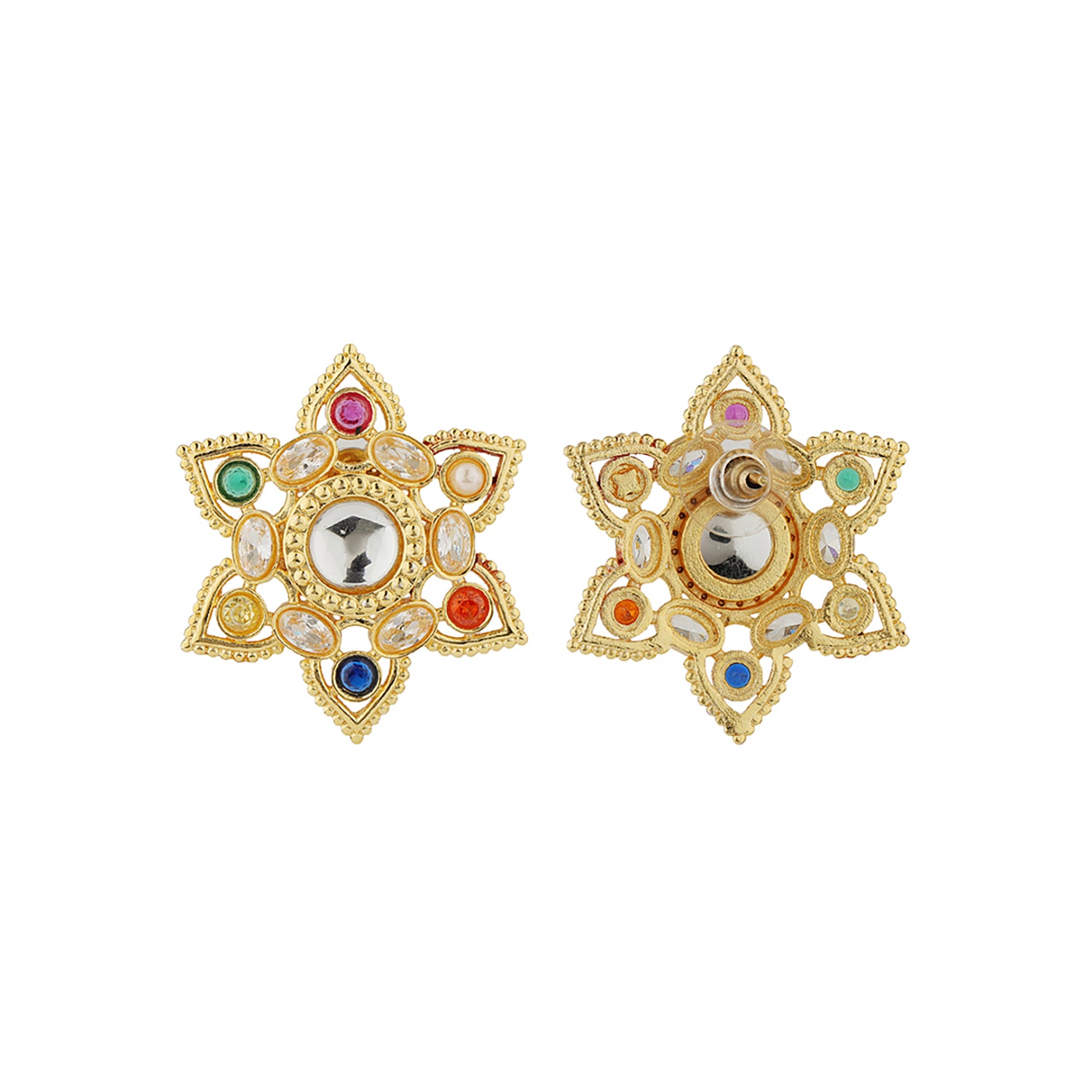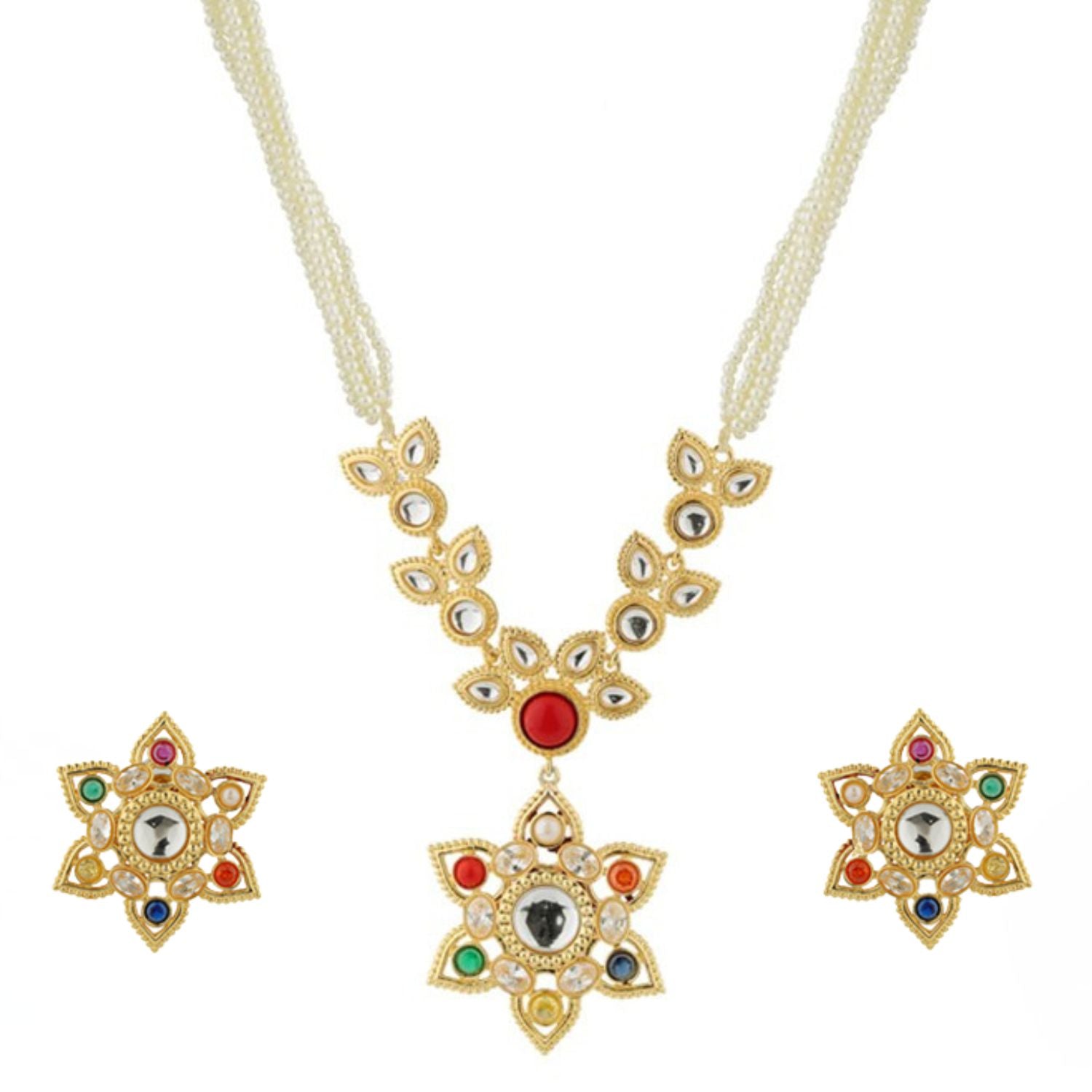 Illuminate your festive look with the Navratan Luminous Collar Necklace Set, a graceful masterpiece that embodies tradition, color, and celestial energy. Inspired by the timeless symbolism of the Navratan - the nine sacred gemstones representing the harmony of the universe, this exquisite creation from the Navratan Collection beautifully unites spirituality with artistry. Crafted in brass and finished with a radiant yellow gold plating, this designer necklace set for women features a luminous star-shaped pendant adorned with nine multicolored gemstones and lustrous kundan accents. The pendant is suspended from a layered strand of delicate pearls, giving it a soft, elegant drape that complements any neckline. Matching earrings complete the set, making it perfect for every special moment. This gold necklace set is an ideal choice for festive wear, pooja wear, or wedding celebrations, adding a touch of divine sophistication to your ensemble. It radiates heritage charm while remaining lightweight and versatile for modern wear. Perfect as a gift for women, this multicolored necklace set is a symbol of prosperity, balance, and elegance, making it a beautiful gift for wife, anniversary gift, or wedding gift that will always be remembered.