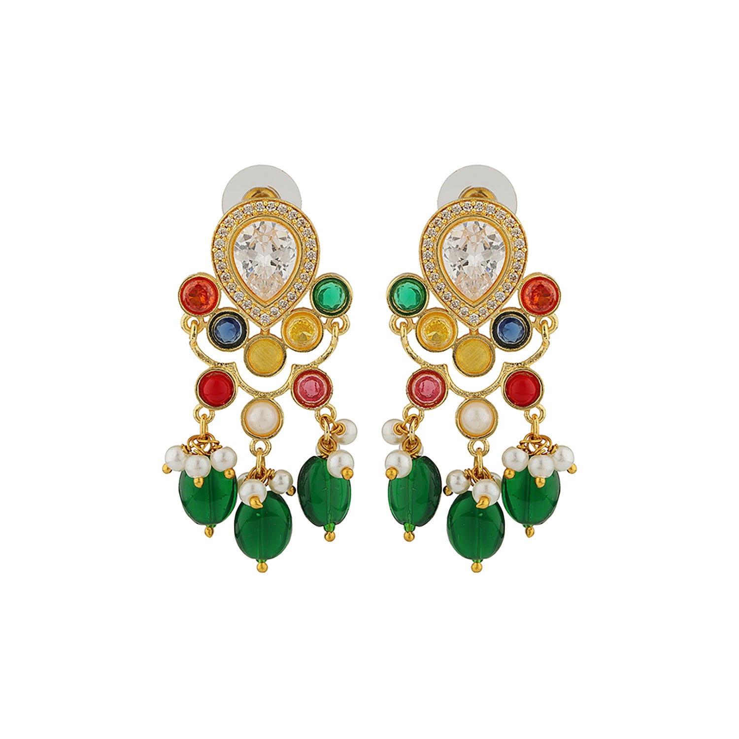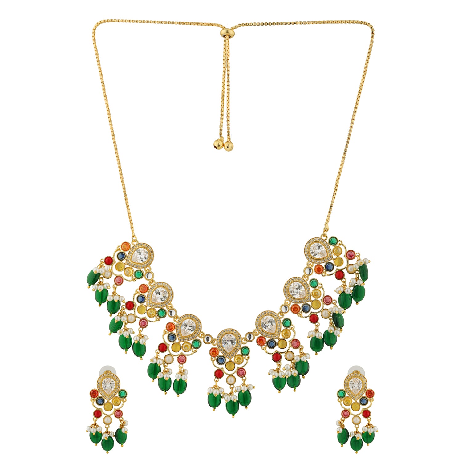 Step into a world of celestial elegance with the Navratan Pear of Divinity Collar Necklace Set, a radiant fusion of divine symbolism and regal craftsmanship. Inspired by the sacred power of the Navratan, the nine auspicious gemstones representing the cosmic balance of the universe, this set from the Navratan Collection beautifully unites heritage design with a touch of modern opulence. Expertly crafted in brass with a luxurious yellow gold plating, this designer necklace set for women features a collar-style design adorned with a stunning arrangement of pear-shaped kundan stones, multicolored Navratan gems, lustrous pearls, and rich green drops. Each element is meticulously placed to create a graceful rhythm of color and shimmer, radiating timeless sophistication and auspicious charm. This gold necklace set comes with matching earrings, completing your look with a harmonious blend of tradition and elegance. Perfect for wedding wear, festive occasions, or pooja ceremonies, it adds a royal glow that enhances both traditional and contemporary outfits. Whether you’re a bride-to-be, celebrating a special milestone, or gifting someone dear, this multicolored necklace set makes for a meaningful and luxurious gift for women, symbolizing prosperity, love, and divine protection.