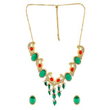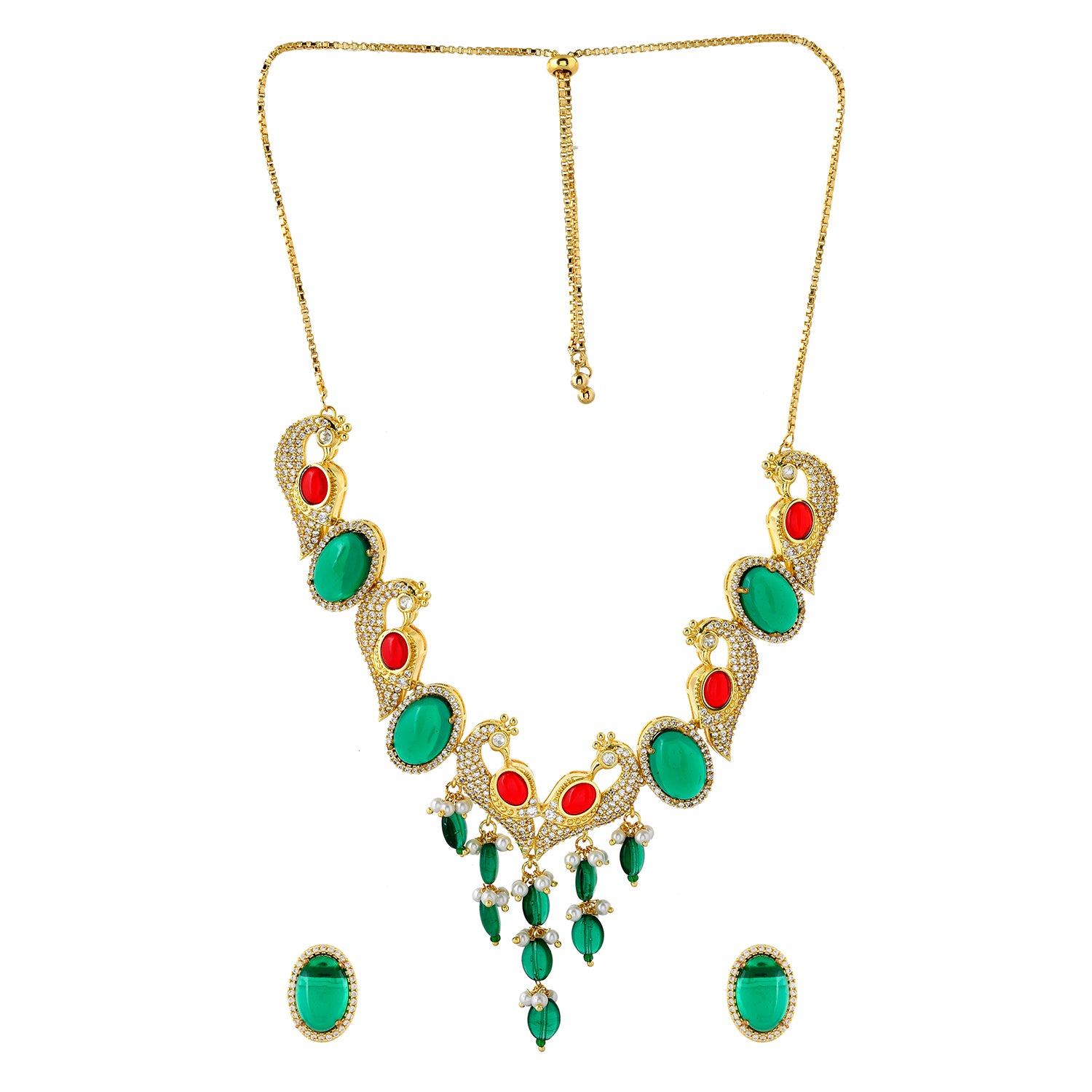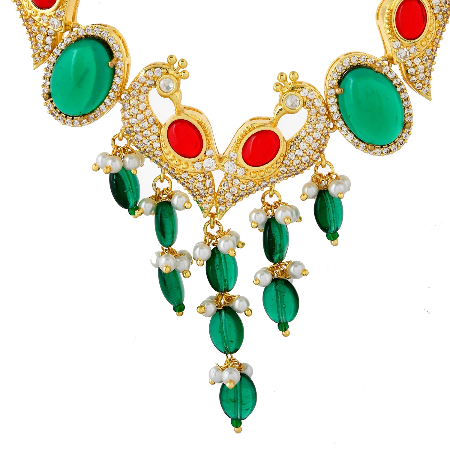The Voylla Mayurika Necklace Set is a stunning piece of jewelry crafted from high-quality brass with a luxurious gold plating, part of the exquisite Panchhi collection. This set features intricate designs inspired by the elegance of nature's most majestic birds, adorned with vibrant green and red stones, and sparkling American Diamond Kundan work. The necklace showcases a beautiful arrangement of peacock motifs, symbolizing harmony and grace, with dangling green beads and pearls adding a touch of sophistication. Perfect for festive occasions, weddings, and parties, this necklace set is an ideal gift for women, whether for Valentine's Day, Diwali, Rakshabandhan, Christmas, New Year, or any special occasion. It makes a thoughtful gift for sisters, lovers, girlfriends, wives, and mothers. Style this versatile piece with traditional attire for a regal look or pair it with contemporary outfits for a chic, festive appearance. The timeless beauty and symbolic design make it a must-have for every bride's trousseau, capturing the essence of love and the sacred union of two souls.