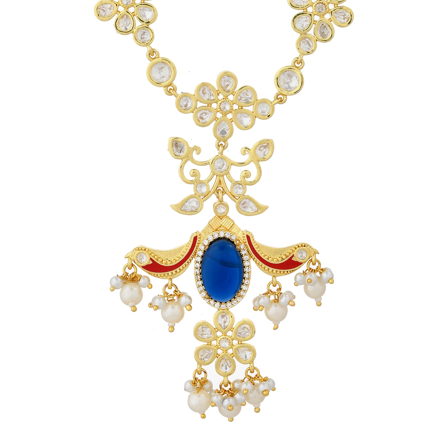 The Voylla Papiha Pendant Set from the Panchhi collection is a spellbinding piece that captures the grace and charm of nature's most beautiful birds, including the delicate sparrow. Crafted from high-quality brass and finished with luxurious gold plating, this women's necklace set features intricate American Diamond Kundan detailing, embodying the timeless elegance of these birds. The delicate floral patterns and striking blue stone accents make it an ideal accessory for festive and wedding wear, from Holi and Diwali to Rakshabandhan and Christmas. This versatile stone necklace set effortlessly enhances traditional outfits and adds a touch of regality to cocktail and New Year parties. Perfect for gifting, it makes a thoughtful present for any woman, whether for a sister, girlfriend, wife, mother, or lover, suitable for occasions like Valentine's Day, Diwali, or Christmas. Inspired by the elegance of nature's most majestic birds, including the sparrow, the Panchhi collection captures the eternal beauty of Kundan, symbolizing harmony and the sacred union of two souls, making this set a cherished addition to any jewelry collection.