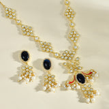 Filigree patterns inspired by classic Arabesque designs adorn this beautiful and dainty necklace set, which has been fashioned out of brass. Embellished with shell pearls and crafted for style and comfort, the necklace and matching drop earrings have been given...