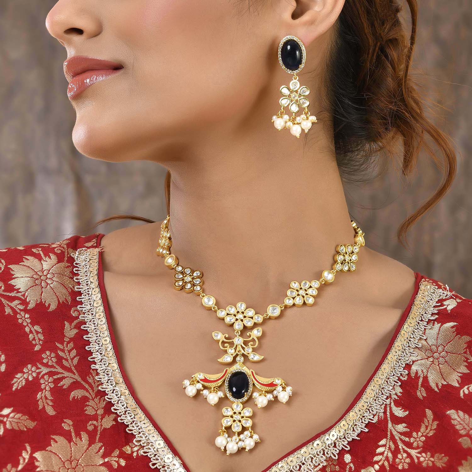 The Voylla Kashni Necklace Set from the Panchhi collection is an exquisite piece crafted from high-quality brass and plated with gold, offering a touch of opulence. This American Diamond Kundan gold necklace set for women features intricate designs inspired by...