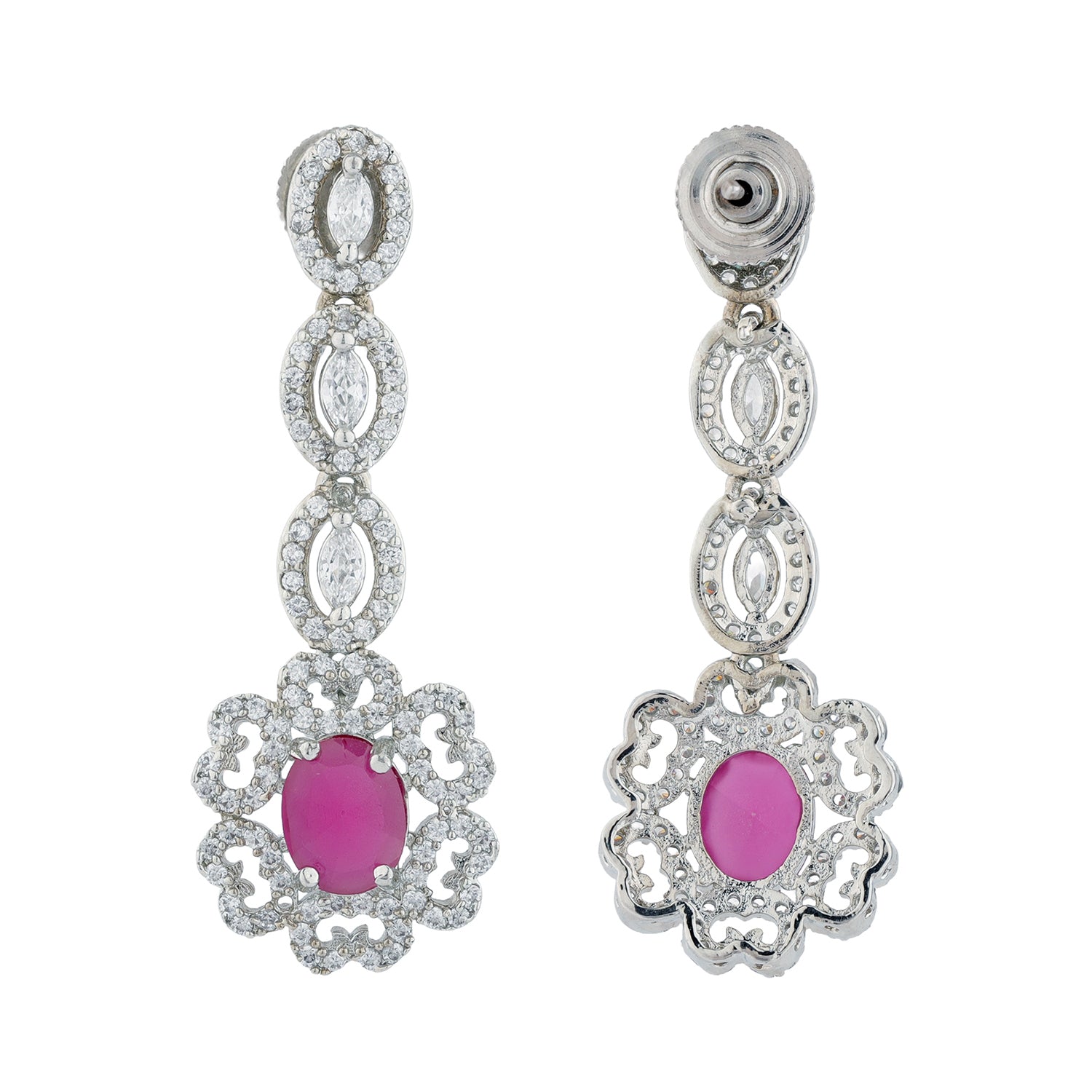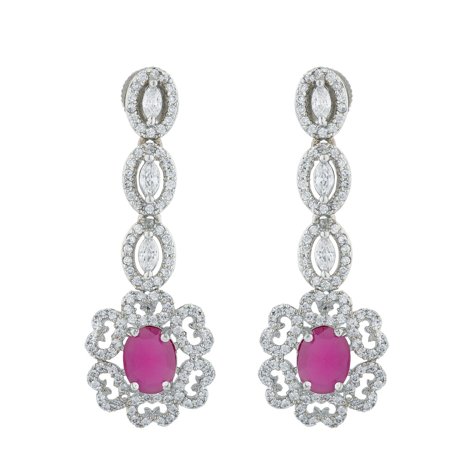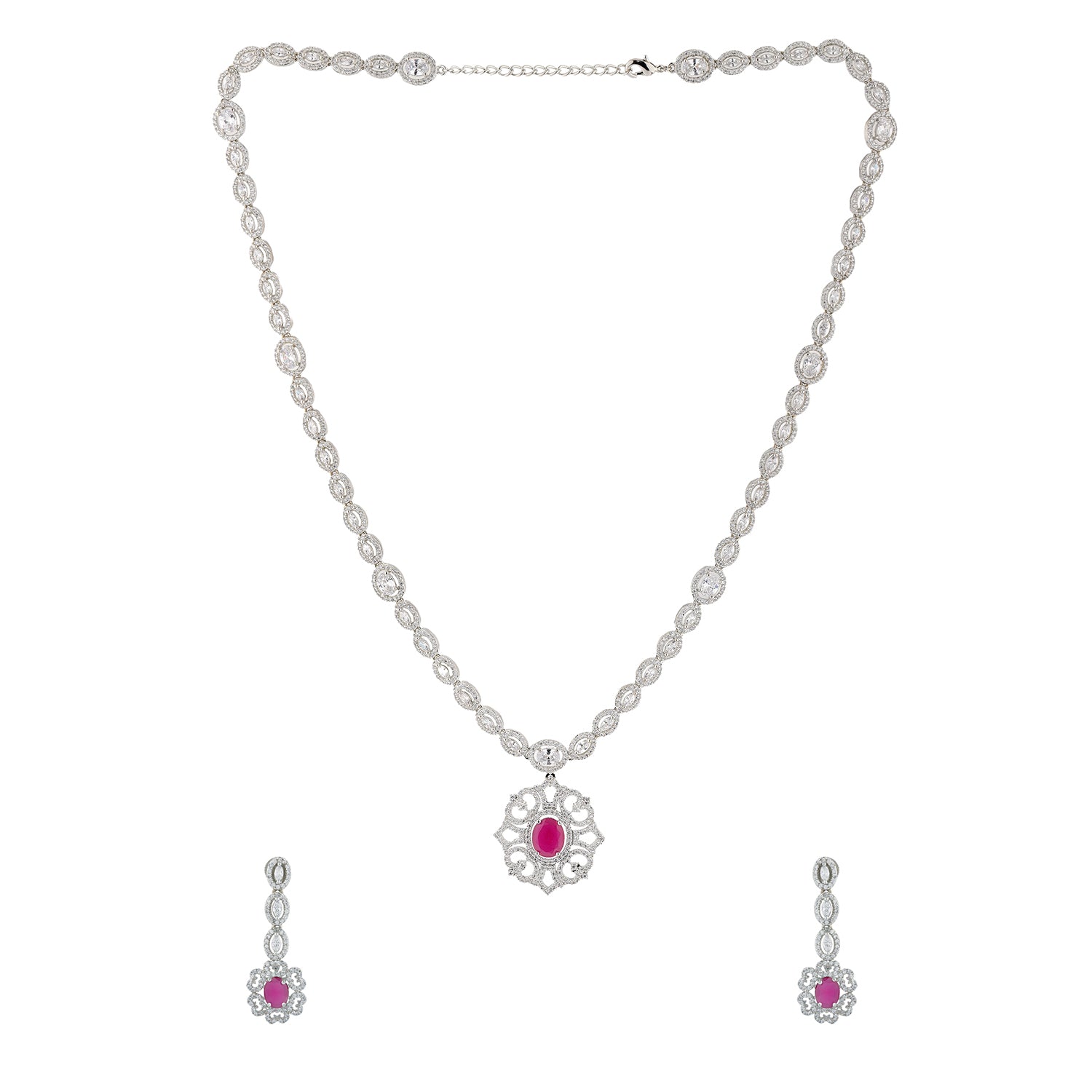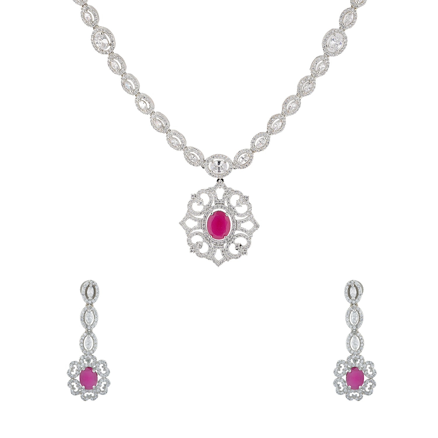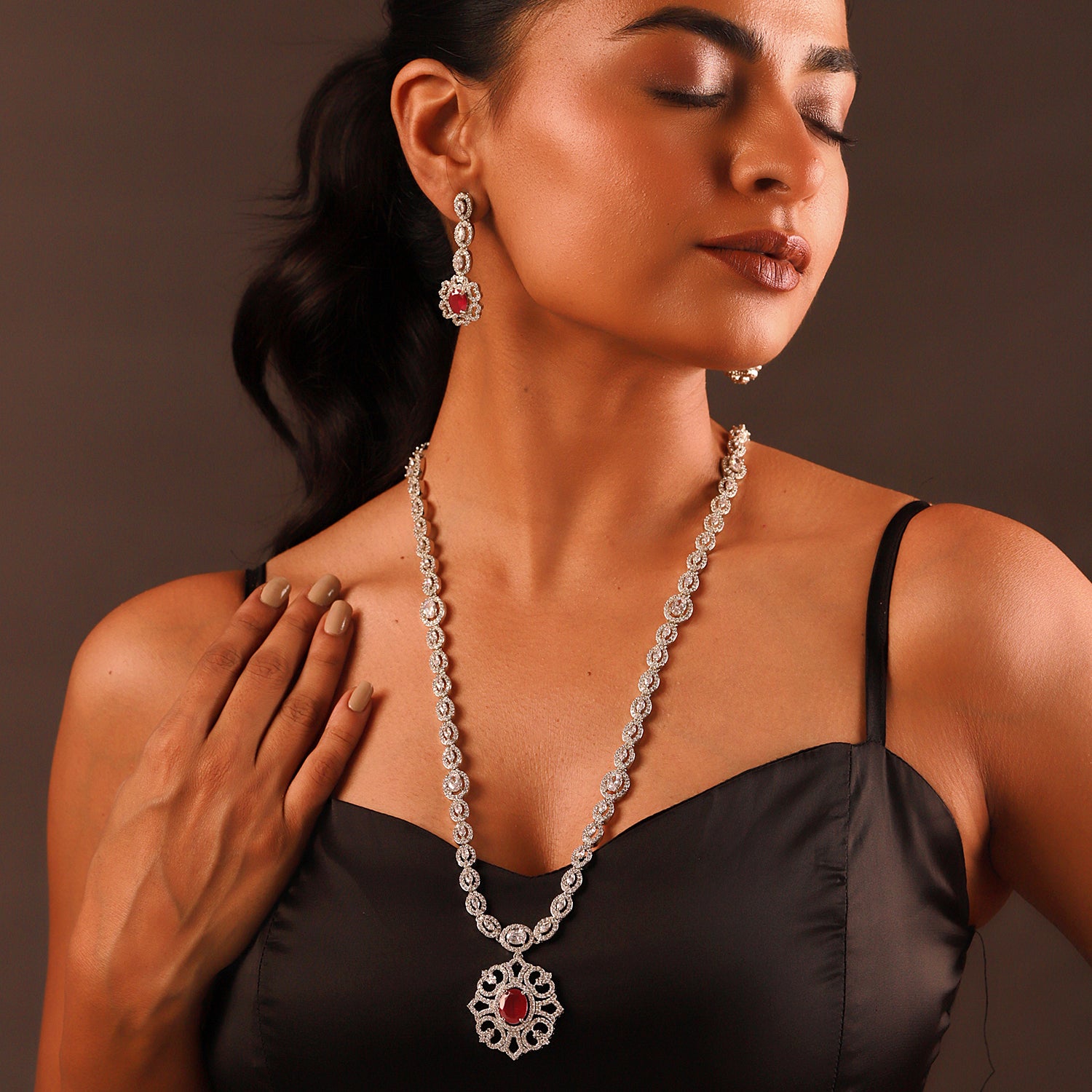 Step into a world of refined luxury with the Sparkling Elegance Collection, introducing the enchanting Ruby Radiance CZ Necklace Set for women. Crafted from high-quality brass and finished in shimmering white rhodium plating, this stunning jewelry set radiates timeless beauty. The necklace features intricate oval links, each encrusted with sparkling American diamonds, leading to a captivating centerpiece adorned with a rich ruby-red stone framed by ornate detailing. The matching earrings echo the same sophisticated charm, making this set an instant classic. Perfect for weddings, festive occasions, and elegant evenings, the Ruby Radiance Necklace Set embodies both royal grandeur and modern sophistication. A perfect blend of passion and poise, this designer Necklace set is ideal as a gift for wife, gift for girlfriend, or gift for women who adore statement jewelry that reflects elegance and grace.