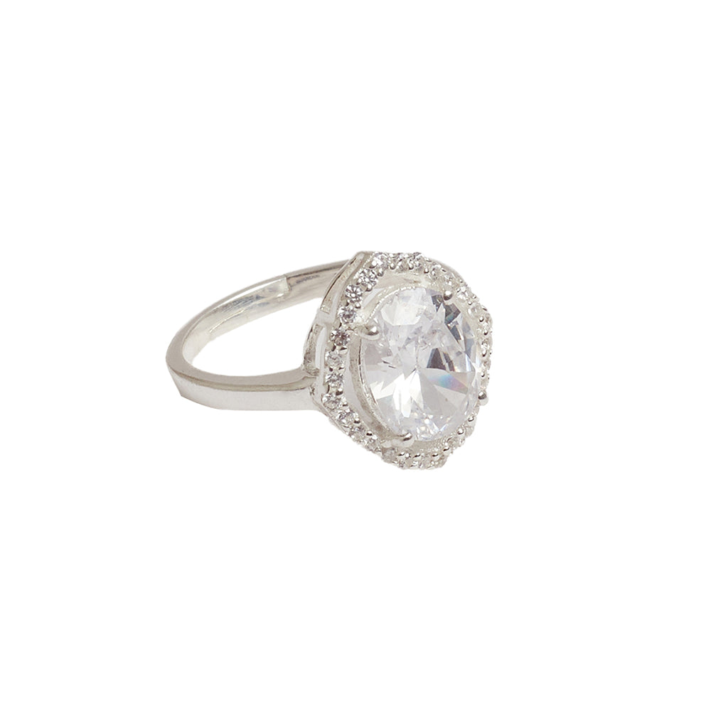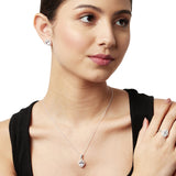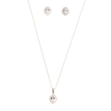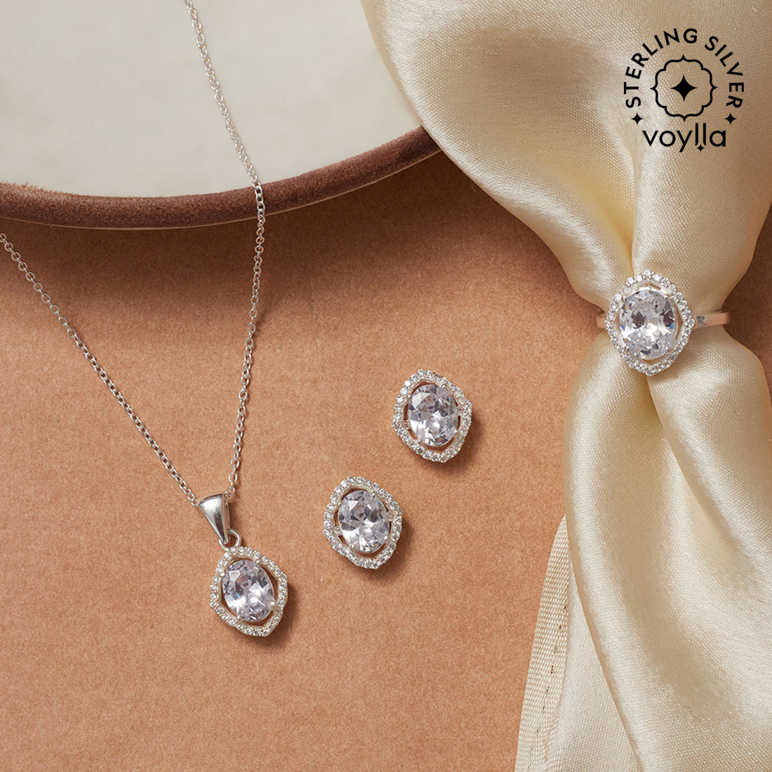 This Zirconia Solitaire Sterling Silver Pendant, Earring and Ring set offers simplified dainty sophistication in a refined oval cut design. This beautiful pendant set consists of a large central stone, surrounded by american diamonds to create the cluster, and a fine rope chain.