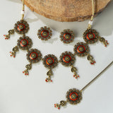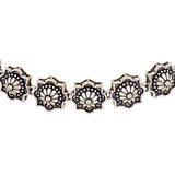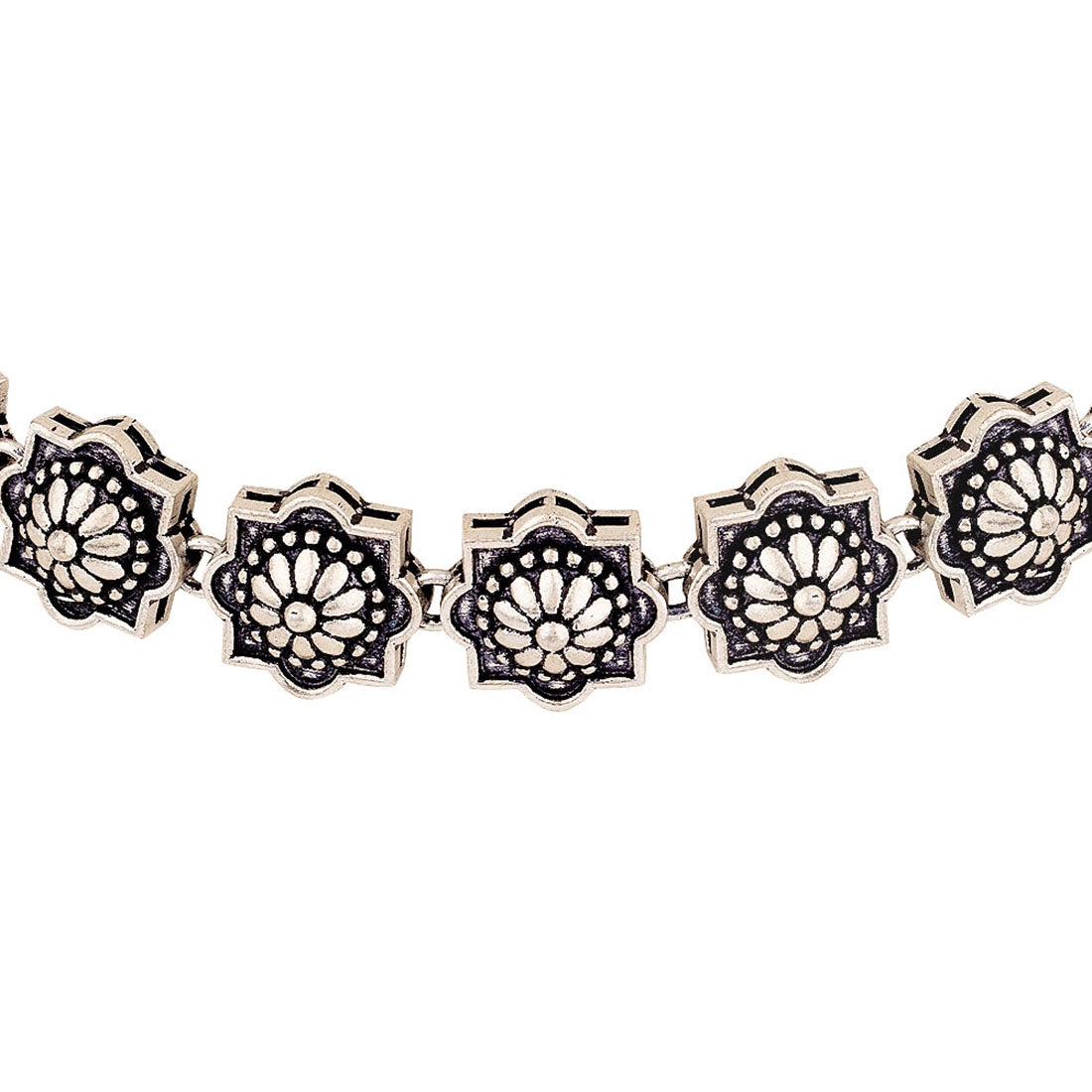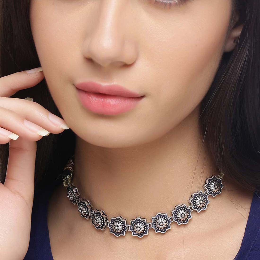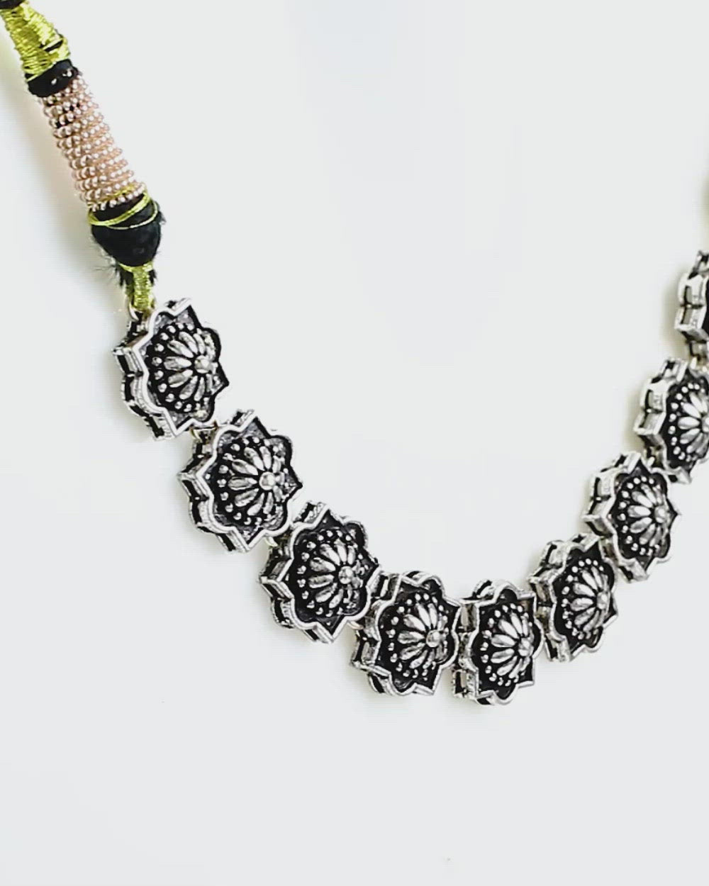 Looping design necklace made from brass. Oxidized silver plated and a good match for Indo-Western looks. This piece of jewelry comes with the Voylla assurance of quality and durability.
