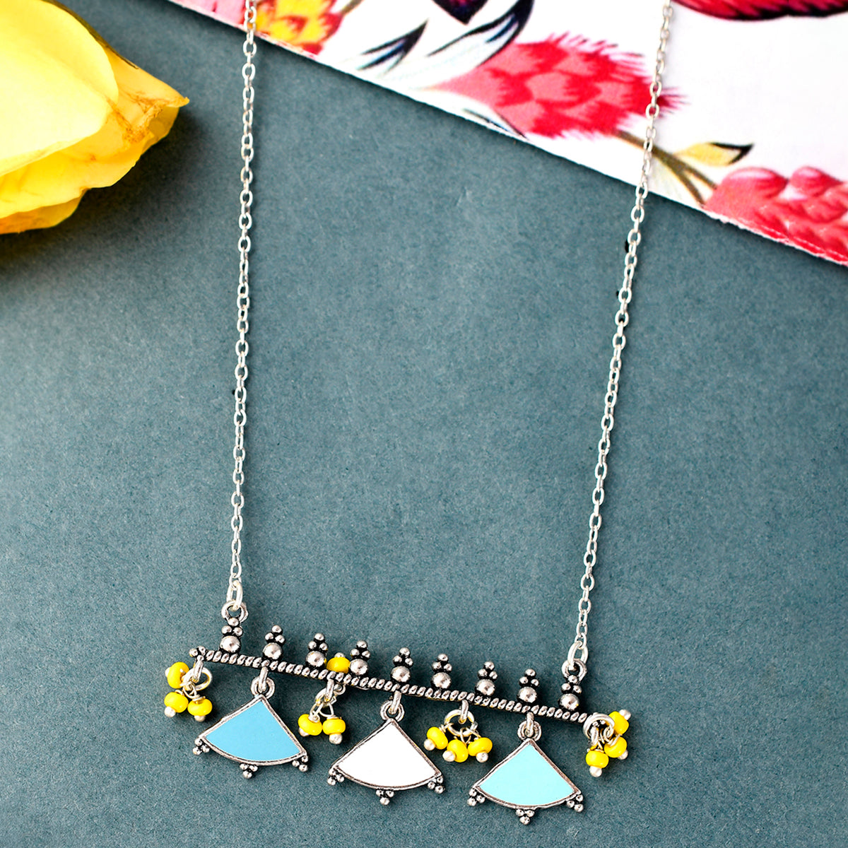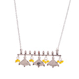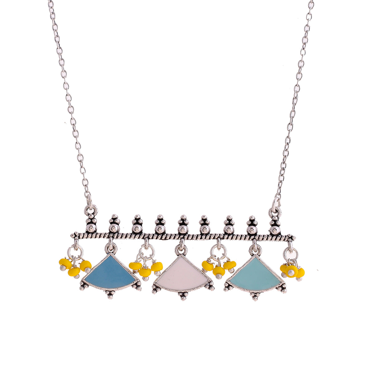 Lightly embellished brass pendant inspired by the art of block printing. Wear the silver plated pendant with ethnic attire.