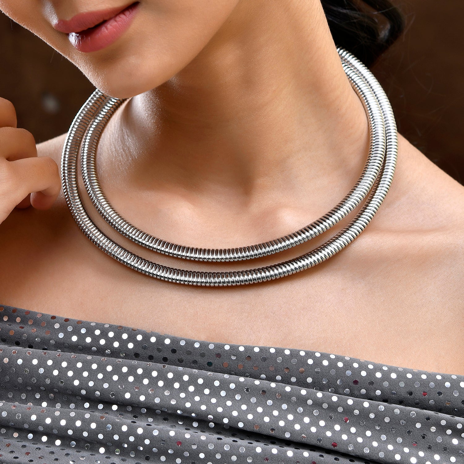 The Mystic Moonlight Layered Hasli Necklace is a captivating piece from the Timeless Sparkle collection, meticulously crafted from high-quality brass and plated with white rhodium for a lasting shine. This statement necklace features a unique layered Hasli design that exudes sophistication and elegance, making it perfect for party wear, weddings, festive occasions, or even daily wear. Its versatile style seamlessly pairs with both western and traditional attire, offering endless styling possibilities. The lustrous white rhodium plating adds a touch of modernity, ensuring it complements any outfit. Whether as a Valentine’s Day gift, Diwali present, or a thoughtful gesture for Rakshabandhan, Christmas, or New Year, this designer necklace is an ideal gift for women, including your sister, girlfriend, wife, or mother. With its timeless charm and trendy appeal, the Mystic Moonlight Layered Hasli Necklace is a must-have for any jewelry collection.