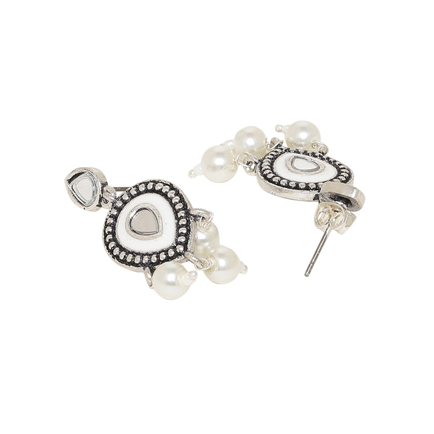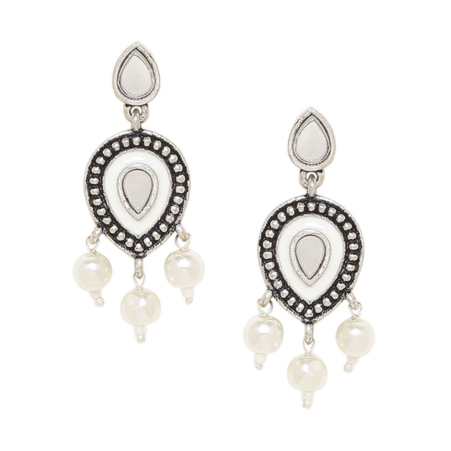 Leaf drop earrings fashioned out of brass and inspired by the grace and beauty of Sheesh Mahal. Mirror detailing and faux pearl embellishments give this oxidized silver plated pair a delicate touch. Pair with casual ethnic and Indo-Western attire. This piece of jewelry comes with the Voylla assurance of quality and durability.