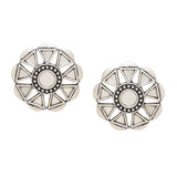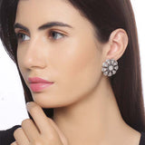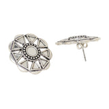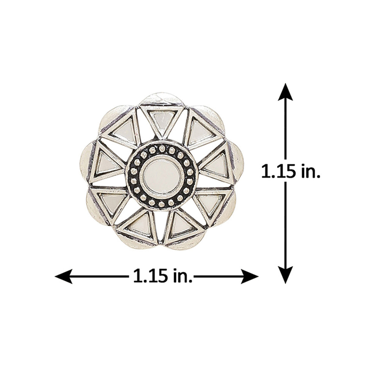 Inspired by the grace and beauty of the Sheesh Mahal, these looping triangles stud earrings have been fashioned out of brass. Oxidized silver plated and adorned with mirror detailing, the stud are a perfect match for casual summer kurtas. This piece of jewelry comes with the Voylla assurance of quality and durability.