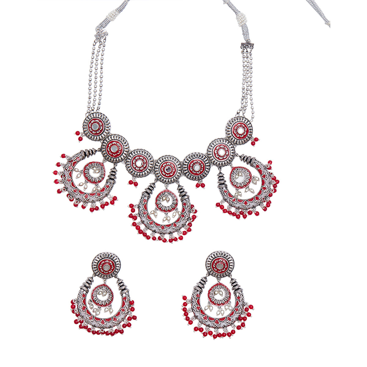 Brass jewellery set, embellished with faux pearls, mirror details and orange enamel. The necklace and drop earrings have been given a charming silver plating that adds to their old-school look. Wear the set with your favourite saree, ethnic skirt or Indo-Western gown.