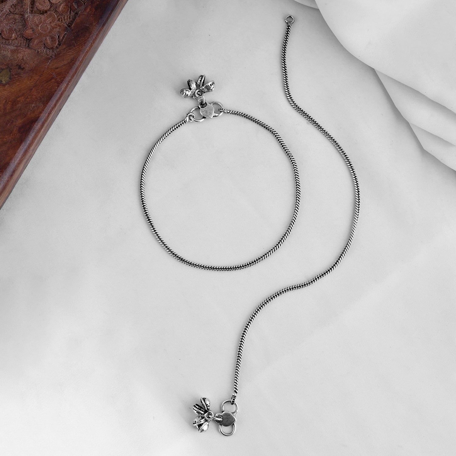Step into a world of timeless elegance with the Mehfil Mystique Oxidised Anklet Set. Crafted from high-quality brass and plated with a silver oxidised finish, these payal bring a captivating blend of tradition and contemporary charm. Featuring delicate ghungroo embellishments, they are part of the exquisite Antique Essentials collection. Whether you're dressing up for a wedding, pooja, or everyday wear, these anklets are versatile and stylish. The neutral silver hue effortlessly complements both ethnic and western outfits, making them a must-have accessory. Perfect as a Valentine's Day gift, Diwali present, or a thoughtful surprise for your mother, sister, girlfriend, or wife, these anklets will add a touch of mystique and elegance to any ensemble. These anklets, or payals, are perfect for adding a touch of elegance to any outfit.