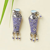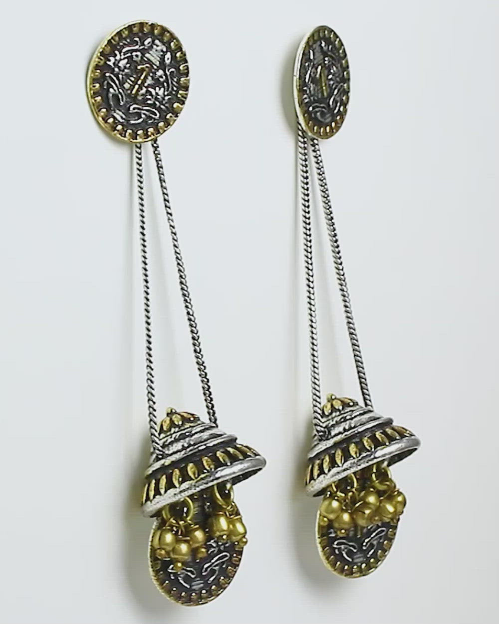 Dangling Earrings with antique design in tear drop shape. The drop pattern of the earrings is lined by ghungroos. The two tone polish will make the shine last longer. Good to wear at any formal or semi formal gathering.