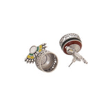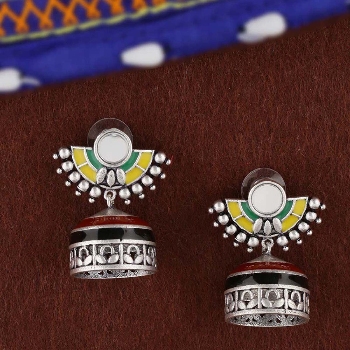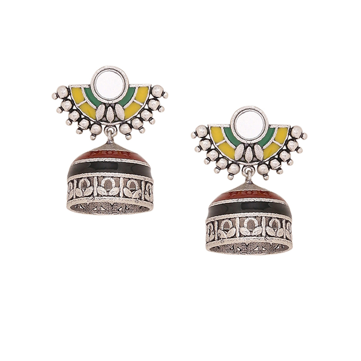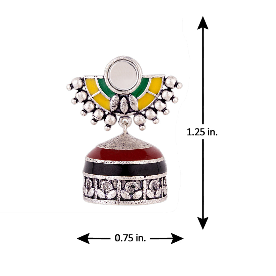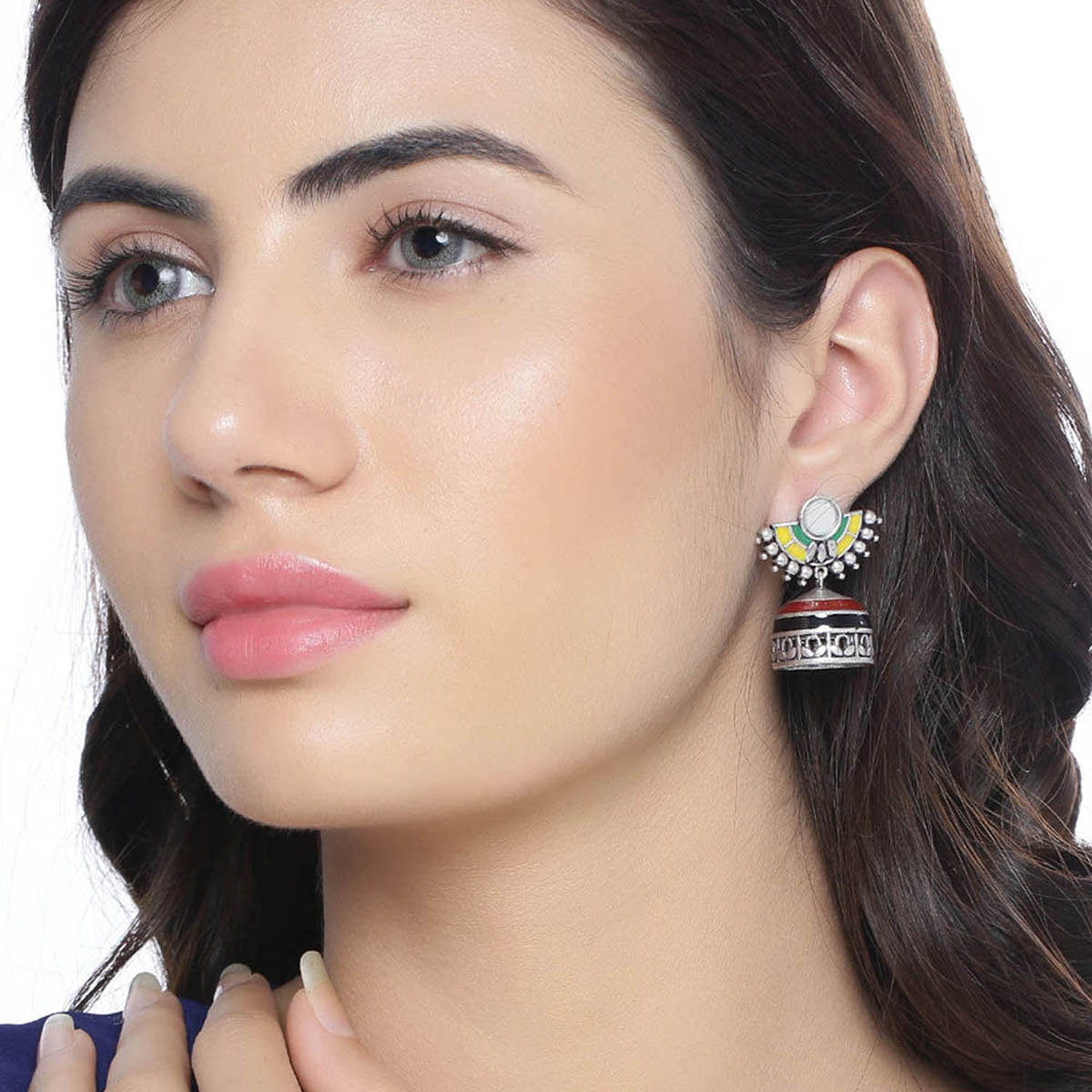 The timeless and classic art of Rabaari embroidery has inspired these half moon drop earrings, which have been crafted from brass. Oxidized silver plated and enameled, the mirrored pair will look splendid when paired with an ethnic skirt or summer dress.