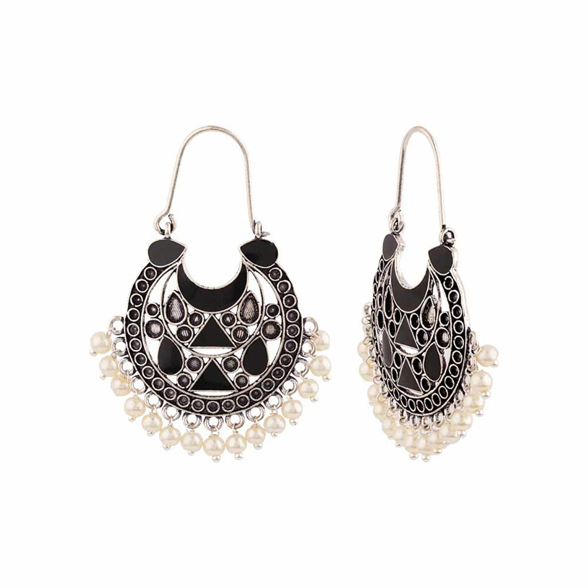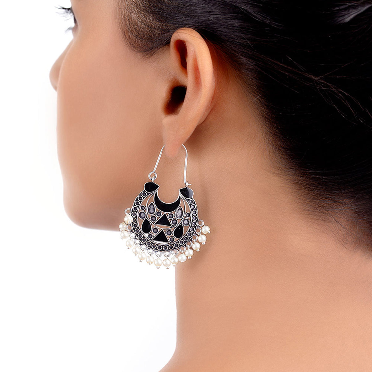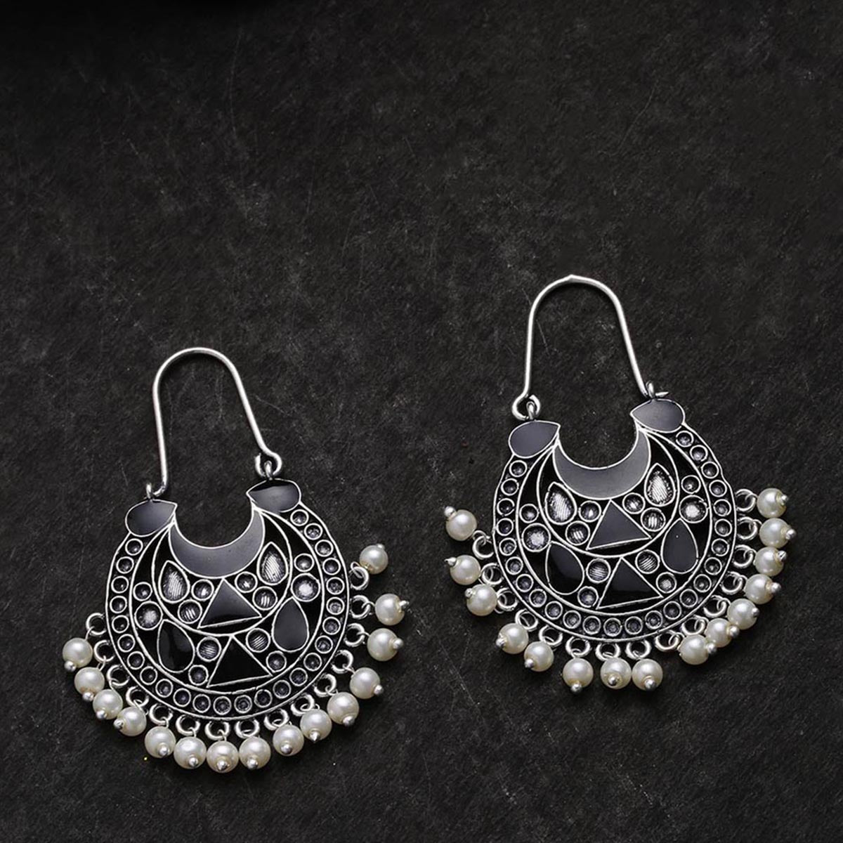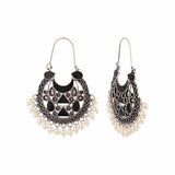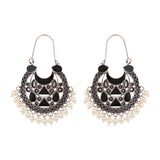 Embellished with faux pearls, the oxidized silver plated earrings have been crafted from brass. Wear with ethnic outfits.