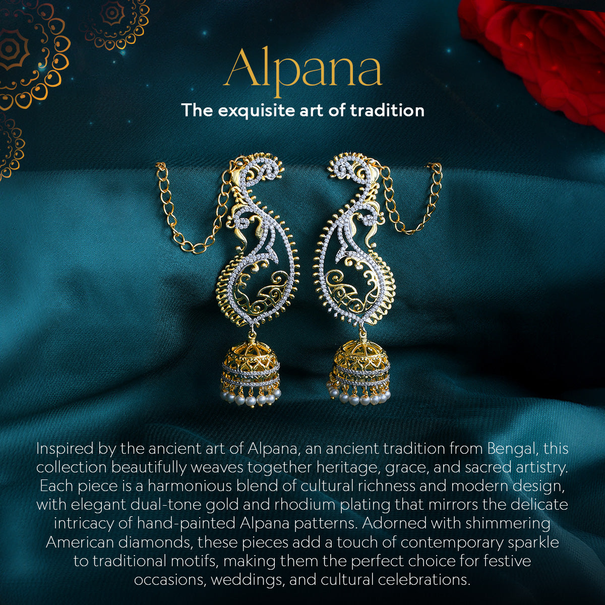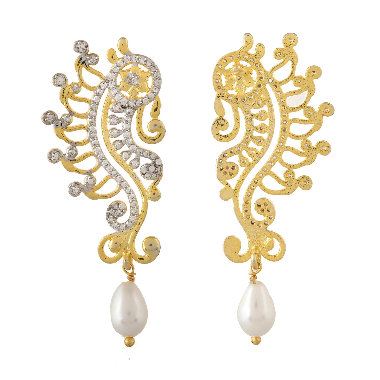 Elevate your style with the Alpana Elegant Paisley Pearl Drop Earrings, a masterpiece from Voylla's Alpana Collection. This exquisite pair of drop earrings features an intricate paisley pattern, crafted in a dual-tone plating of gold and rhodium, with American diamonds (CZ) creating a sparkling, luxurious appearance. The earrings are adorned with a lustrous, teardrop-shaped pearl at the bottom, adding a touch of elegance. This stylish pair is perfect for women aged 20+ who appreciate authentic, yet contemporary style, making it an excellent gift for wives, mothers, friends, and loved ones on special occasions like Diwali, Puja, Rakhi, and Rakshabandhan.