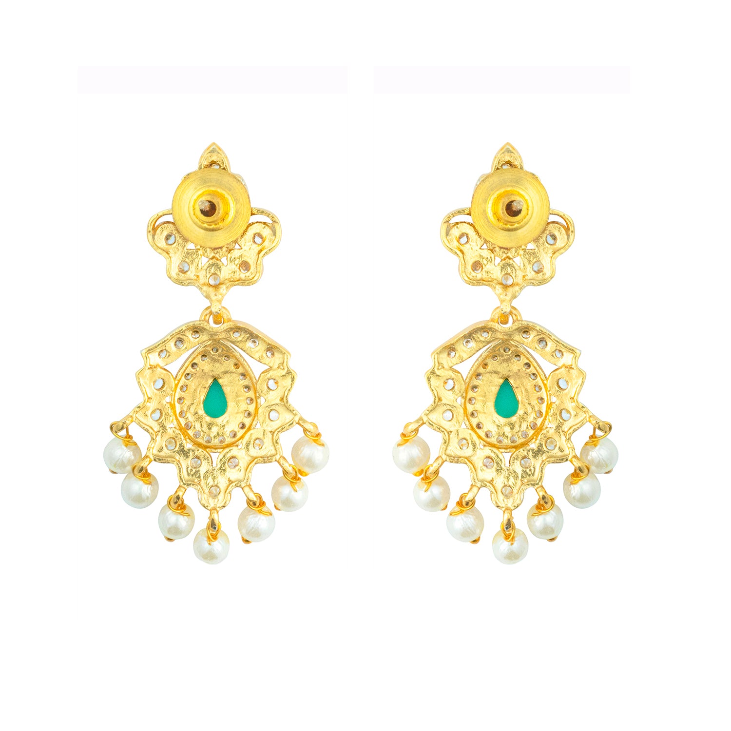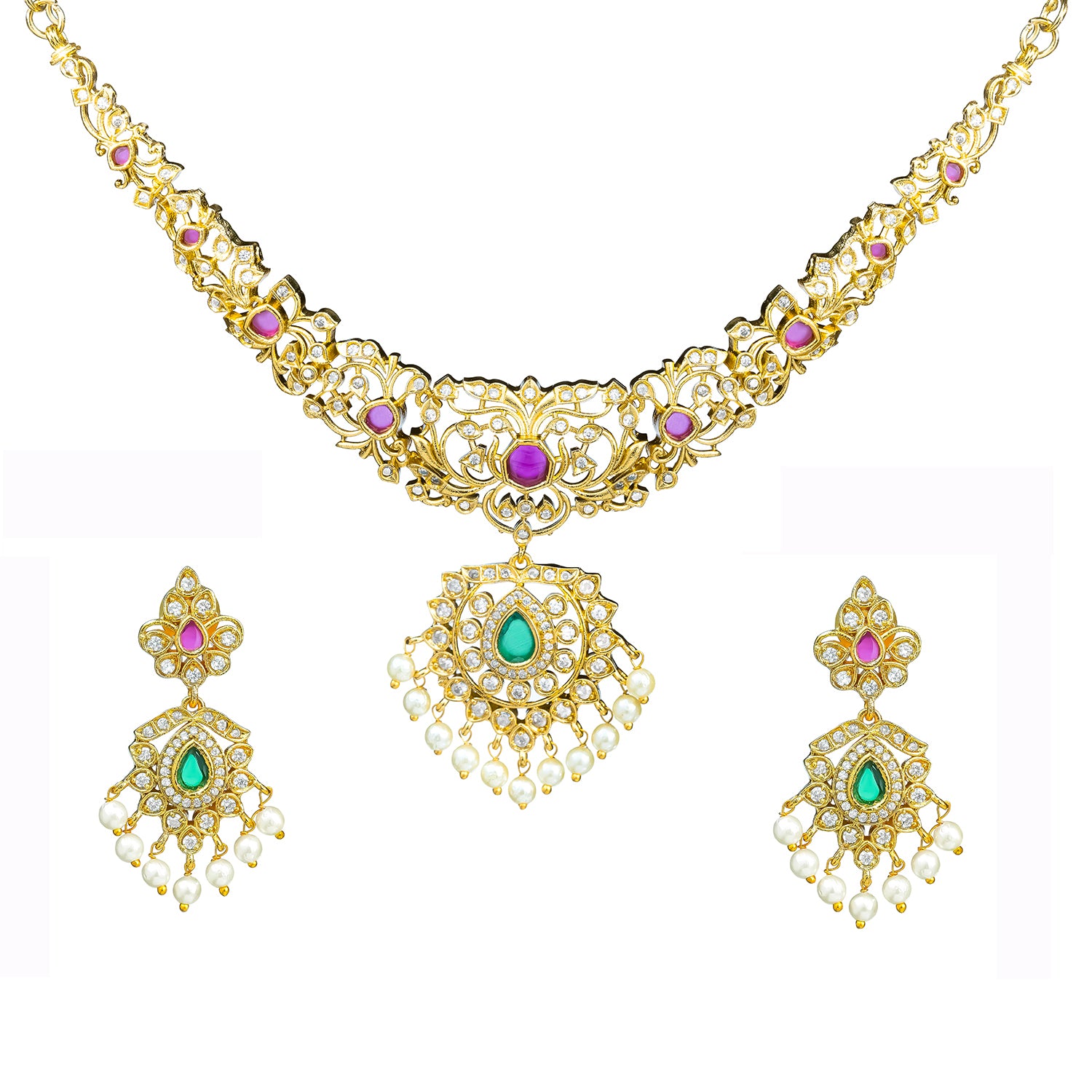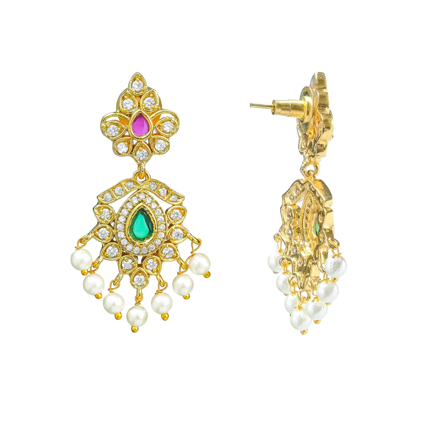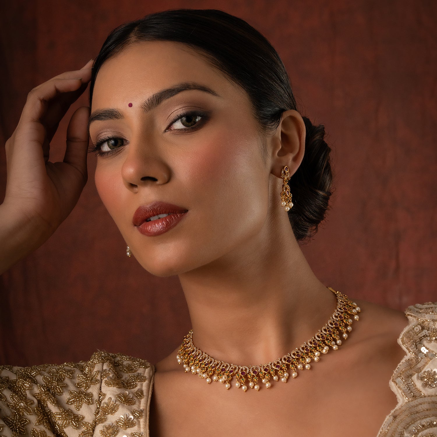 Introducing the Gold Elegance Padmashree Temple Pearl Necklace Set, a breathtaking women necklace set crafted to capture the grandeur of traditional Indian artistry. Part of the luxurious Gold Elegance Collection, this exquisite piece blends South Indian temple-inspired motifs with modern CZ detailing, creating a timeless accessory for every special occasion. The necklace features intricate floral and paisley filigree work adorned with CZ American Diamonds, ruby-toned stones, and a striking emerald centerpiece. The drop pendant is framed with luminous pearl beads, adding a graceful, royal finish. Matching earrings mirror the same stunning detailing, offering a complete traditional look. Crafted from premium brass and coated with rich yellow gold plating, this set delivers exceptional shine, durability, and elegance. Perfect for weddings, festive celebrations, pooja rituals, and temple visits, this traditional necklace set pairs beautifully with sarees, lehengas, Anarkalis, and South Indian silk drapes. Whether you're a bride, wedding guest, or someone who loves classic heritage jewellery, this set makes a striking statement. It also makes a heartfelt gift for women, ideal for your lover, wife, mother, sister, or friend.