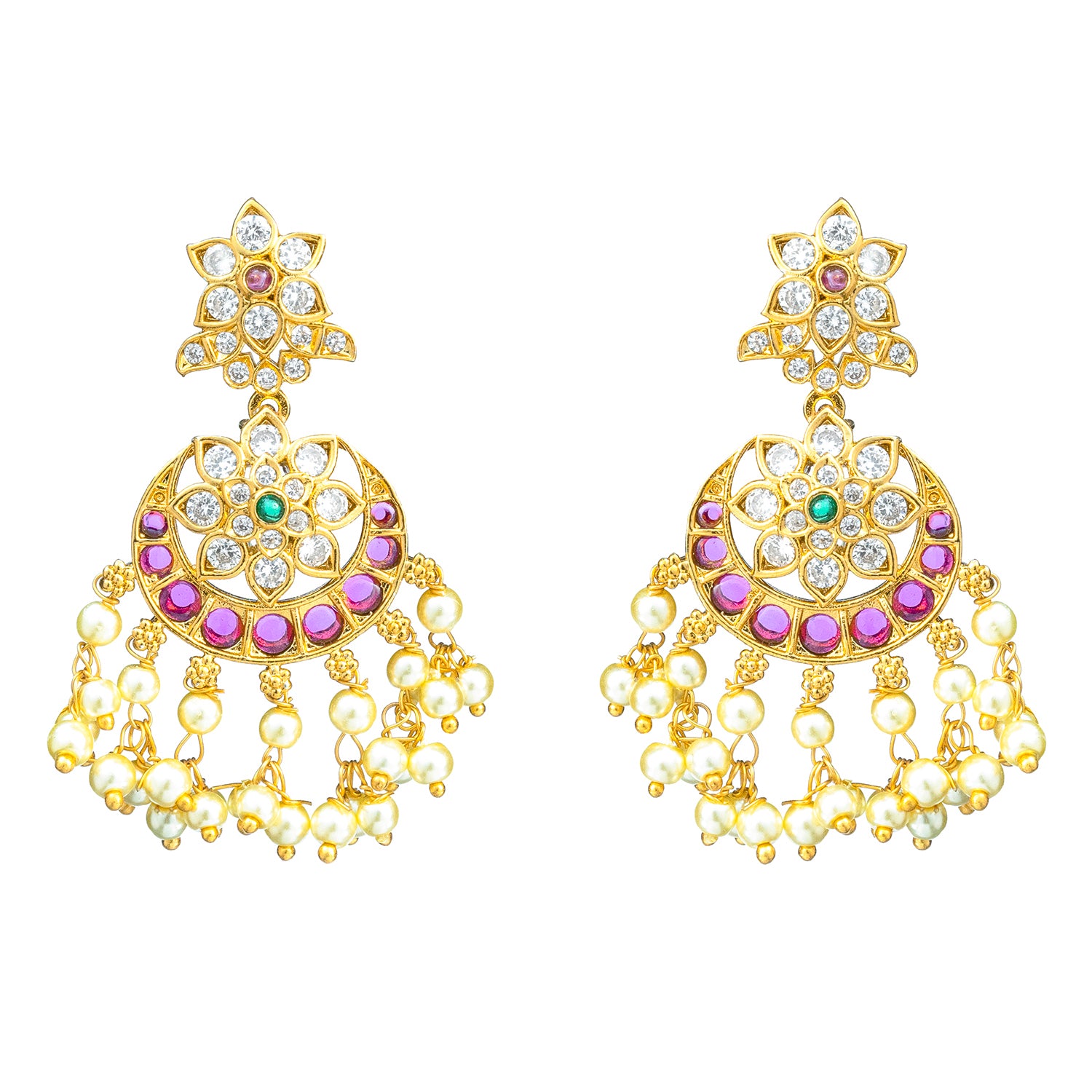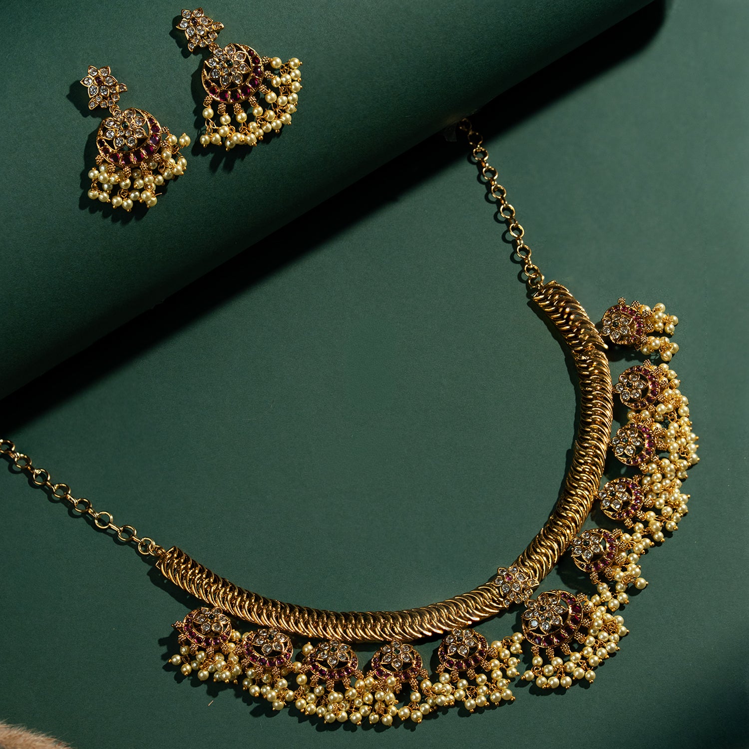 The Majestic Pearl Cluster Necklace Set from our Gold Opulence Collection embodies royal heritage and refined craftsmanship. Made from high-quality brass and coated with radiant yellow gold plating, this exquisite women necklace set features intricate floral-style motifs accented with pearl clusters that flow along the neckline, creating an elegant and traditional aura. The design’s golden tone paired with pearl drops and ruby-tinted detailing gives the piece a luxurious, sophisticated look that complements ethnic attire beautifully. It includes matching earrings that echo the same regal craftsmanship, completing a cohesive and graceful traditional necklace set for special occasions. Perfect for pairing with sarees, Kanjeevaram silks, traditional lehengas, and festive outfits, this jewellery set is ideal for weddings, cultural celebrations, pooja functions, seasonal festivals, and ceremonial gatherings. This piece is not only visually striking but also durable, comfortable, and ready to become a treasured part of your jewellery collection.