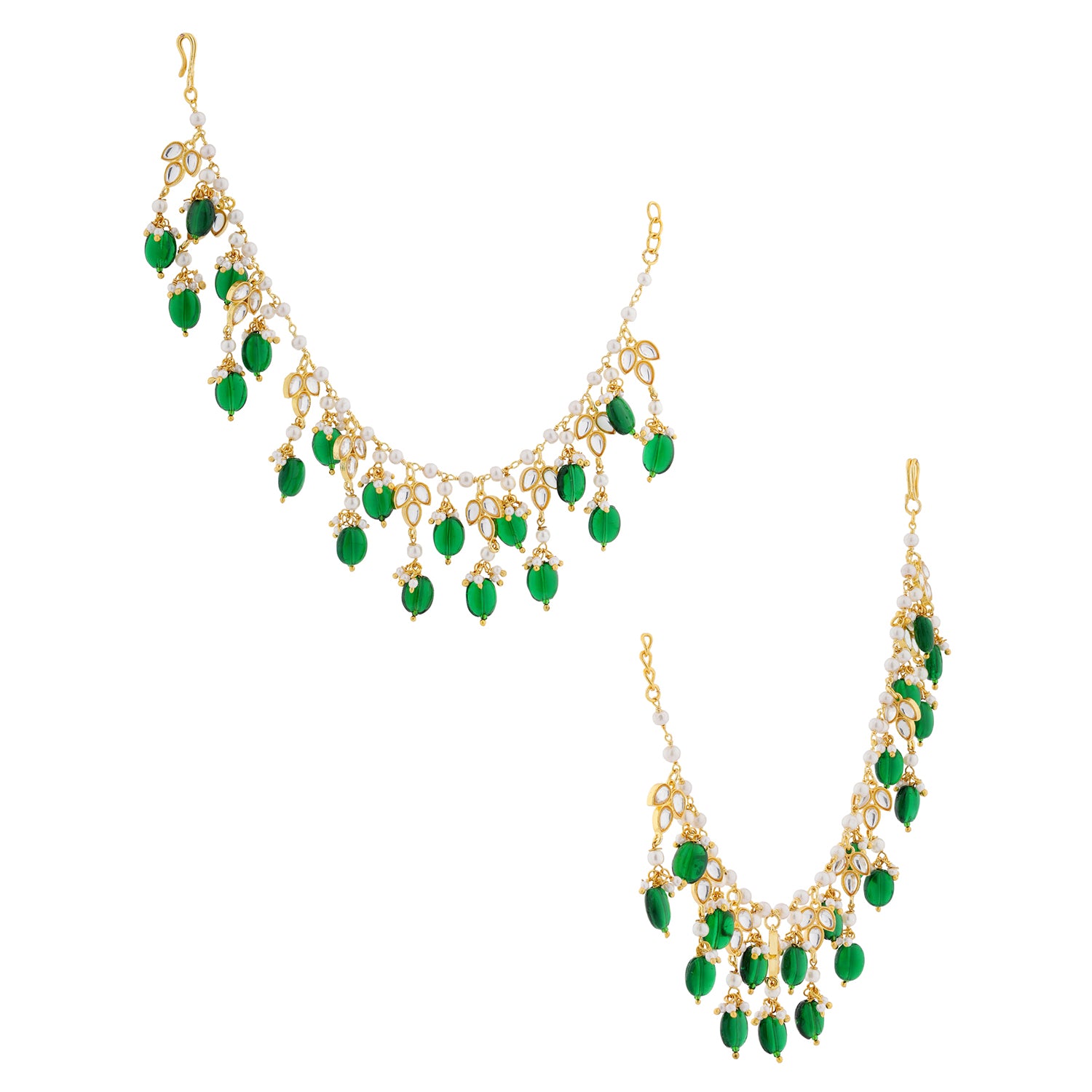 From the timeless Pearl Elegance Collection, the Royal Green Drop Ethnic Earrings Chain Set is designed to add regal charm and graceful movement to ethnic ensembles. Crafted using high-quality brass and finished with rich gold plating, this earrings chain reflects refined craftsmanship and enduring quality. The design features cascading royal green stone drops paired with delicate pearl accents and gold-toned detailing, creating a harmonious multicolor palette that feels both festive and elegant. The layered chain structure enhances statement earrings by framing the face beautifully while adding depth and fluidity to the overall look. Lightweight and comfortable for extended wear, this women’s earrings chain is ideal for weddings, bridal functions, festive celebrations, and traditional occasions. It pairs effortlessly with silk sarees, lehengas, anarkalis, and festive outfits, making it a versatile ethnic accessory. Thoughtfully styled as an elegant add-on, it also serves as a meaningful gift for women on weddings, anniversaries, festivals, and special celebrations. Blending rich green hues, pearl elegance, and gold-plated brass craftsmanship, the Pearl Elegance Royal Green Drop Ethnic Earrings Chain Set is a timeless addition to any ethnic jewellery collection.