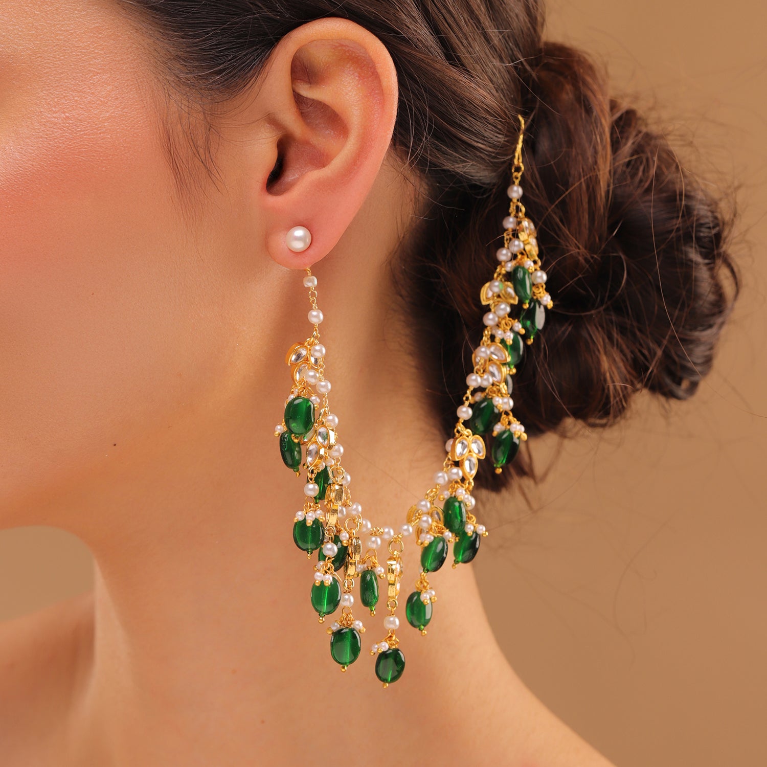 Pearl Elegance Emerald Green Drop Ethnic Earrings Chain Set