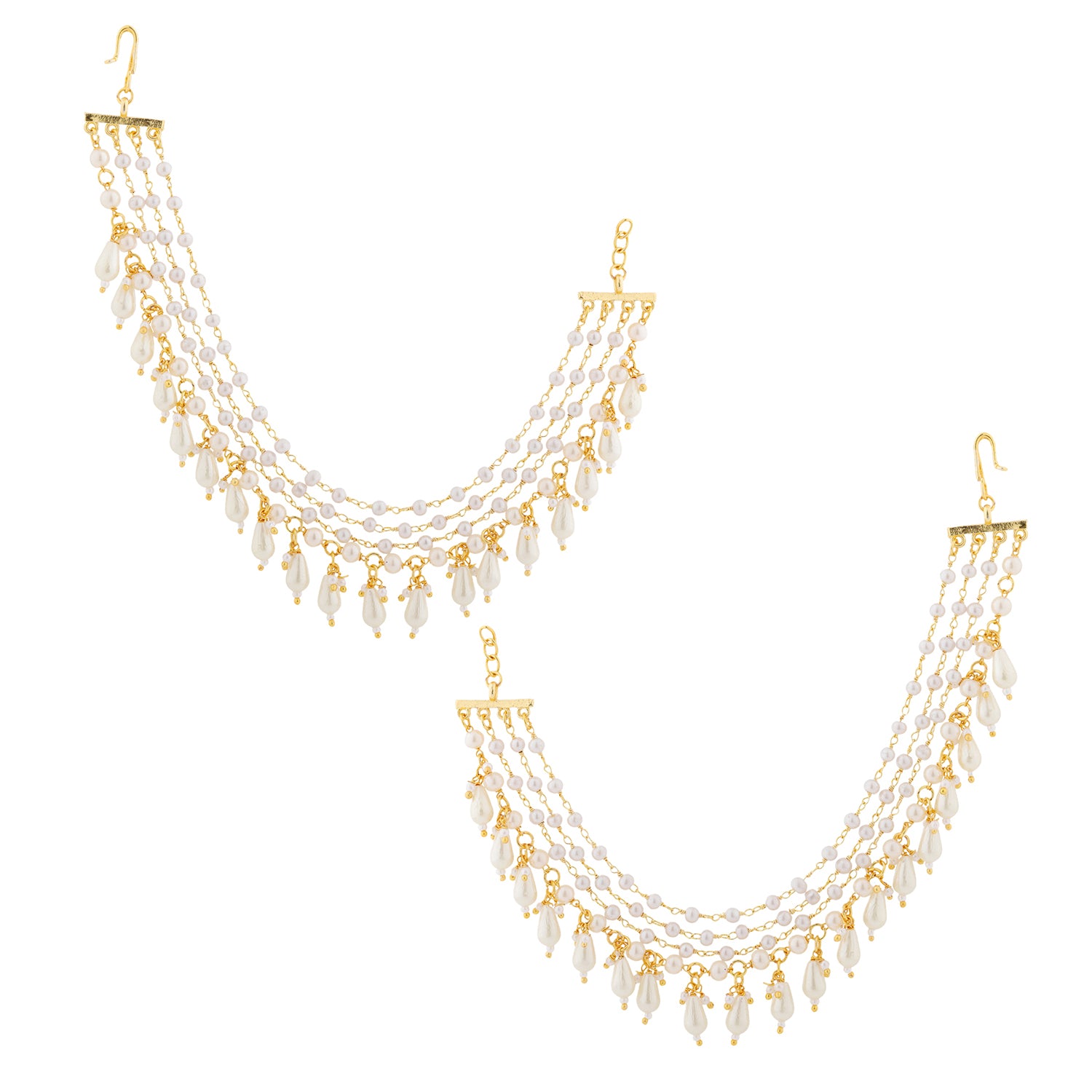 From the refined Pearl Elegance Collection, the Ivory Pearl Drop Ethnic Earrings Chain Set is crafted to bring timeless sophistication to ethnic and bridal looks. Designed using high-quality brass and finished with luxurious gold plating, this earrings chain set reflects graceful craftsmanship with a delicate, feminine aesthetic. The design features layered strands of ivory-toned pearls accented with elegant pearl drop danglers, creating a fluid, cascading silhouette that frames the face beautifully. Lightweight yet visually rich, this women’s earrings chain enhances statement earrings without overpowering the overall look. Ideal for weddings, bridal functions, festive celebrations, and traditional occasions, it pairs effortlessly with silk sarees, lehengas, anarkalis, and pastel ethnic ensembles. The soft pearl palette adds a timeless charm, making it a versatile accessory that transitions seamlessly from day ceremonies to evening festivities. Thoughtfully curated as a sophisticated ethnic accessory, this piece also makes a graceful gift for women on weddings, anniversaries, festivals, or special occasions. Combining pearl elegance, gold-plated brass quality, and classic design sensibilities, the Pearl Elegance Ivory Pearl Drop Ethnic Earrings Chain Set is an essential addition to every ethnic jewellery collection.