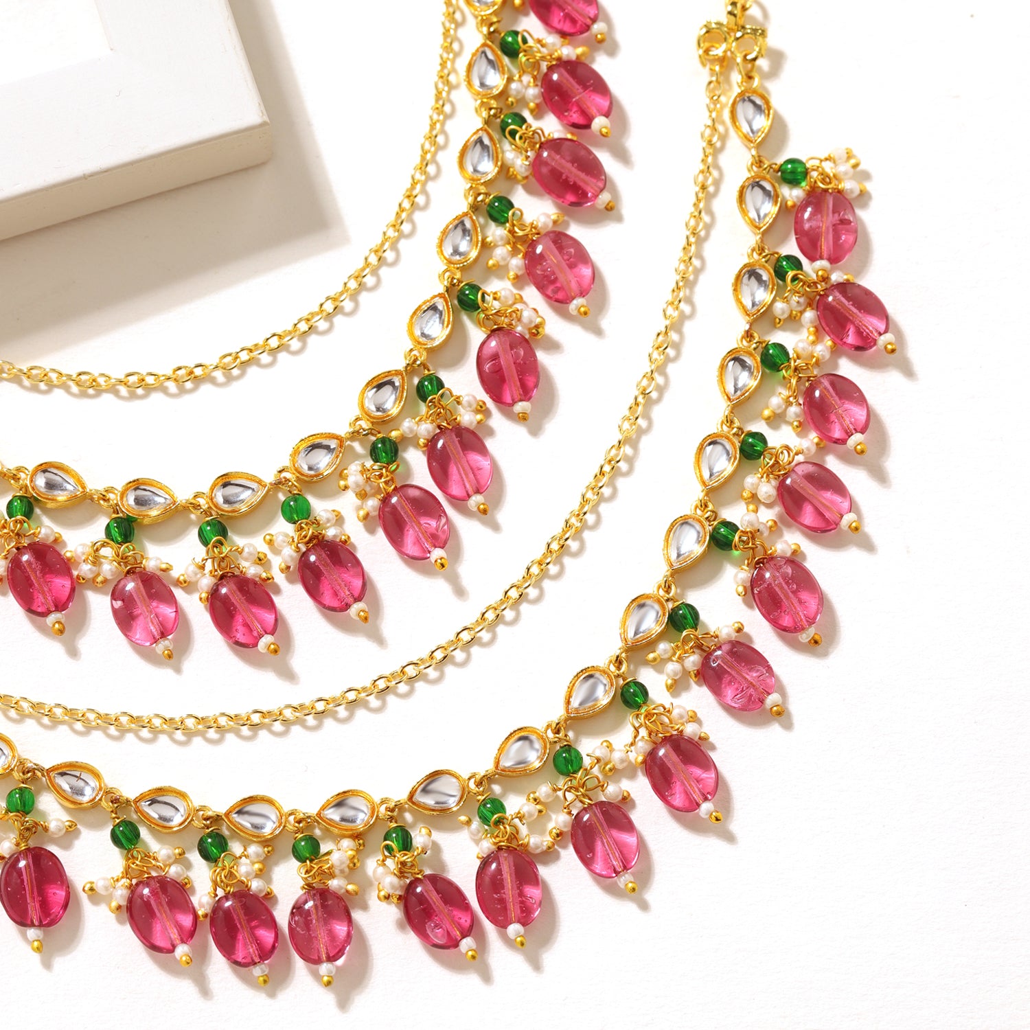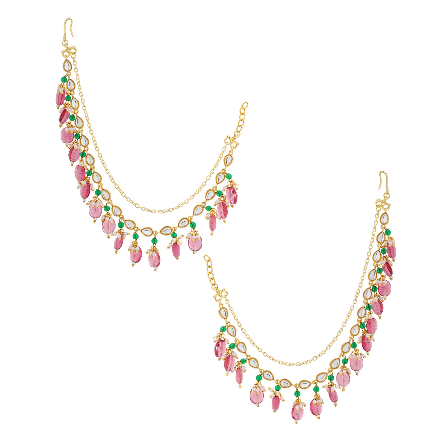 Part of the Pearl Elegance Collection, the Royal Pink Drop Ethnic Earrings Chain Set is designed to bring refined elegance and festive charm to traditional looks. Crafted using durable brass and finished with rich gold plating, this earrings chain set reflects graceful ethnic craftsmanship with a soft yet regal appeal. The design features cascading royal pink stone drops accented with subtle green highlights and pearl-inspired detailing, creating a balanced multicolor earrings chain look that feels elegant and timeless. The layered structure adds movement and frames the face beautifully, enhancing statement earrings while adding depth to festive styling. Lightweight and comfortable for extended wear, this women’s earrings chain set is ideal for weddings, bridal functions, festive celebrations, and cultural gatherings. Designed to complement silk sarees, lehengas, anarkalis, and ethnic ensembles, it effortlessly elevates traditional outfits. Thoughtfully curated as a versatile ethnic accessory, this piece also makes a meaningful gift for women on weddings, anniversaries, festivals, or special milestones. Blending royal pink hues, pearl elegance, and gold-plated brass craftsmanship, the Pearl Elegance Royal Pink Drop Ethnic Earrings Chain Set is a timeless addition to any ethnic jewellery collection.