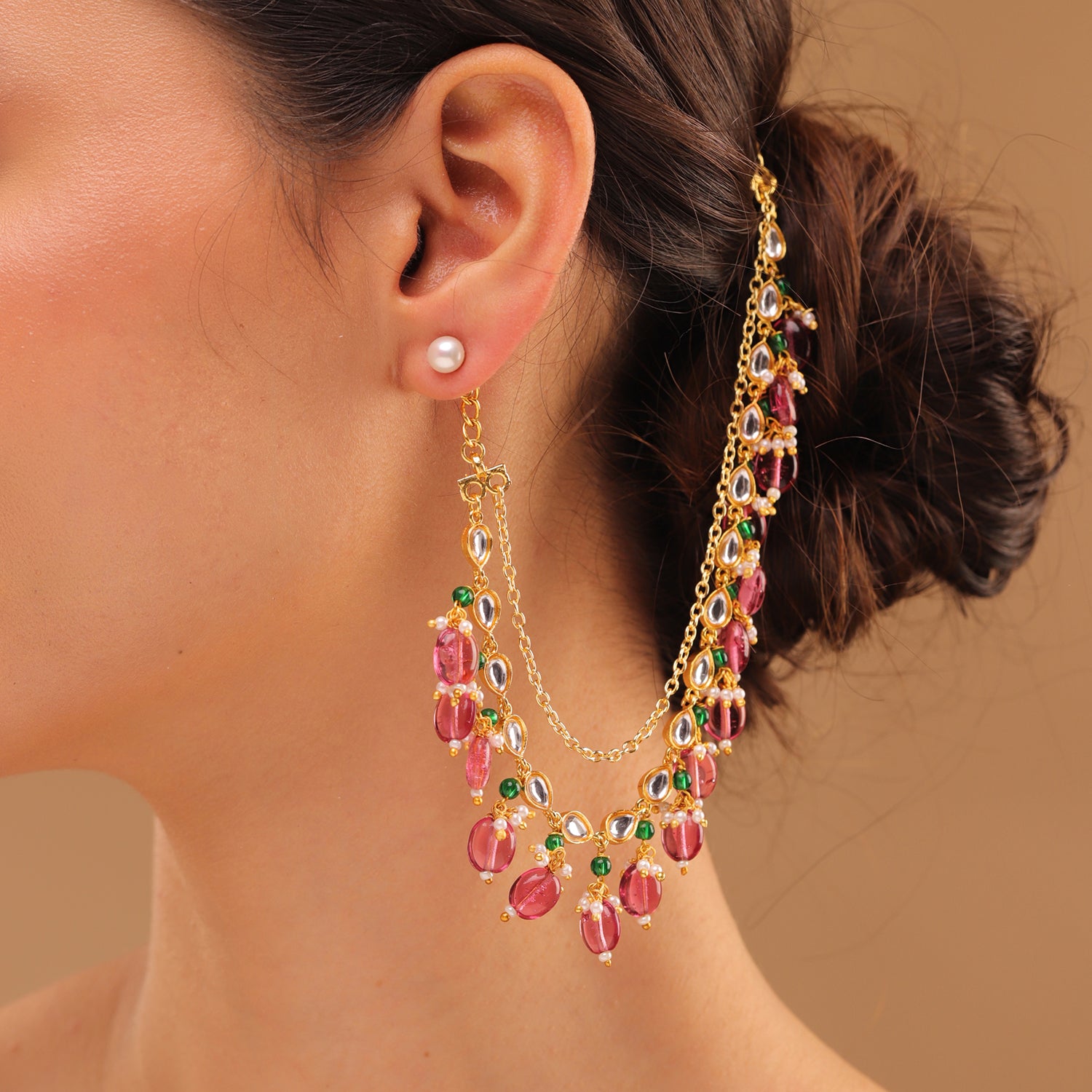 Pearl Elegance Royal Pink Drop Ethnic Earrings Chain Set