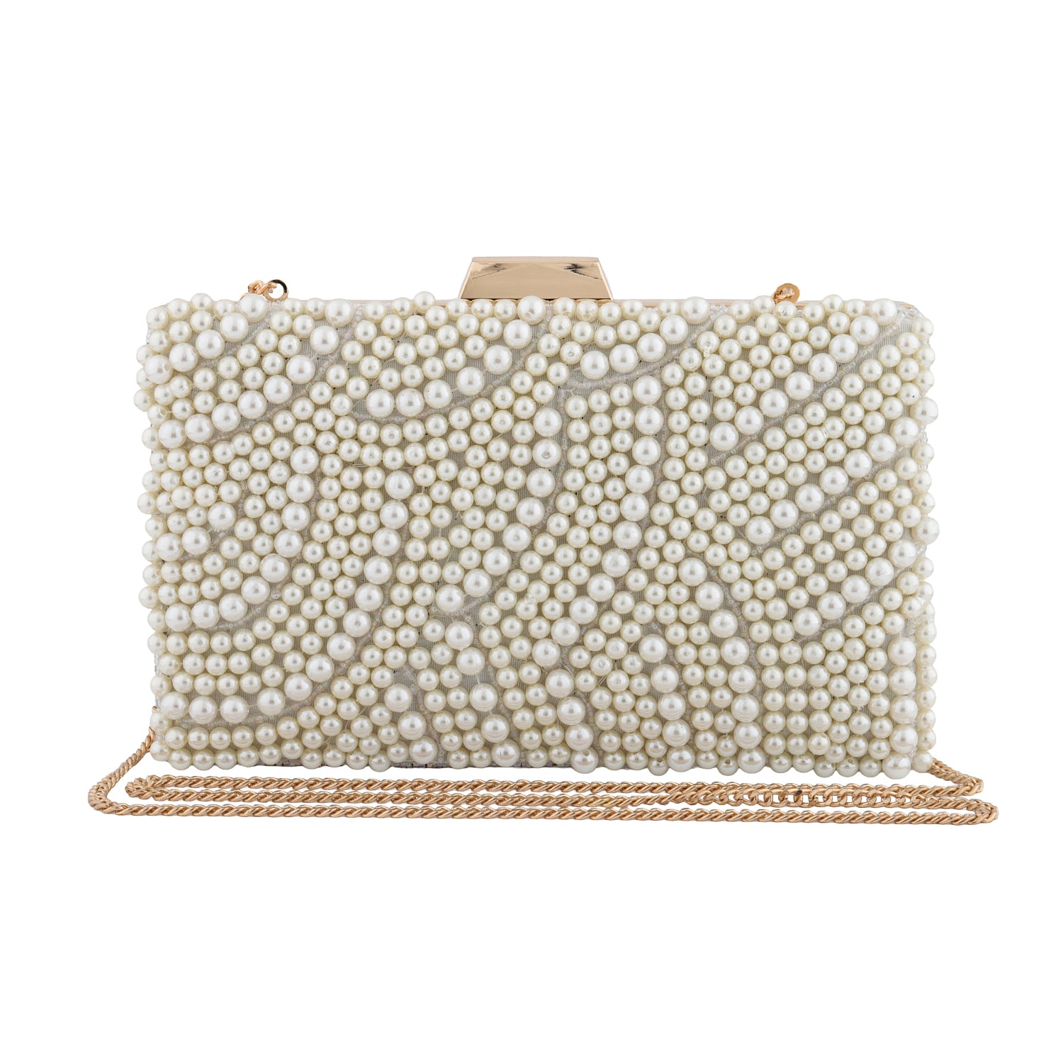 Step into timeless elegance with the Pearl Luxe Party Clutch Bag, a masterpiece from our Trendy Bags Collection. Crafted with precision and grace, this stunning fabric pearl-beaded clutch is designed to make every outfit shine. Adorned with intricate pearl beadwork in a swirling pattern, this clutch exudes luxury and sophistication. The soft ivory tone complements the radiant golden chain, creating the perfect harmony of classic and contemporary charm. Whether carried by hand or worn using the detachable sling chain, it transitions effortlessly from cocktail evenings to grand celebrations. This party wear clutch with sling chain is not just an accessory, it’s a statement piece that adds elegance to every occasion. Perfect for weddings, receptions, festive events, or date nights, it’s the ideal companion for the woman who loves to stand out with subtle glamour. It also makes a thoughtful gift for her, perfect for birthdays, anniversaries, bridal showers, or festive gifting. Elegant, timeless, and handcrafted to perfection, this pearl clutch is the kind of beauty that never goes out of style.