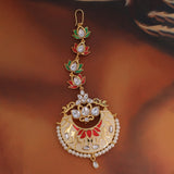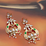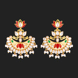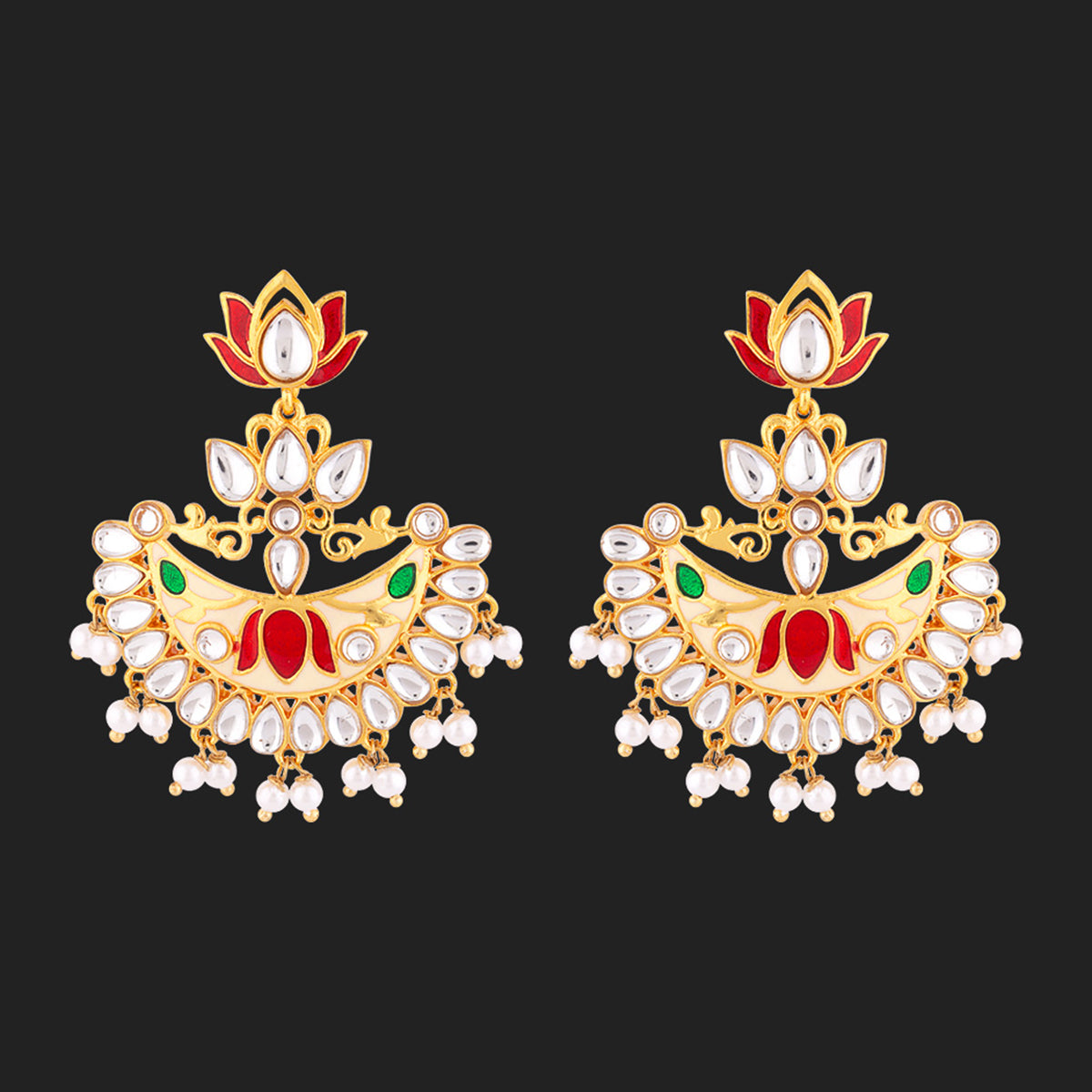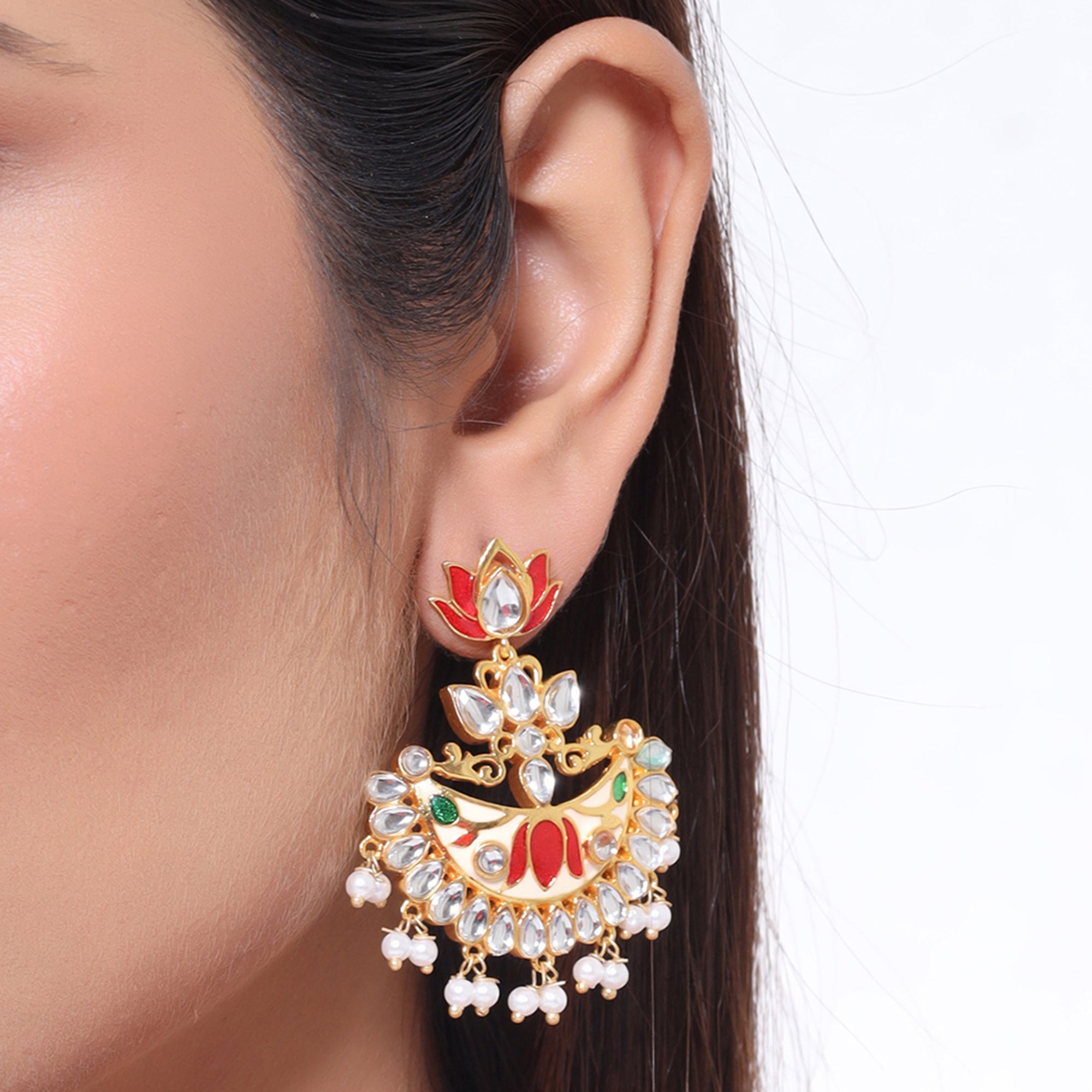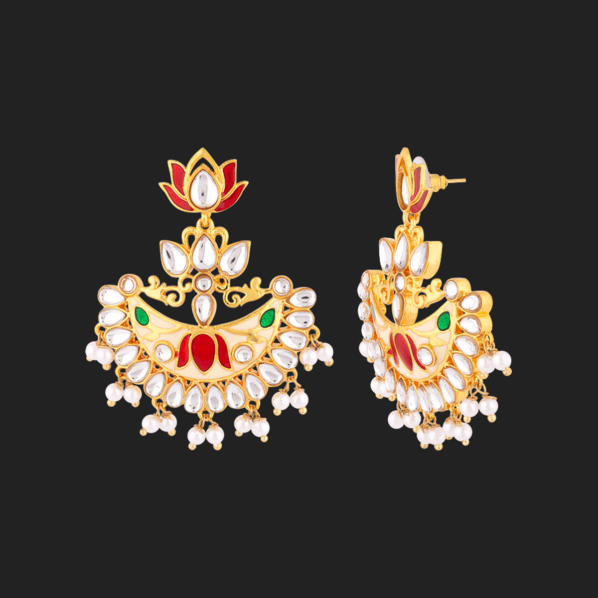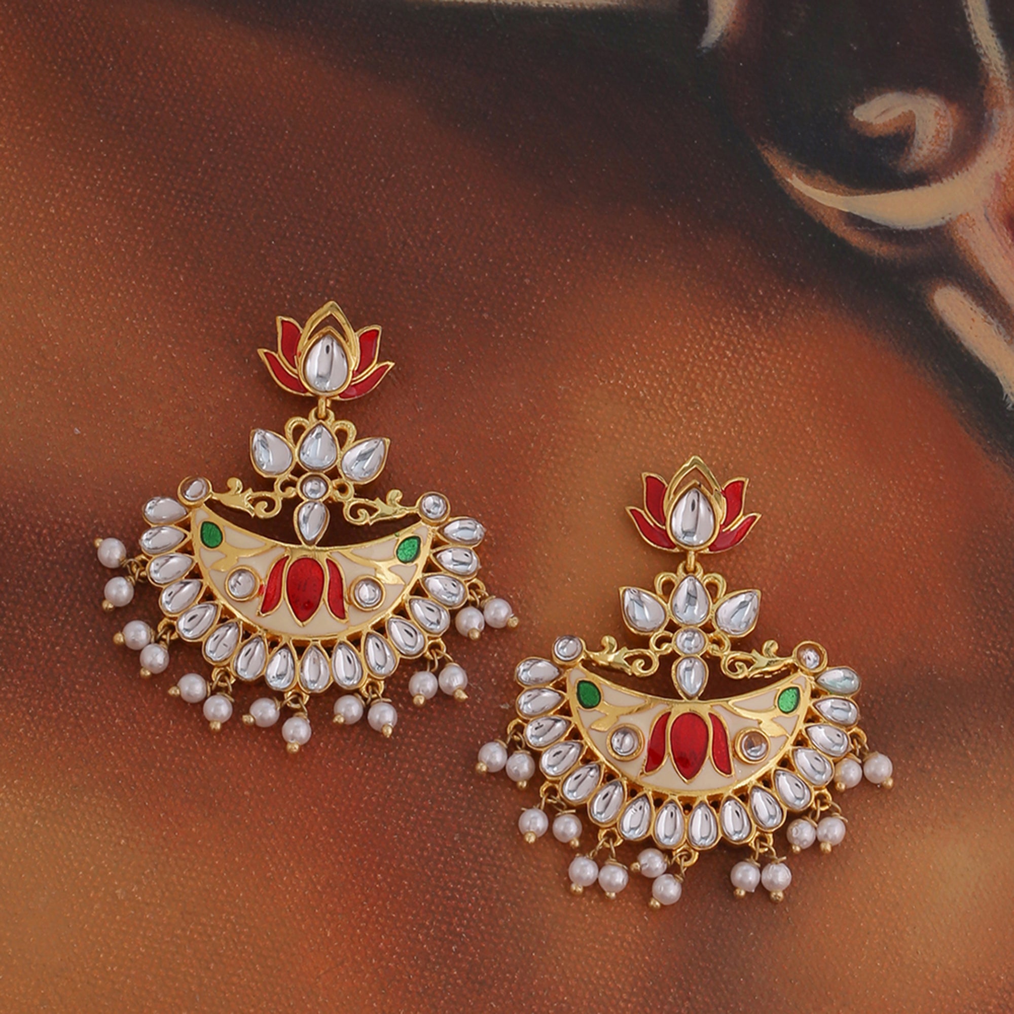 Designed as an ode to the marvelous and delicately designed Taj Mahal, these drop earrings, featuring floral motifs, have been fashioned out of brass. Enameled and yellow gold plated, the pair features faux kudan gemstones and pearls embellishments. A good match for ethnic looks.