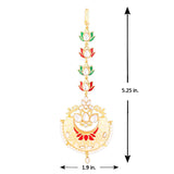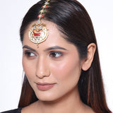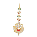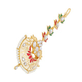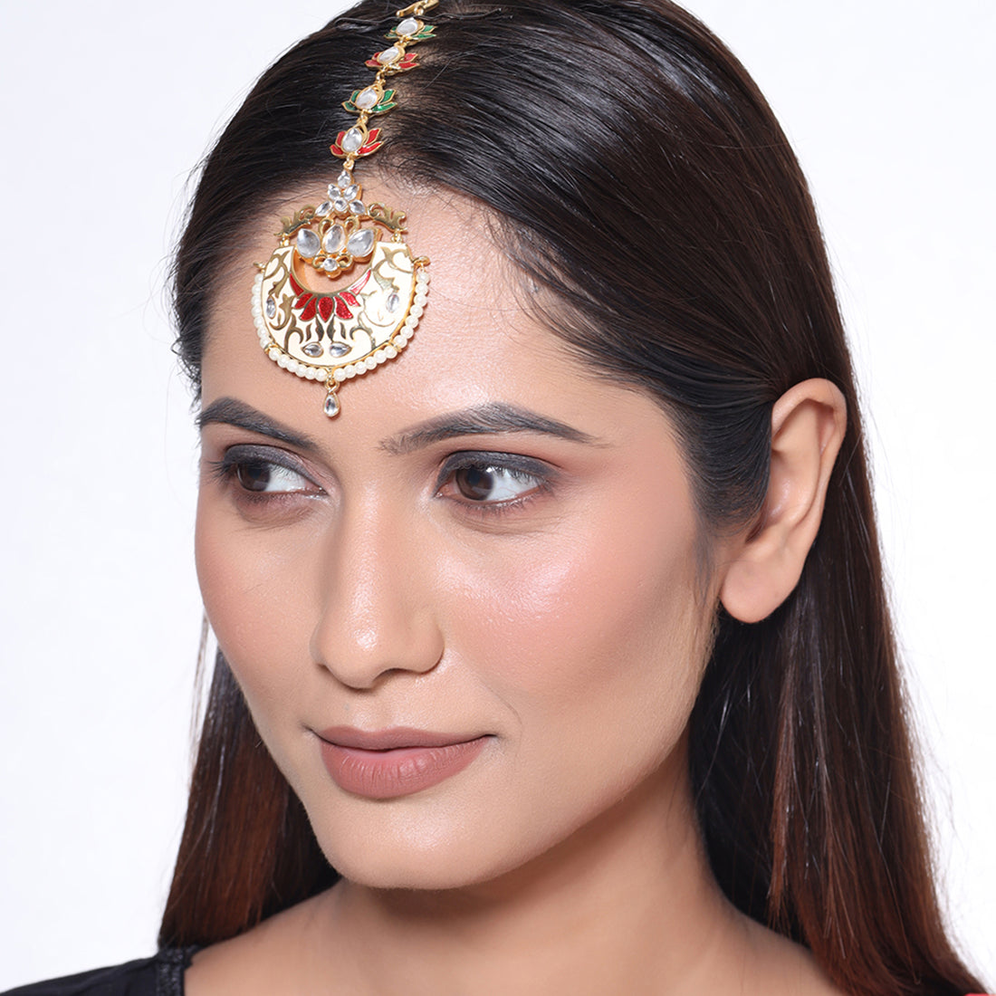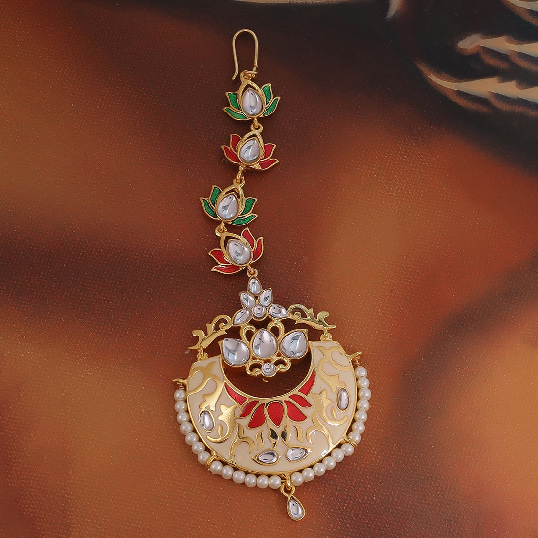 Brass maang tika, adorned with floral motifs and designed as an ode to the Taj Mahal and its gorgeous inlay patterns. Yellow gold plated and embellished with faux kundan gems and pearls, the enameled maang tika has been given a yellow gold plating. Pair with a traditional kurta or trendy saree.