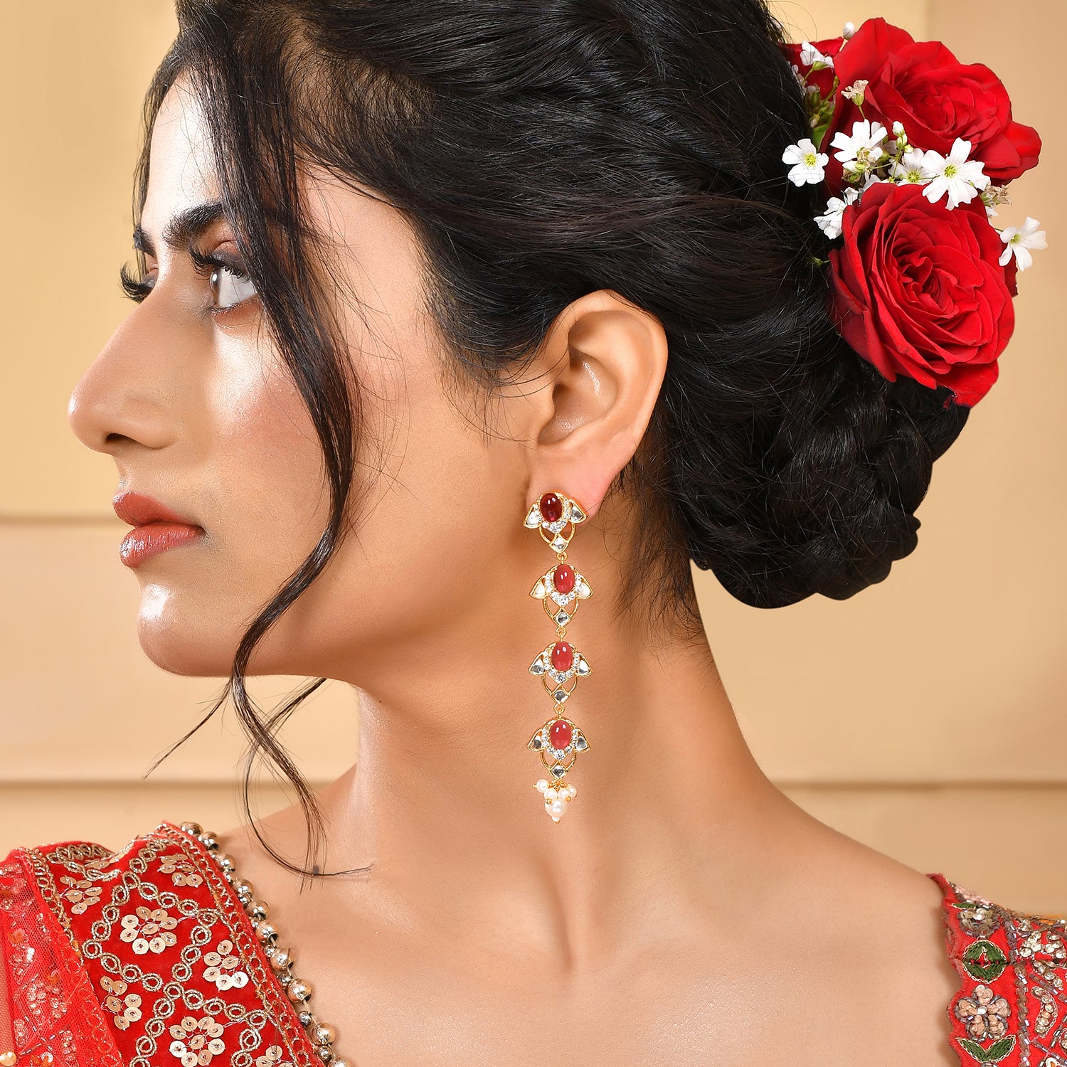 Inspired by the timeless beauty of a Rose Garden, this collection seamlessly blends the intricate patterns and classic silhouettes of Kundan Polki jewelry with a contemporary twist. Adorned with a mesmerizing combination of Polki, CZs, carved stones, and pearls, each piece tells a story of grace and sophistication.