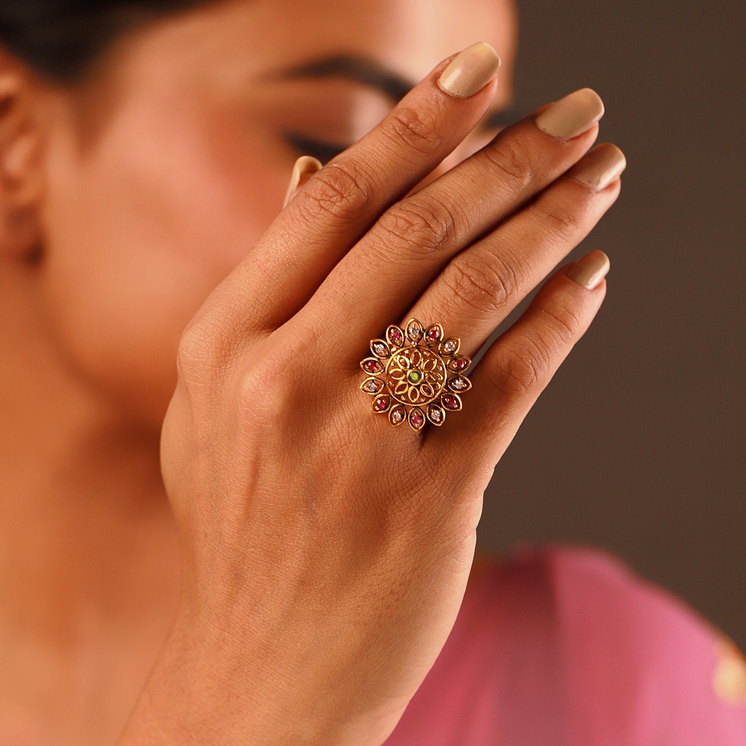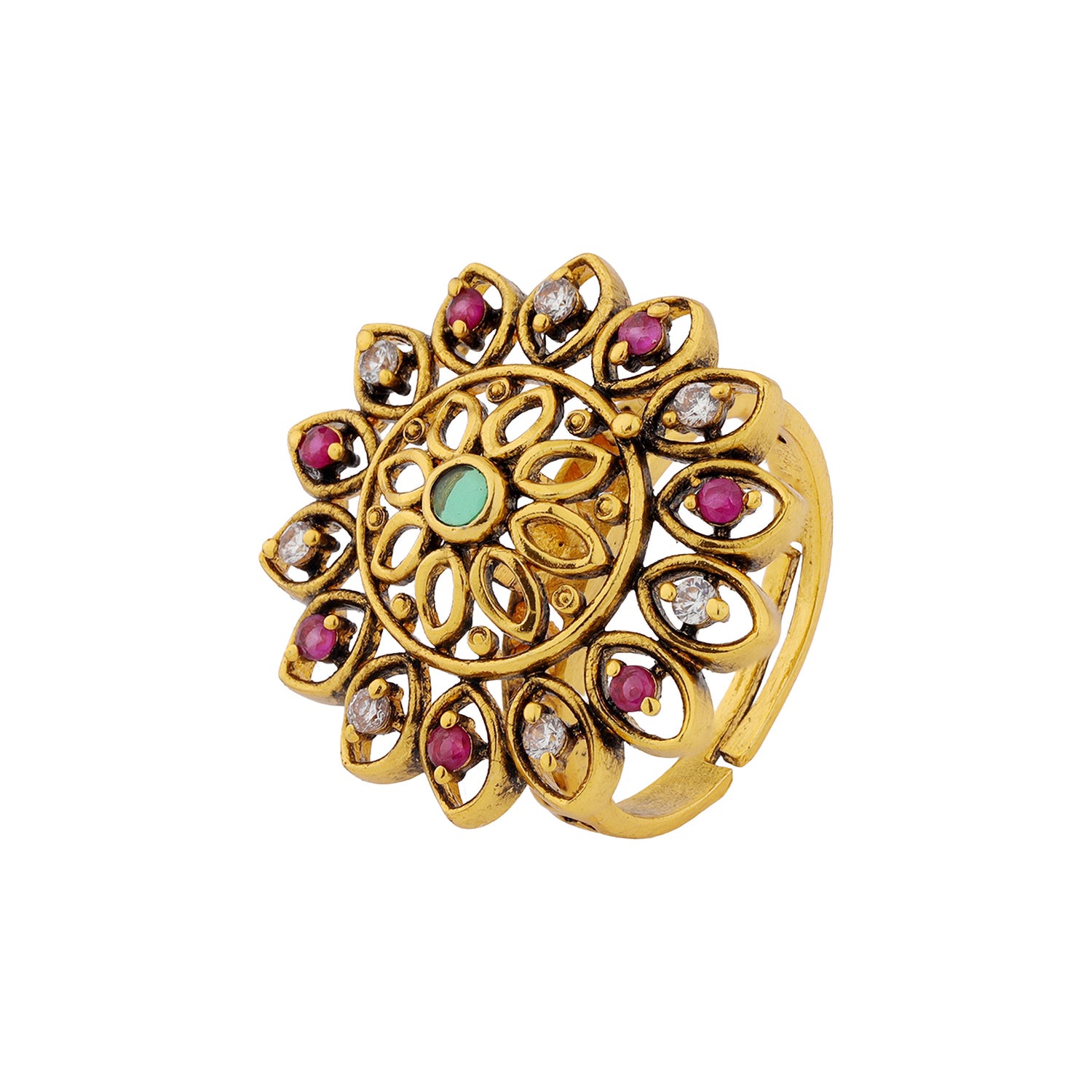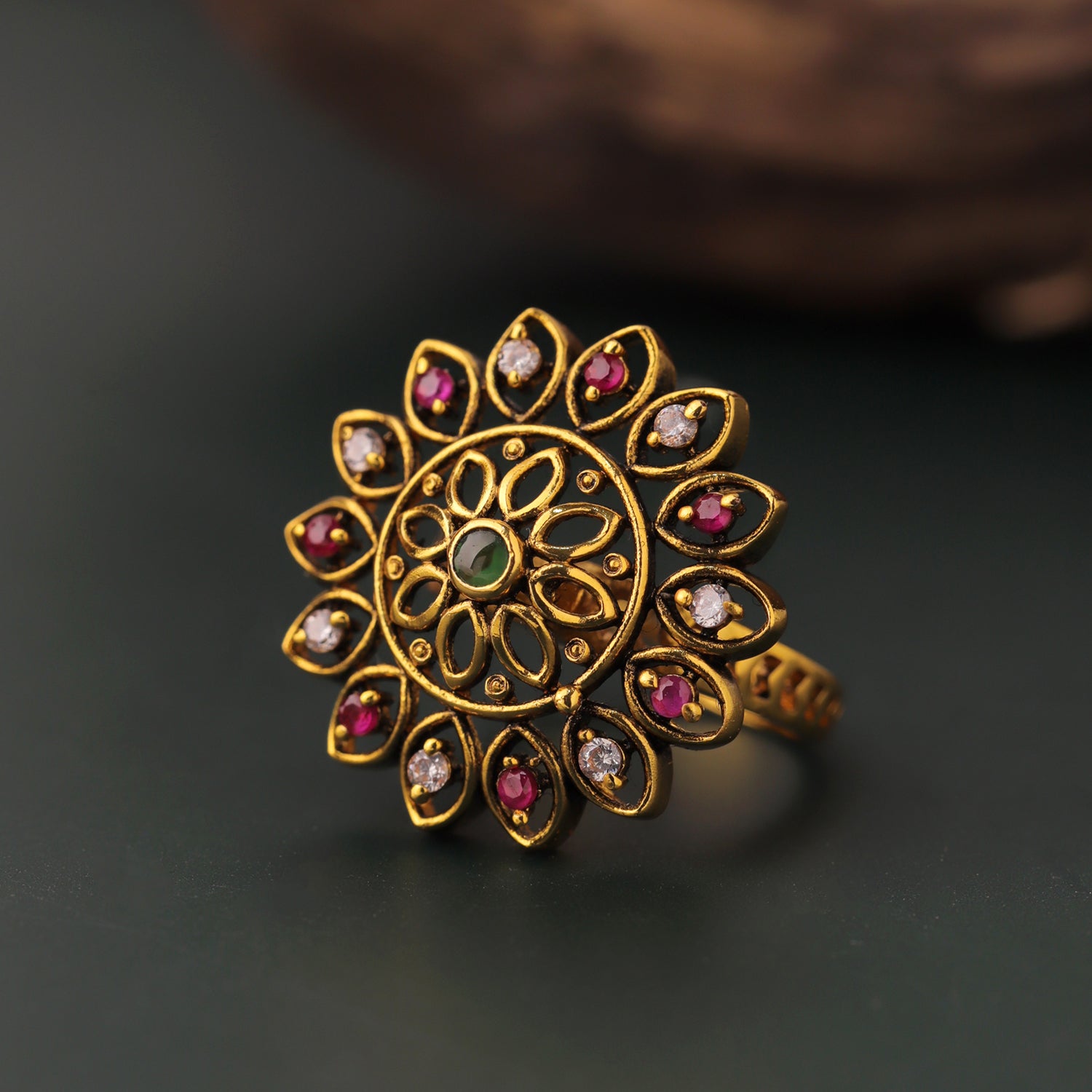 Embrace divine tradition with the Gold Essentials Collection, featuring the magnificent Antique Lotus Temple Ring for women, a true celebration of heritage, craftsmanship, and elegance. Expertly crafted from high-quality alloy and finished in a regal Antique Gold plating, this ring reflects the grandeur of South Indian temple jewelry. Its exquisite lotus-inspired design, adorned with vibrant red, green, and white stones, captures the essence of spirituality and grace. The Gold Essentials Temple Ring is more than just a piece of jewelry, it’s a statement of devotion and artistry. Perfect for festive occasions, weddings, and traditional celebrations, this designer Ring adds an authentic ethnic charm to any outfit. It’s also a thoughtful gift for wife, gift for girlfriend, or gift for women who adore heritage-inspired accessories with timeless appeal.
