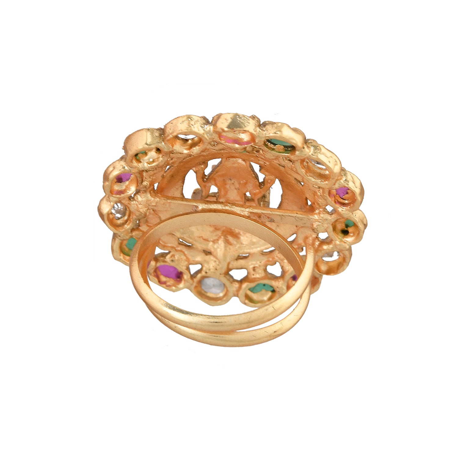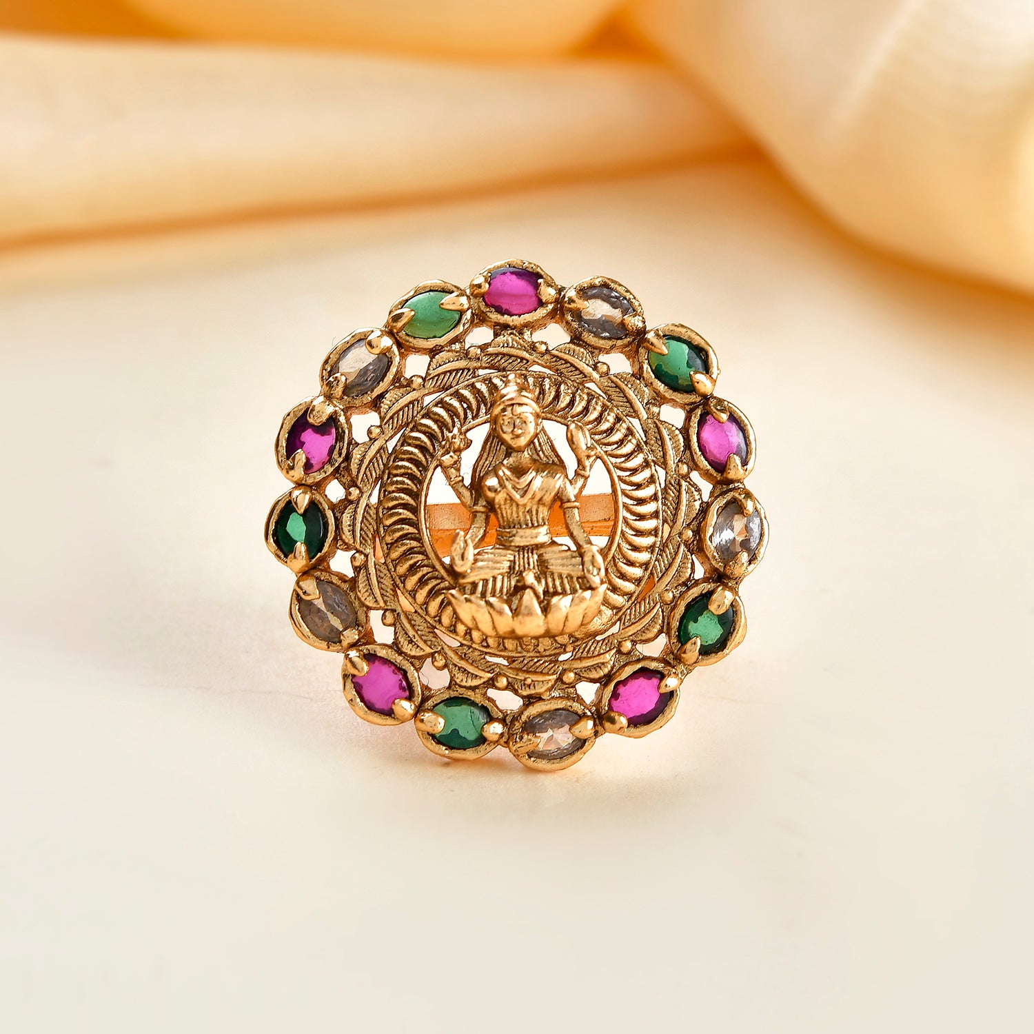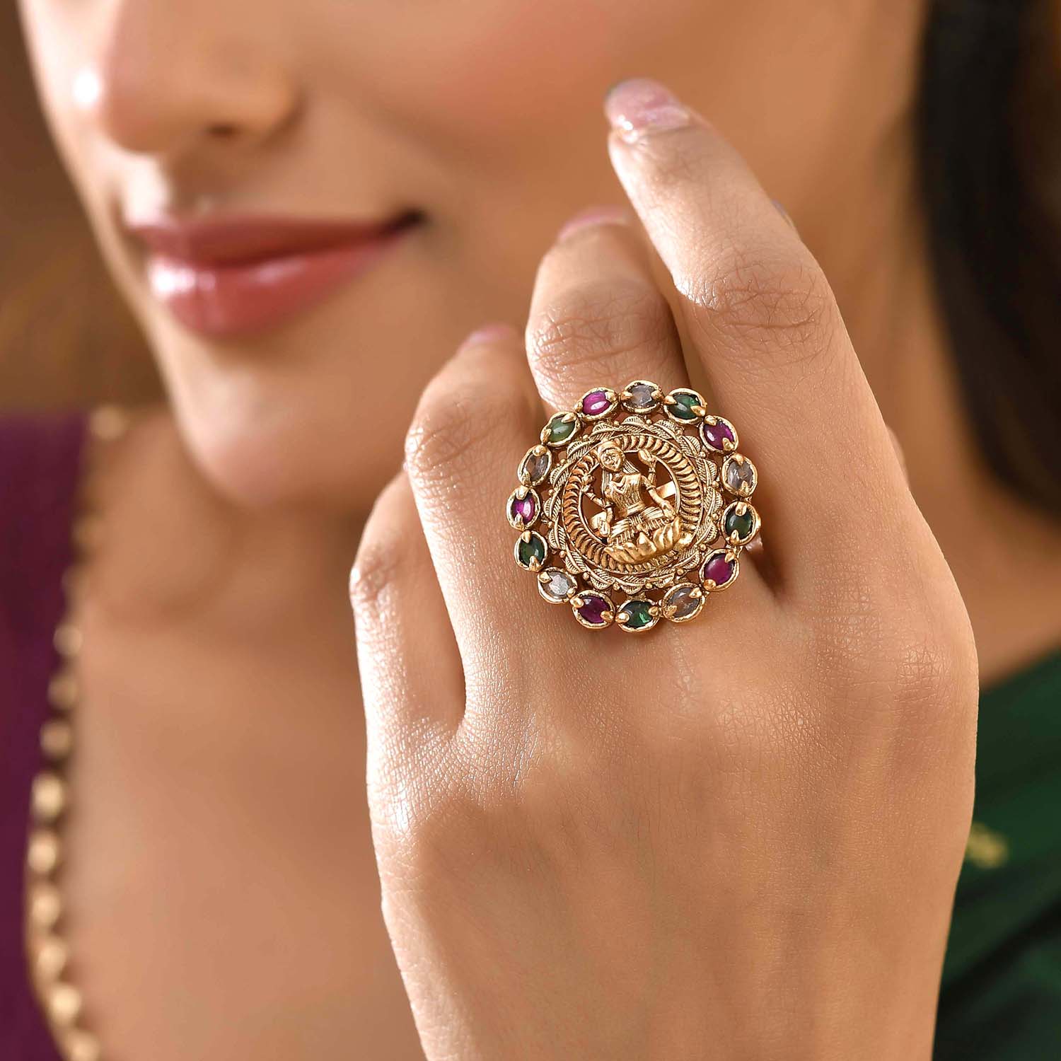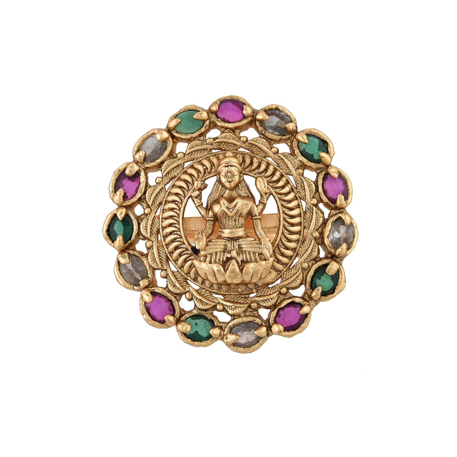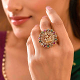 The Bhavani Temple Ring is a captivating piece from the Gold Opulence Collection, crafted with high-quality alloy and luxuriously plated in gold. The intricate design showcases a central deity figure, gracefully encircled by vibrant Kundan stones in hues of green, purple, and clear, exuding an aura of elegance and traditional craftsmanship. This ring effortlessly combines grace and grandeur, making it a perfect statement piece for festive occasions, weddings, and traditional ceremonies. Pair it with ethnic attire such as sarees, lehengas, or Anarkali suits for a royal and sophisticated look, and complete your ensemble with matching Kundan earrings. It's an exquisite gift choice for women, suitable for Diwali, Rakshabandhan, Valentine's Day, Christmas, New Year, and more, adding a touch of elegance and tradition to their jewelry collection. Ideal for sisters, girlfriends, wives, mothers, and other loved ones, this ring is a timeless treasure for any jewelry enthusiast.
