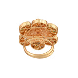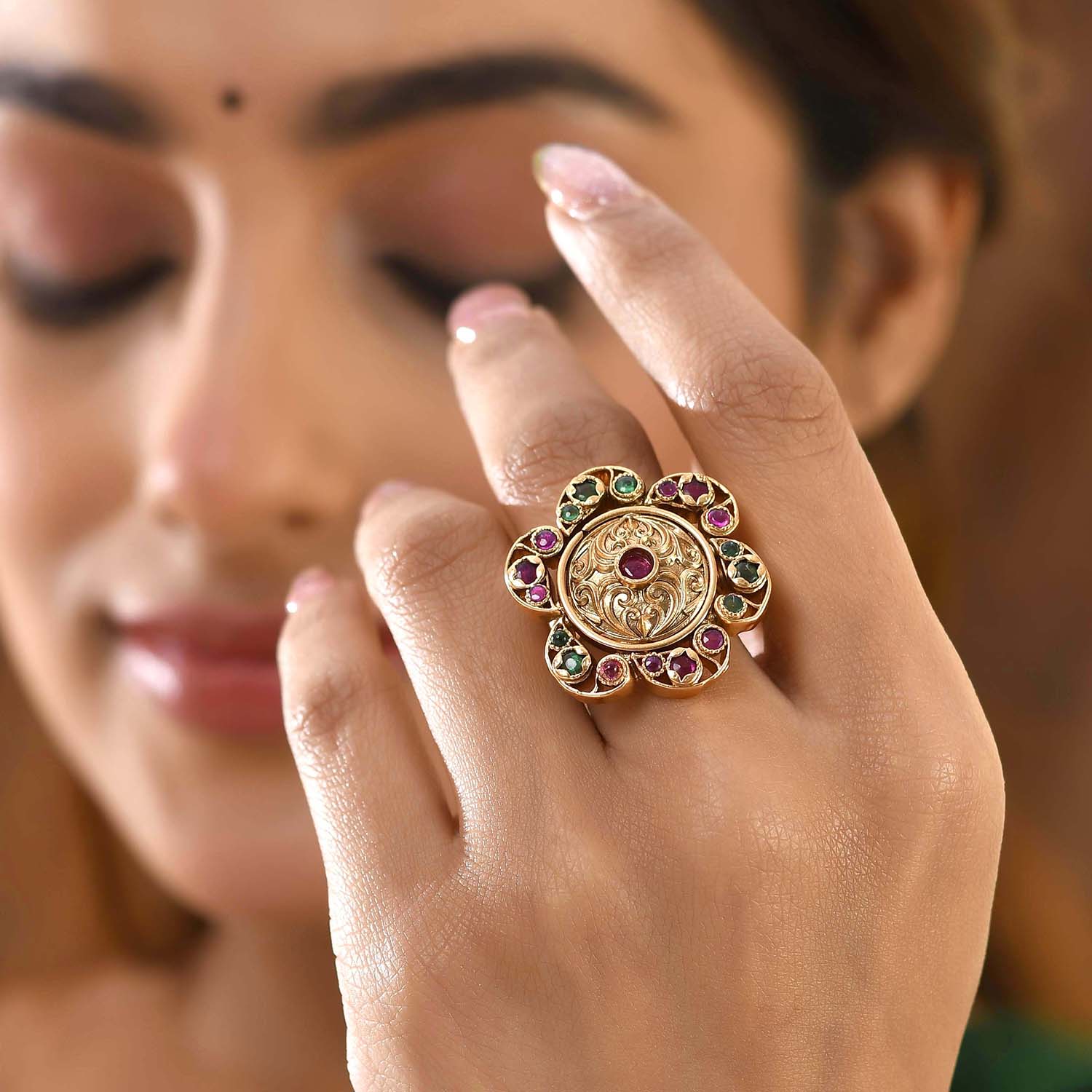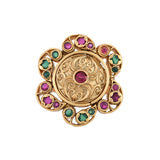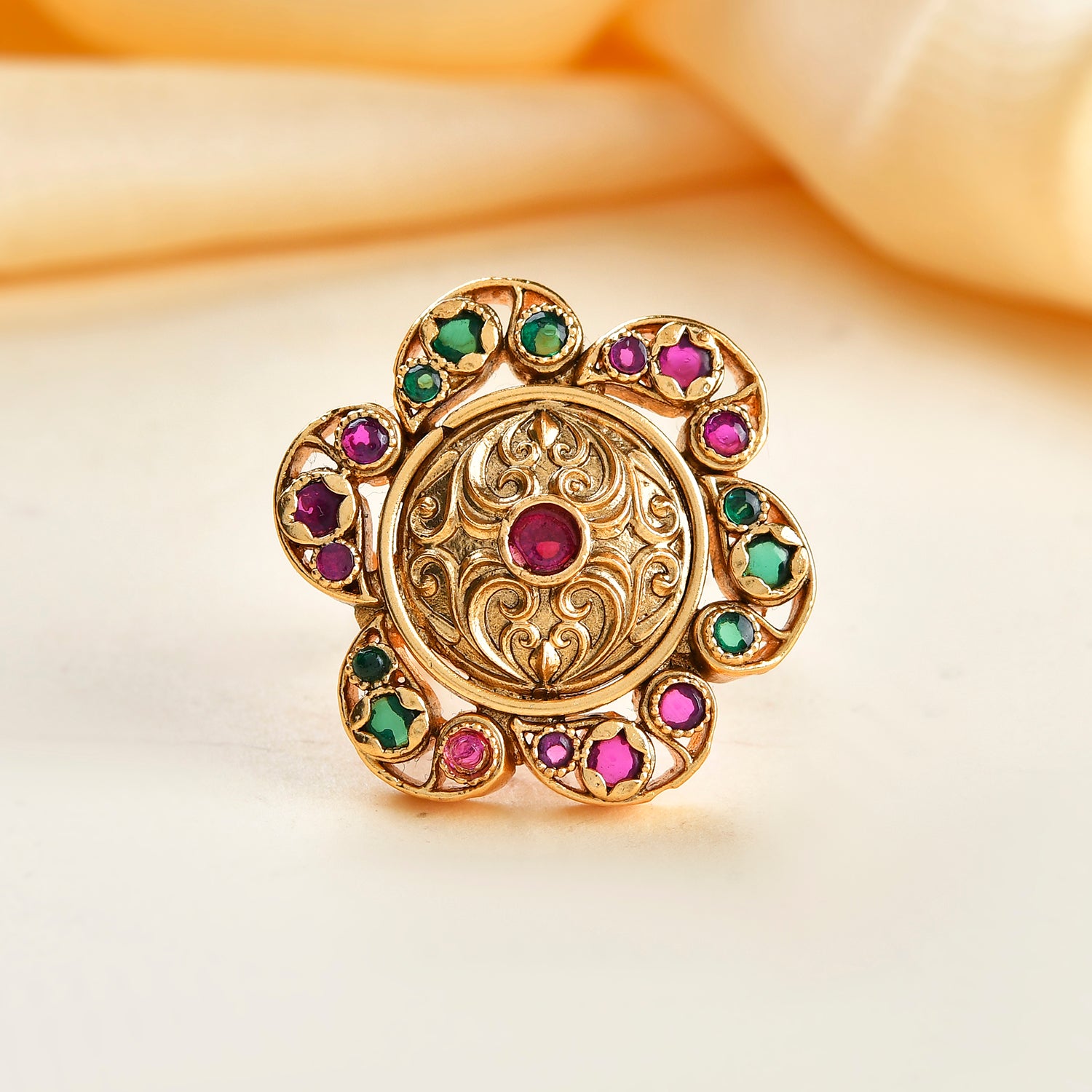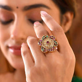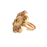 The Lavanya Temple Ring is a stunning piece of jewelry that exudes elegance and tradition. Crafted from high-quality alloy and plated with gold, this ring features intricate designs reminiscent of temple architecture, adorned with vibrant Kundan stones in shades of green and purple. The central motif is a beautifully detailed floral pattern, making it a perfect statement piece for festive occasions, weddings, and pooja ceremonies. This ethnic ring is a versatile accessory that can be paired with traditional South Indian attire, festive wear, or even as a standout piece for a cocktail party. It makes an excellent gift for women, whether for Valentine's Day, Diwali, Rakshabandhan, or Christmas, and is sure to be cherished by mothers, wives, girlfriends, and sisters alike. The Lavanya Temple Ring is part of the Gold Opulence collection, celebrating the royal and timeless beauty of temple jewelry.