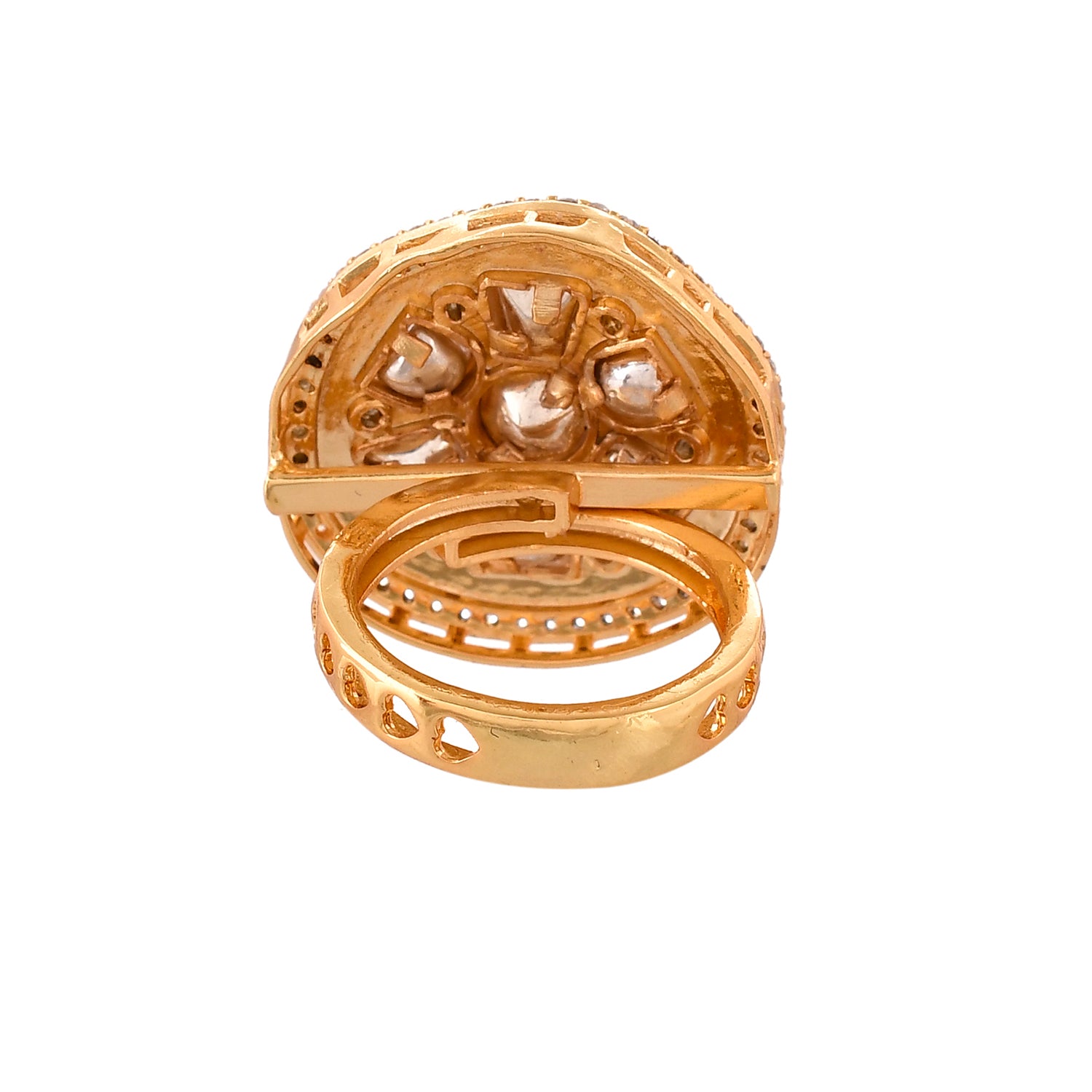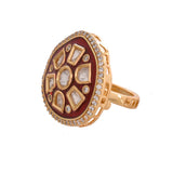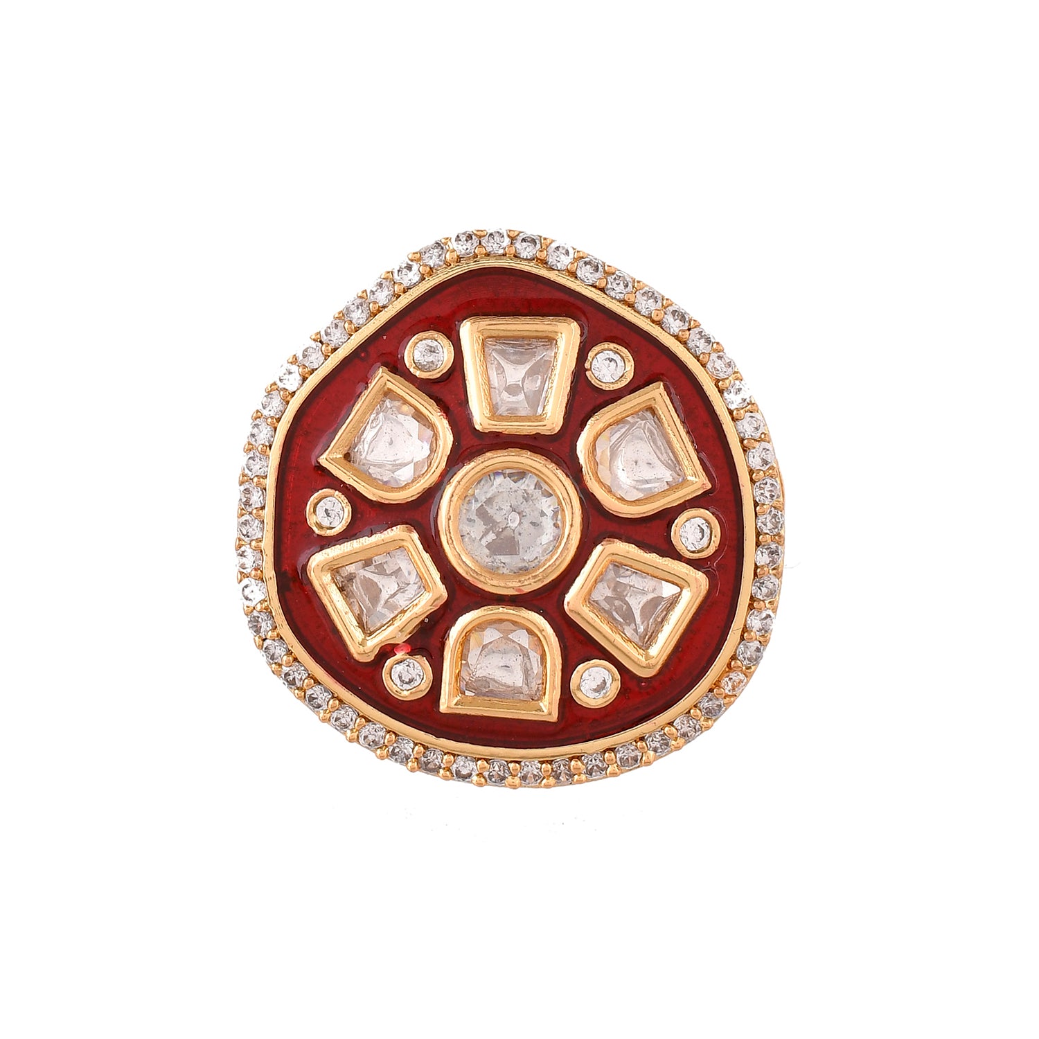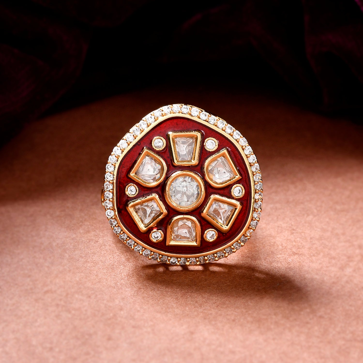 The Chandni Meena Ring is a stunning piece from the Kundan Elegance collection, meticulously crafted from high-quality brass and adorned with luxurious gold plating. This exquisite ring features a central round Kundan stone surrounded by six intricately cut Kundan stones, each set in a rich red enamel base and framed by a delicate border of sparkling white stones. The design exudes a regal charm, making it an ideal statement piece for weddings, festive occasions, and traditional ceremonies. Its versatile styling allows it to complement ethnic attire such as sarees and lehengas, as well as contemporary outfits for a touch of elegance. The vibrant red and gold hues add a festive flair, making it a perfect gift for women on occasions like Diwali, Rakshabandhan, Valentine's Day, and Christmas. Whether for a mother, sister, girlfriend, wife, or friend, this ring is a thoughtful and cherished gift that embodies timeless beauty and sophistication.