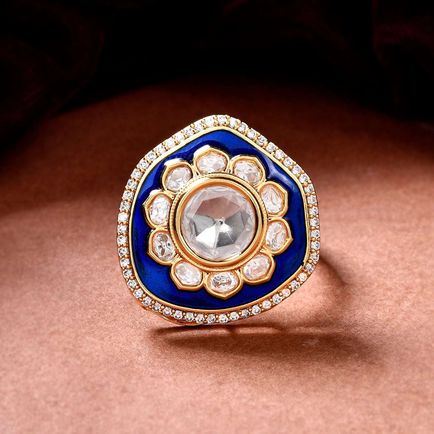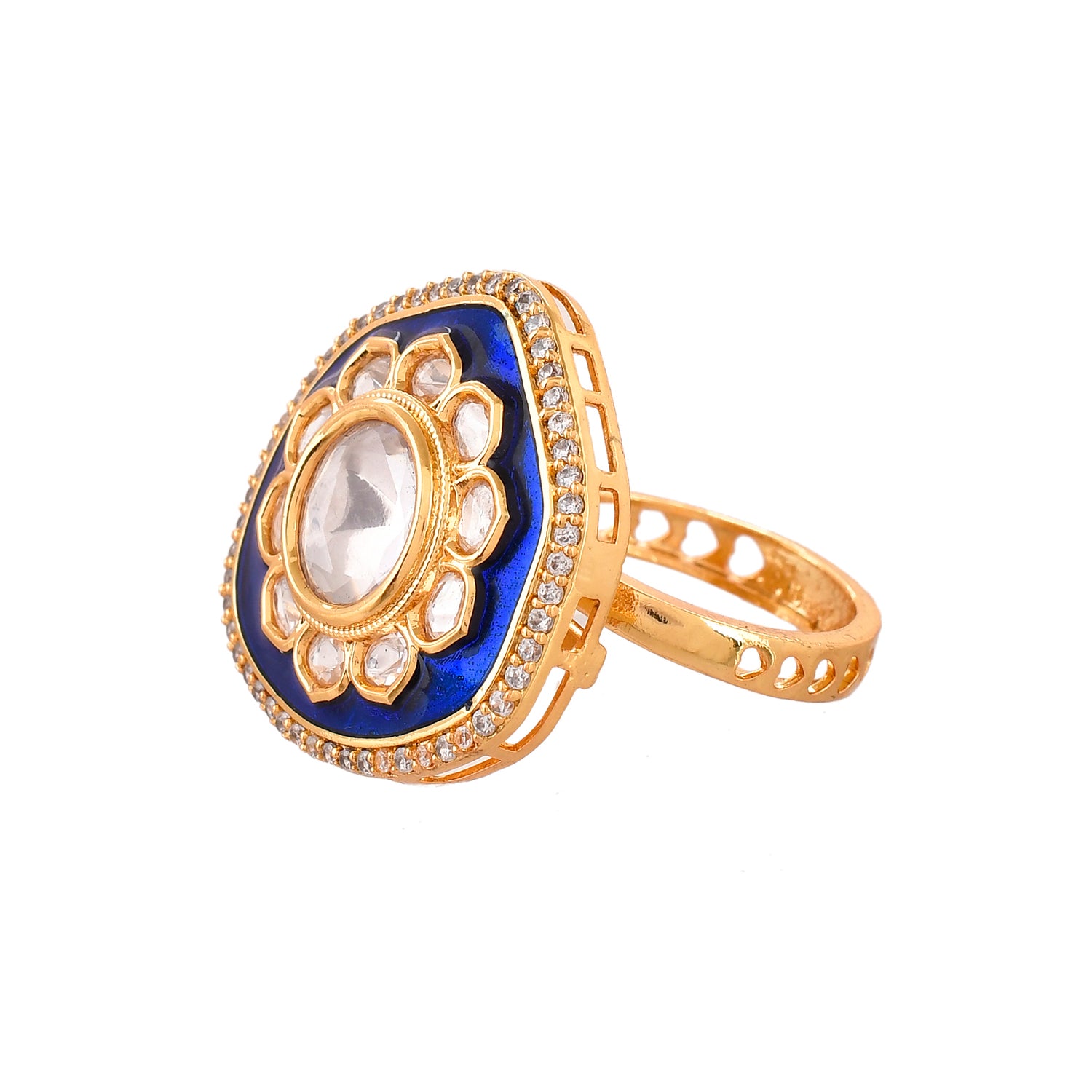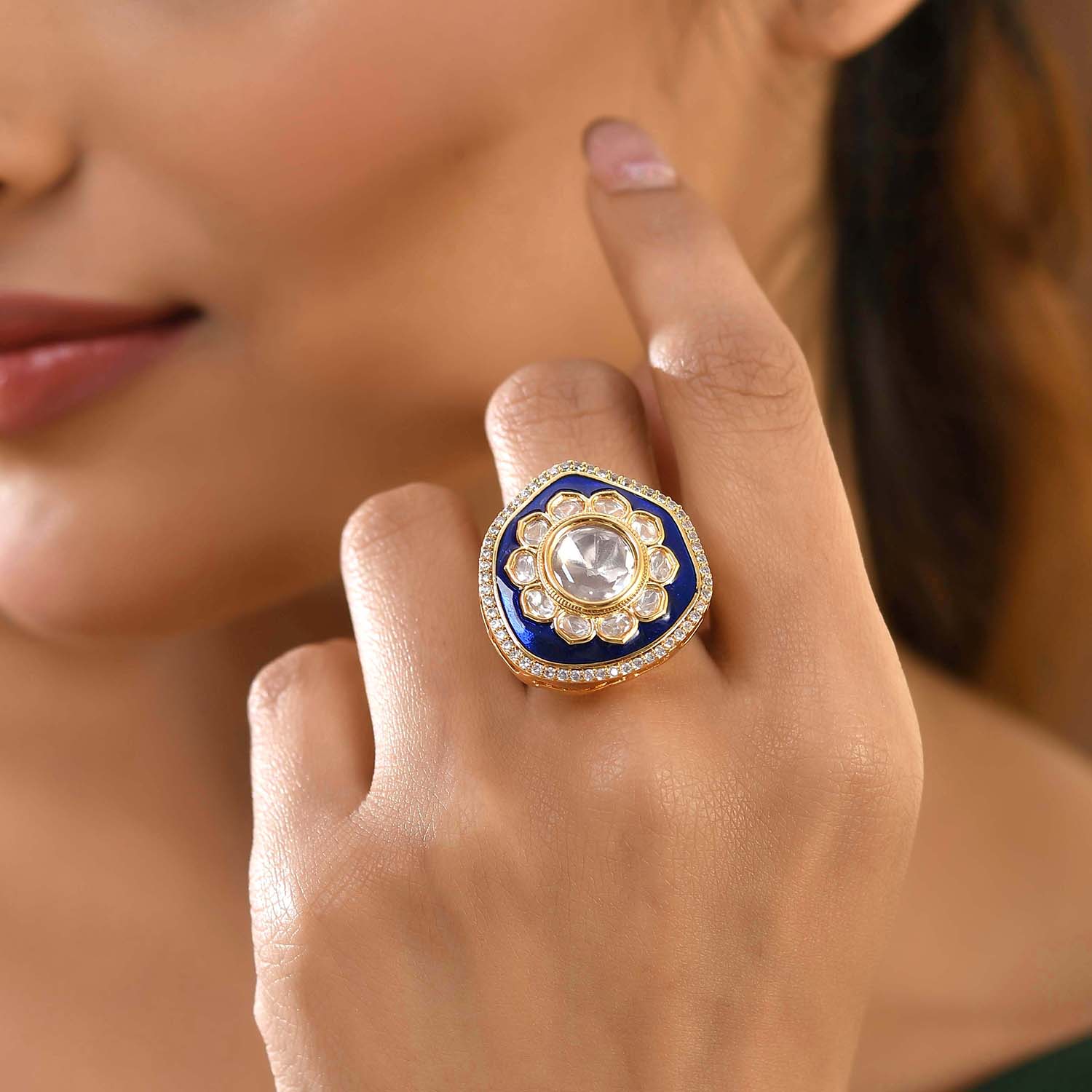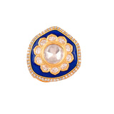 The Chandnika Ring is a stunning piece from the Kundan Elegance collection, meticulously crafted from high-quality brass and adorned with a luxurious gold plating. This exquisite ring features a central kundan stone surrounded by a floral pattern of smaller kundan stones, all set against a rich blue enamel background. The intricate design is further enhanced by a border of sparkling stones, making it a perfect statement piece for any festive or royal occasion. Ideal for weddings, pooja wear, or festive celebrations like Diwali and Rakshabandhan, this ring is a versatile accessory that complements both traditional and contemporary outfits. Its elegant design and vibrant colors make it a thoughtful gift for women on occasions such as Valentine's Day, Christmas, New Year, or as a special token for a wife, girlfriend, mother, or sister. The Chandnika Ring is not just a piece of jewelry; it's a symbol of elegance and timeless beauty.