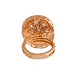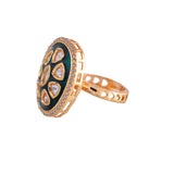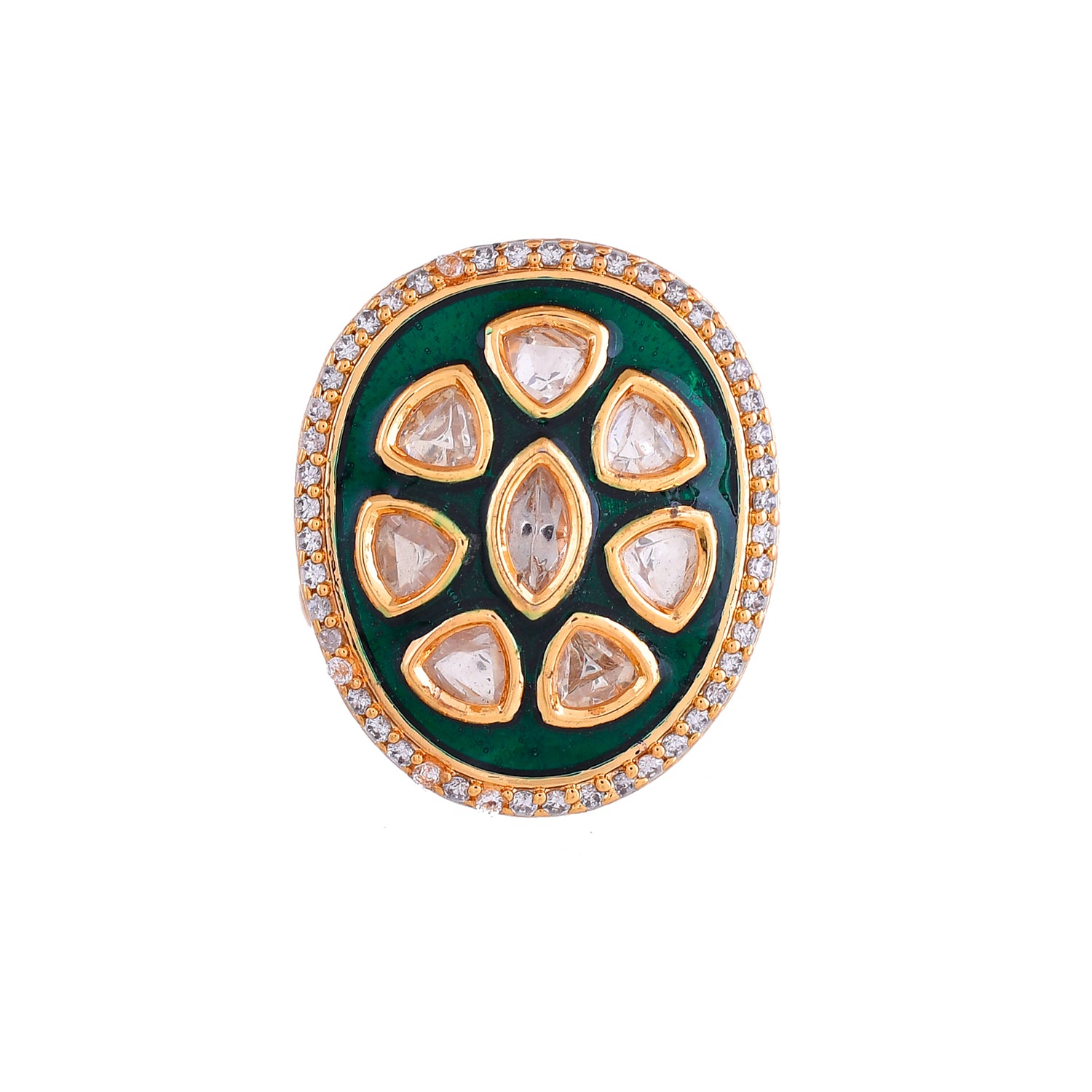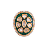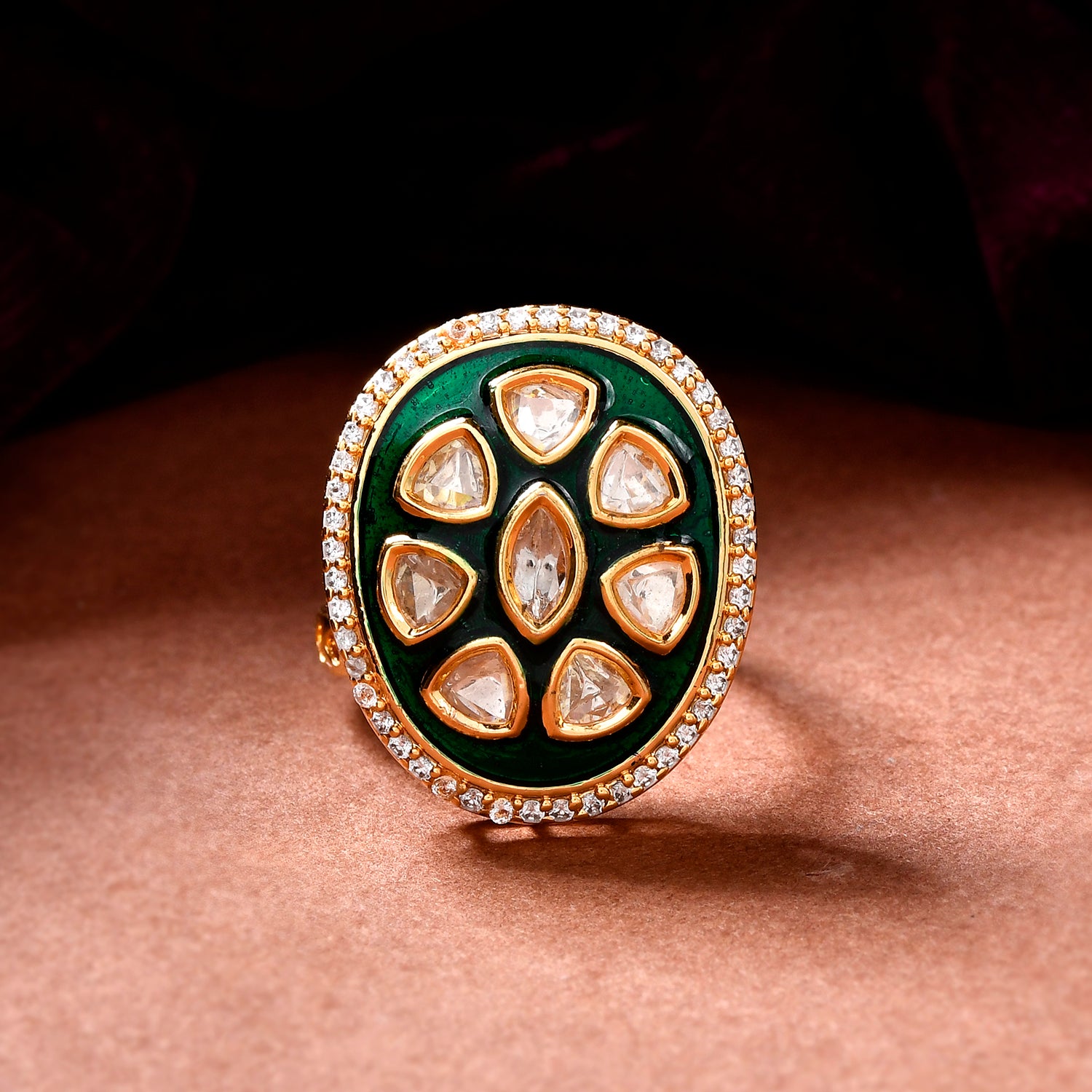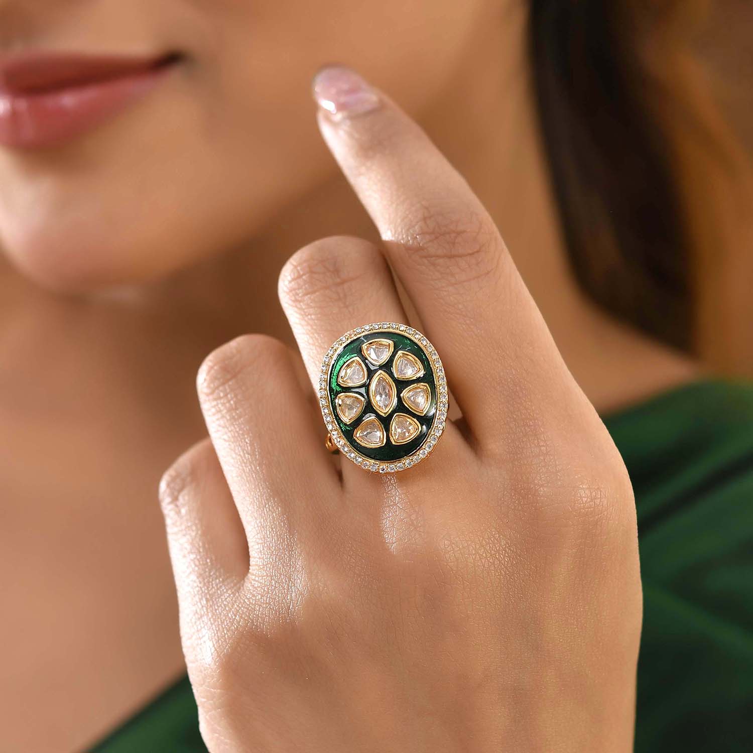 The Emerald Shine Ring from the Kundan Elegance collection is an exquisite piece designed to captivate. Crafted from high-quality brass and plated with luxurious gold, this statement ring features a central marquise-shaped kundan stone surrounded by six teardrop-shaped kundan stones, all set against a vibrant green enamel background. The outer edge is adorned with a delicate row of sparkling stones, adding a touch of elegance and sophistication. This ring is perfect for weddings, festive occasions, and pooja ceremonies, effortlessly complementing both ethnic and contemporary outfits. The rich green and gold hues make it an ideal gift for women on special occasions such as Valentine's Day, Diwali, Rakshabandhan, Christmas, and New Year. Whether for a girlfriend, wife, mother, sister, or lover, the Emerald Shine Ring is a timeless and thoughtful gift that exudes royal charm and elegance.
