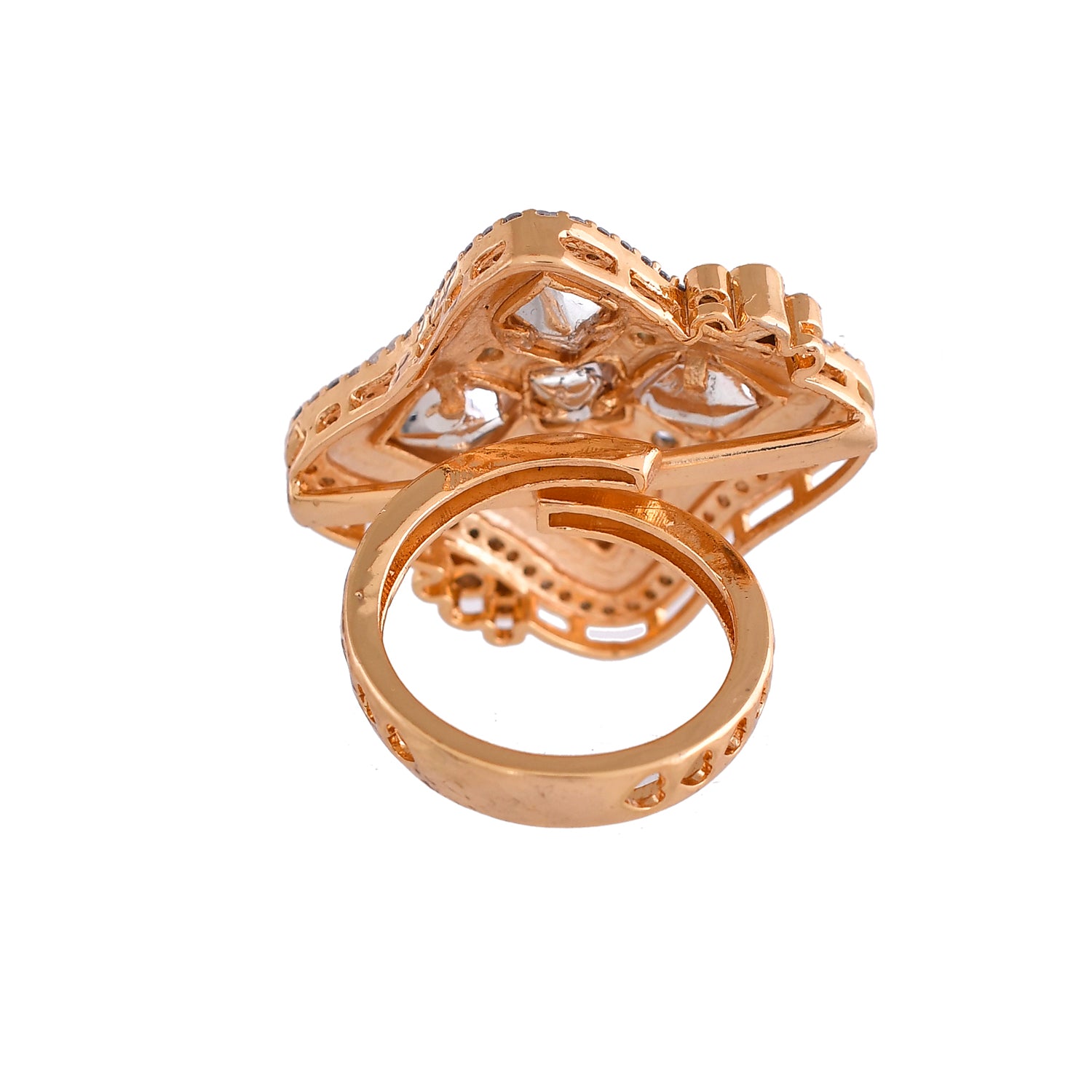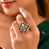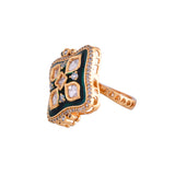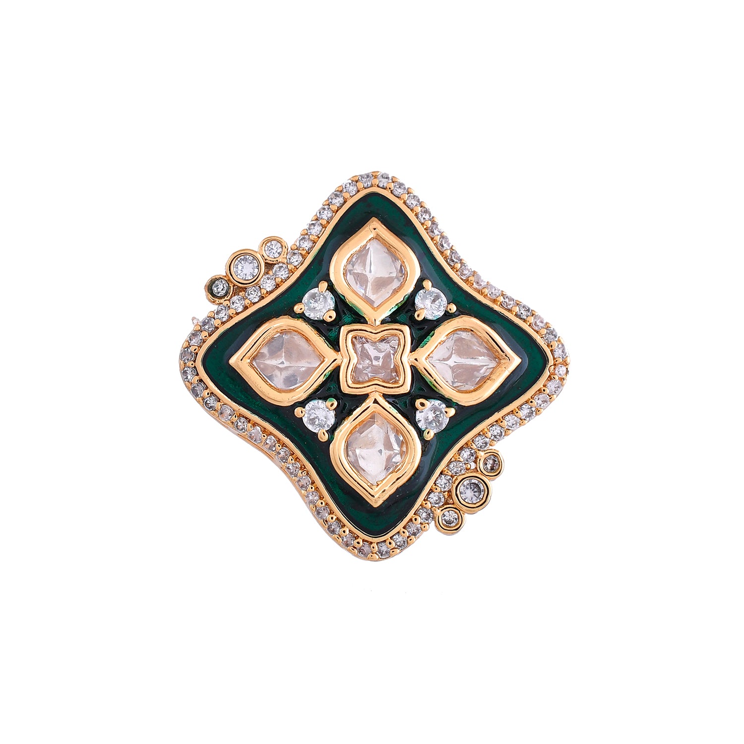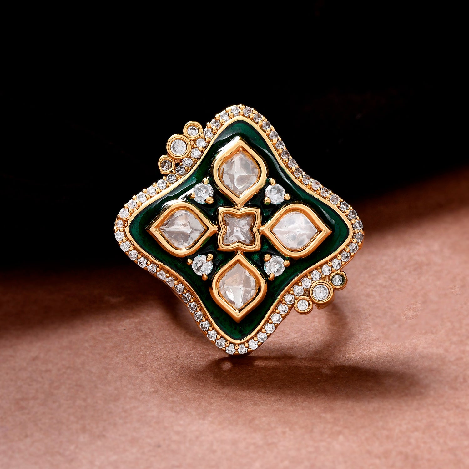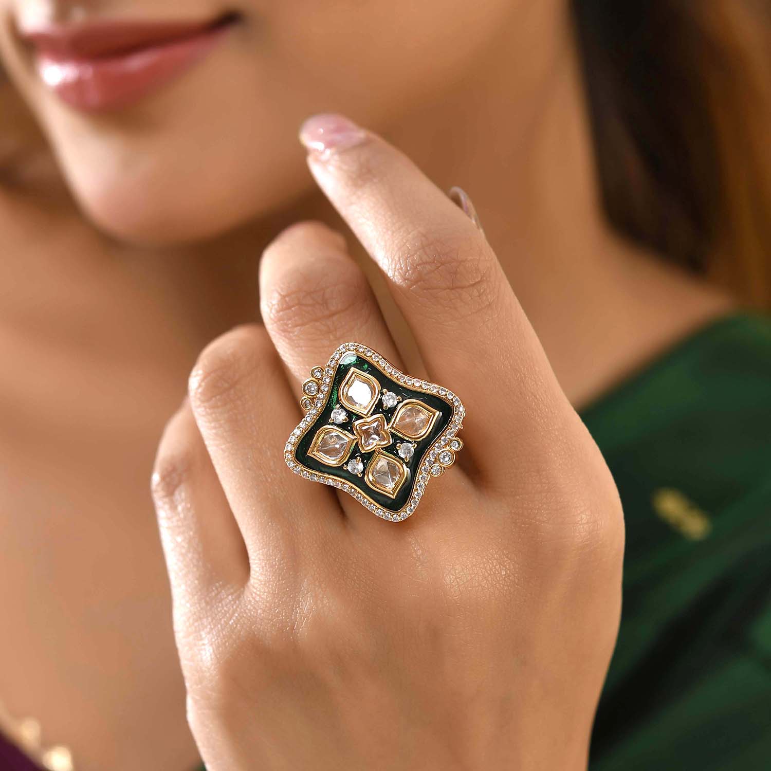 The Meher Ring is a stunning piece from the Kundan Elegance collection, meticulously crafted from high-quality brass and adorned with a luxurious gold plating. This exquisite ring features a captivating design with a central square Kundan stone surrounded by four teardrop-shaped Kundan stones, all set within a rich green enamel border and accented with sparkling white stones. The intricate detailing and royal aesthetic make it a perfect statement piece for weddings, festive occasions, and traditional ceremonies. Its versatile design complements ethnic attire beautifully, adding a touch of elegance and sophistication. This ring is an ideal gift for women, whether for Valentine's Day, Diwali, Rakshabandhan, or any special occasion, making it a cherished addition to any jewelry collection.