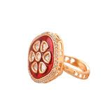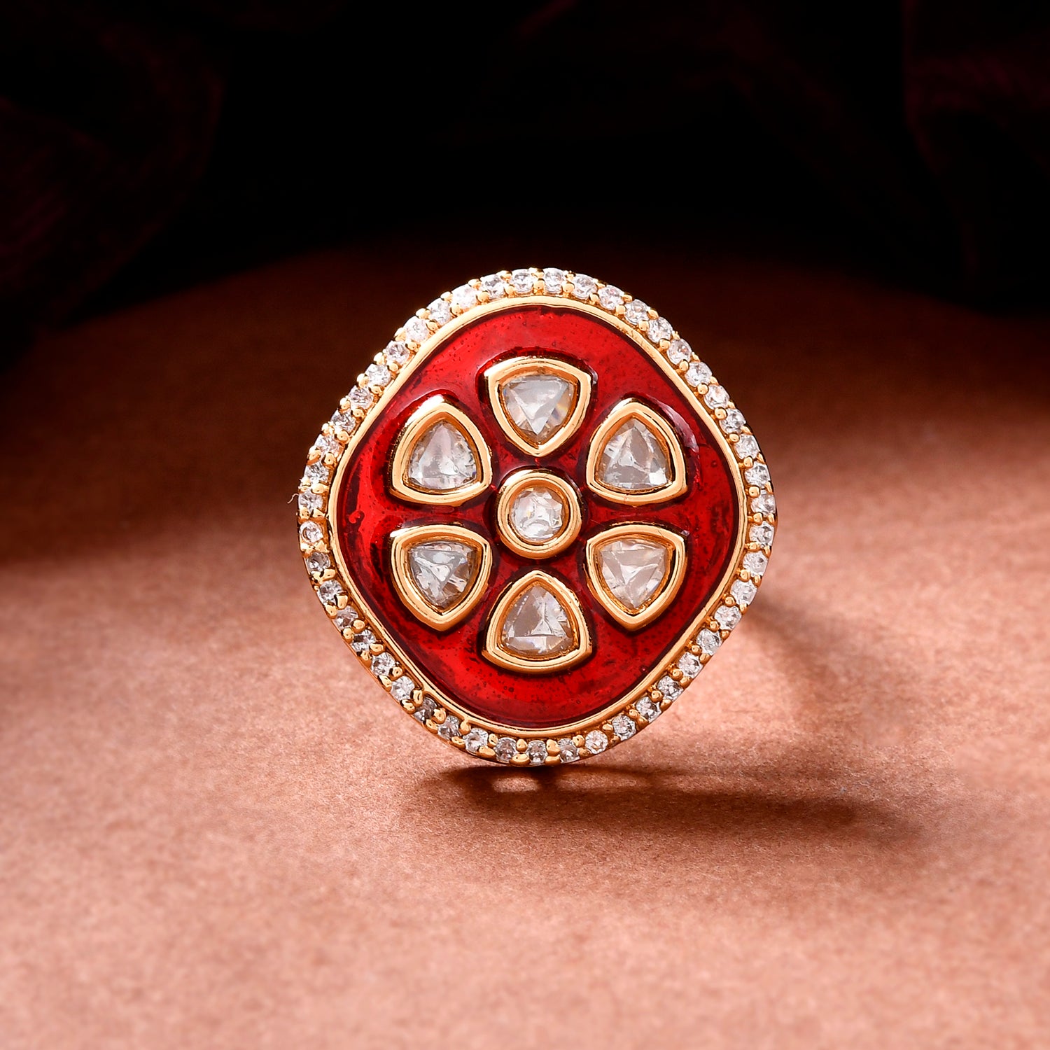 The Royal Enamel Kesar Ring is a stunning piece from the Kundan Elegance collection, meticulously crafted from high-quality brass with a luxurious gold plating. This exquisite ring features a vibrant red enamel base adorned with six beautifully cut kundan stones arranged in a floral pattern, surrounded by a delicate border of sparkling stones. The intricate design and superior craftsmanship make it a perfect statement piece for weddings, festive occasions, and traditional ceremonies. Its rich colors and elegant design make it an ideal gift for women, whether for Valentine's Day, Diwali, Rakshabandhan, or Christmas. Pair this ring with ethnic attire for a regal look or with contemporary outfits to add a touch of sophistication. The Royal Enamel Kesar Ring is not just a piece of jewelry, but a timeless treasure that exudes elegance and grace.