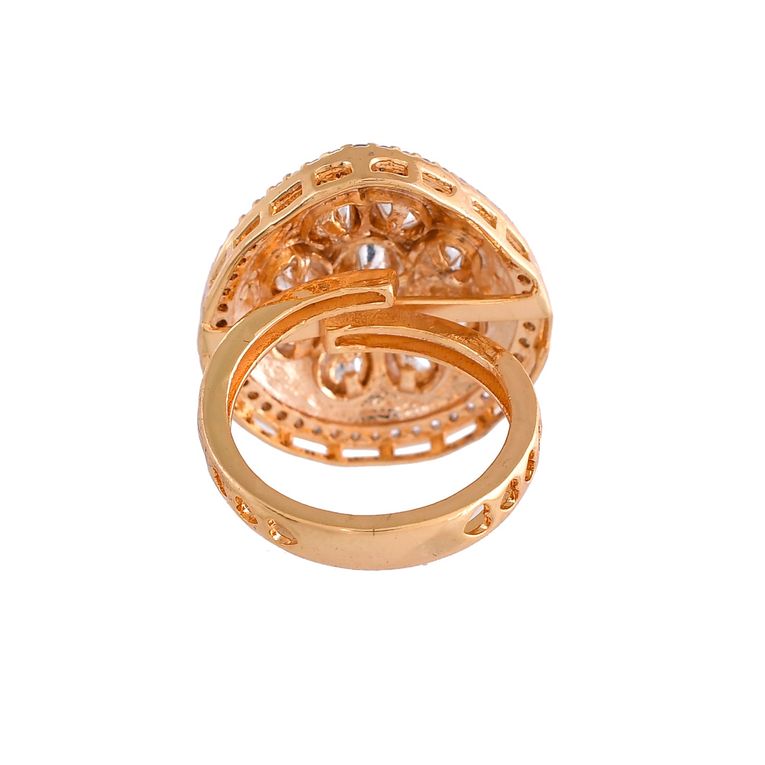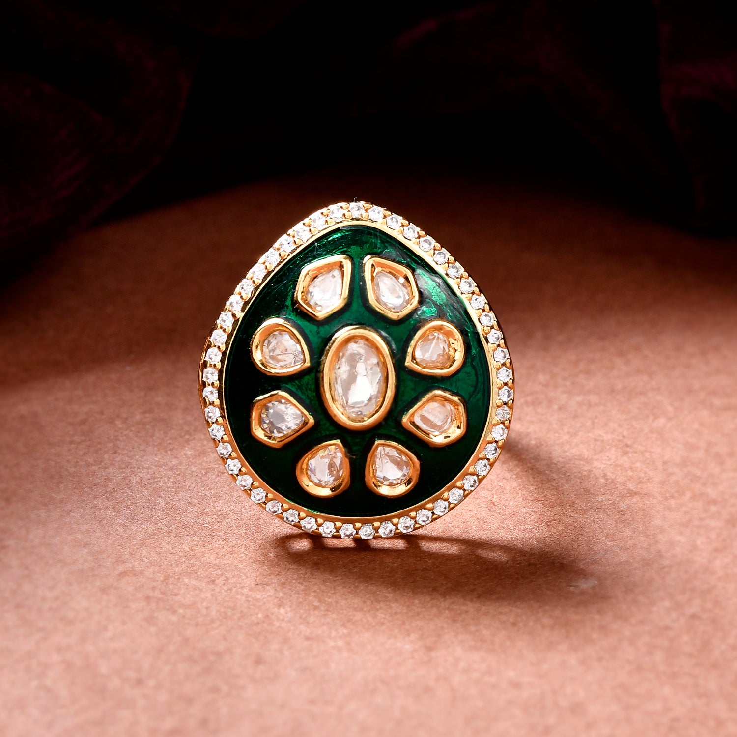 The Shahi Meena Emerald Ring, a radiant piece from the Kundan Elegance collection, is meticulously crafted from high-quality brass with an opulent gold plating. This exquisite ring showcases a lush green enamel base, adorned with intricate Kundan stone settings in a sophisticated floral design. The central oval stone is elegantly surrounded by smaller teardrop-shaped stones, all framed in a delicate gold border and highlighted by a halo of sparkling white stones. Ideal for weddings, festive occasions, or as a standout statement piece, this ring exudes royal and ethnic charm. It's a versatile accessory that pairs beautifully with traditional attire for poojas or festive events and adds a touch of sophistication to a cocktail dress. An exceptional gift for women, whether for Valentine's Day, Diwali, Rakshabandhan, or Christmas, this ring is more than just jewelry—it's a cherished treasure.