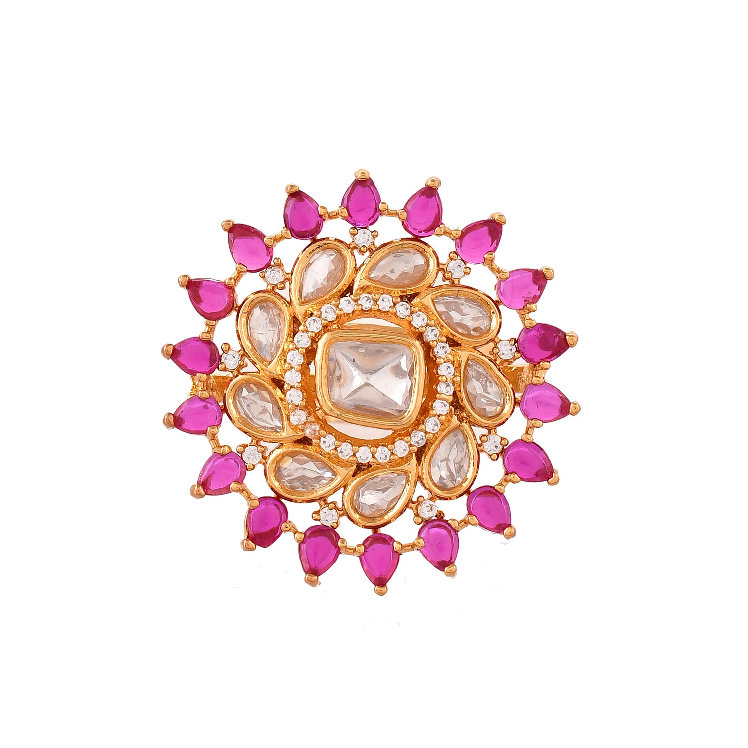 The Scarlet Essence Kundan Ring is an exquisite piece from the Kundan Opulence collection, crafted with precision and care from high-quality brass and adorned with a luxurious gold plating. This ring features a central square-cut stone surrounded by a halo of clear, teardrop-shaped Kundan stones, beautifully accented by deep red gemstones. The intricate design and superior craftsmanship make it a perfect statement piece for weddings, festive occasions, or any special event. Its rich color palette and elegant design make it a versatile accessory that pairs beautifully with traditional ethnic wear or contemporary outfits. This ring is an ideal gift for women, whether for Valentine's Day, Diwali, Raksha Bandhan, Christmas, or New Year, making it a cherished addition to any jewelry collection. Perfect for gifting to a sister, girlfriend, wife, mother, or any loved one, the Scarlet Essence Kundan Ring embodies elegance and timeless beauty.