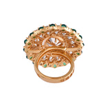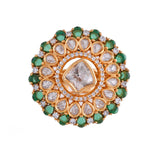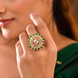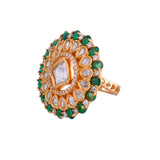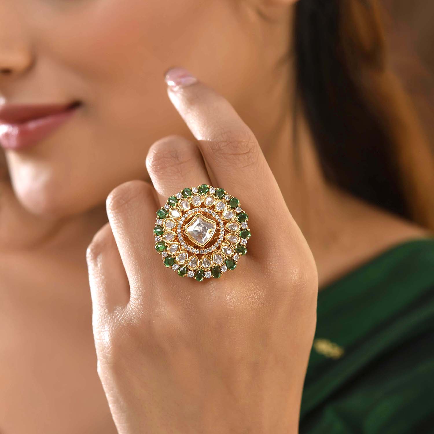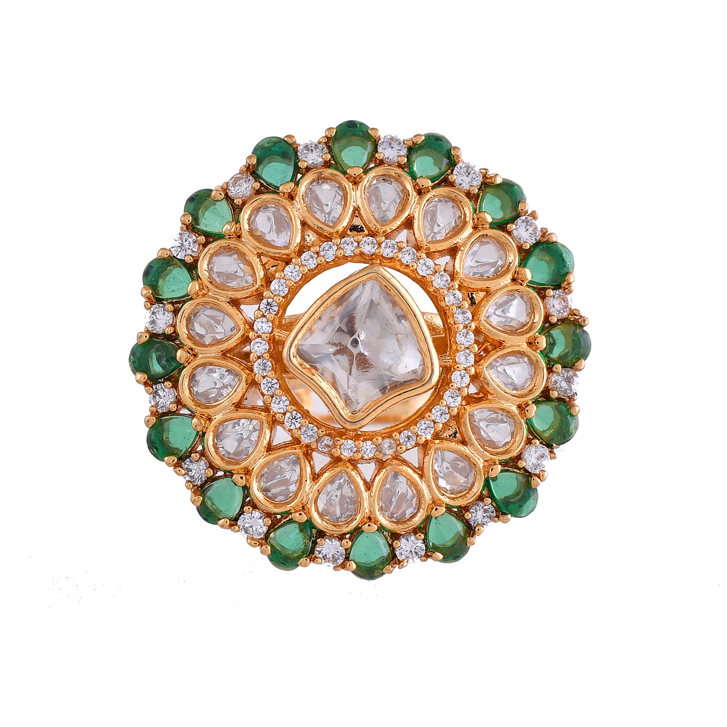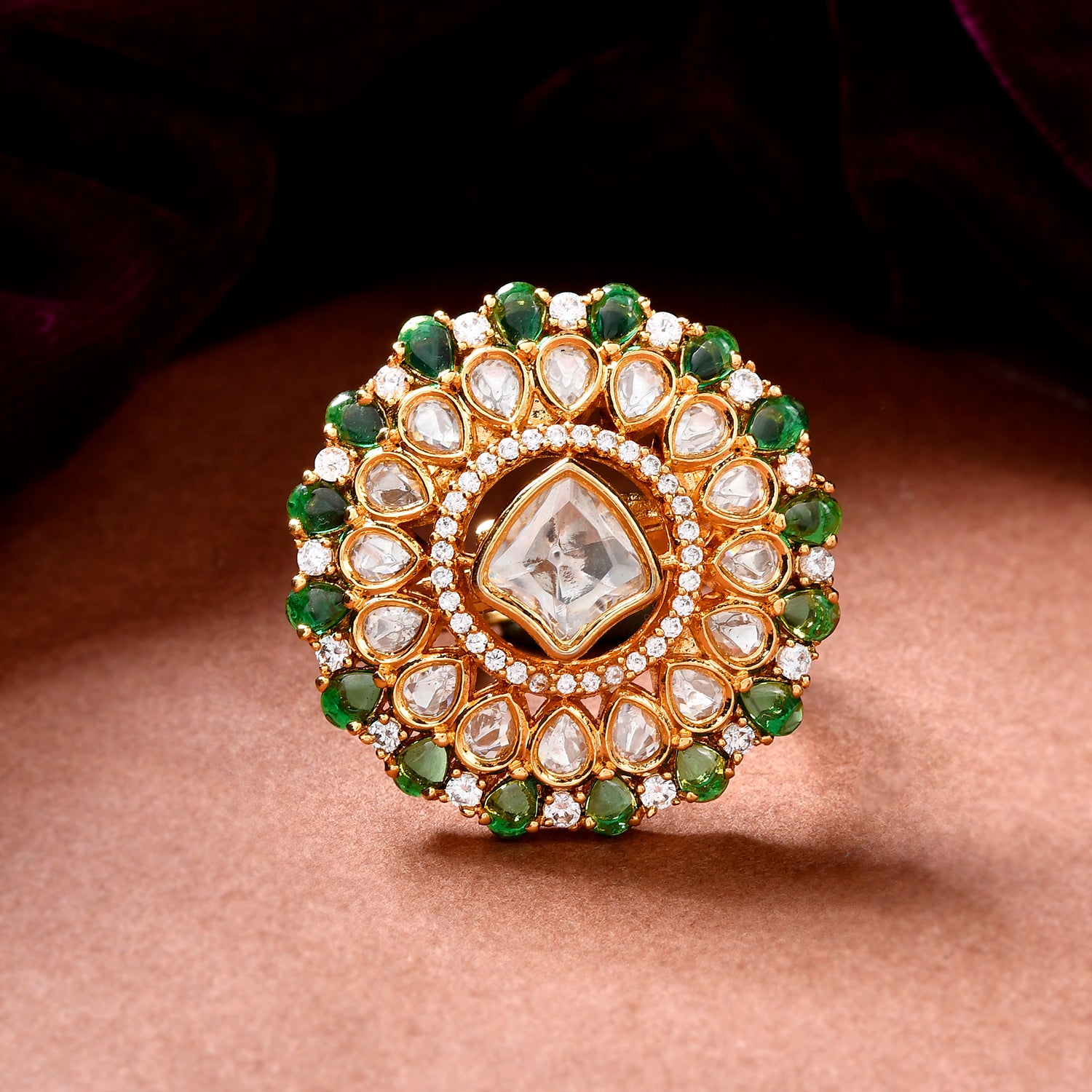 Introducing the Shahi Chand Green Ring from the Kundan Opulence collection, a stunning piece that effortlessly blends tradition with elegance. Meticulously crafted from high-quality brass and adorned with luxurious gold plating, this ring features a central diamond-shaped stone surrounded by a halo of smaller white stones, with an outer layer of alternating green and white stones that exude sophistication. Perfect for weddings, festive occasions, and traditional ceremonies, this statement ring elevates any look, whether paired with ethnic wear or contemporary outfits. Its vibrant green and white color palette makes it a versatile addition to any jewelry collection, and an exceptional gift for women on occasions like Valentine's Day, Diwali, Rakshabandhan, Christmas, and New Year. Ideal for wives, girlfriends, mothers, sisters, and friends, this elegant piece is bound to be cherished.