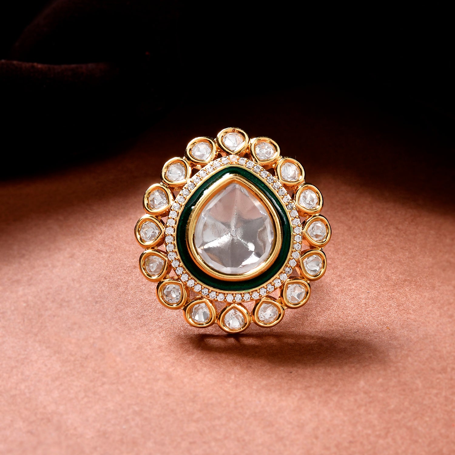 The Viraasat Emerald Ring is a stunning piece from the Kundan Opulence collection, meticulously crafted from high-quality brass with a luxurious gold plating. This exquisite ring features a central teardrop-shaped emerald stone, surrounded by a halo of smaller kundan stones, creating a regal and elegant design. The intricate detailing and superior craftsmanship make it a perfect statement piece for weddings, festive occasions, and traditional ceremonies like pooja and Diwali. The rich green hue of the emerald adds a touch of sophistication, making it an ideal gift for women on special occasions such as Valentine's Day, Rakshabandhan, Christmas, and New Year. This versatile ring can be styled with ethnic wear for a royal look or paired with contemporary outfits for a chic, festive appearance. Whether gifting it to a sister, girlfriend, wife, or mother, the Viraasat Emerald Ring is sure to be cherished and admired.