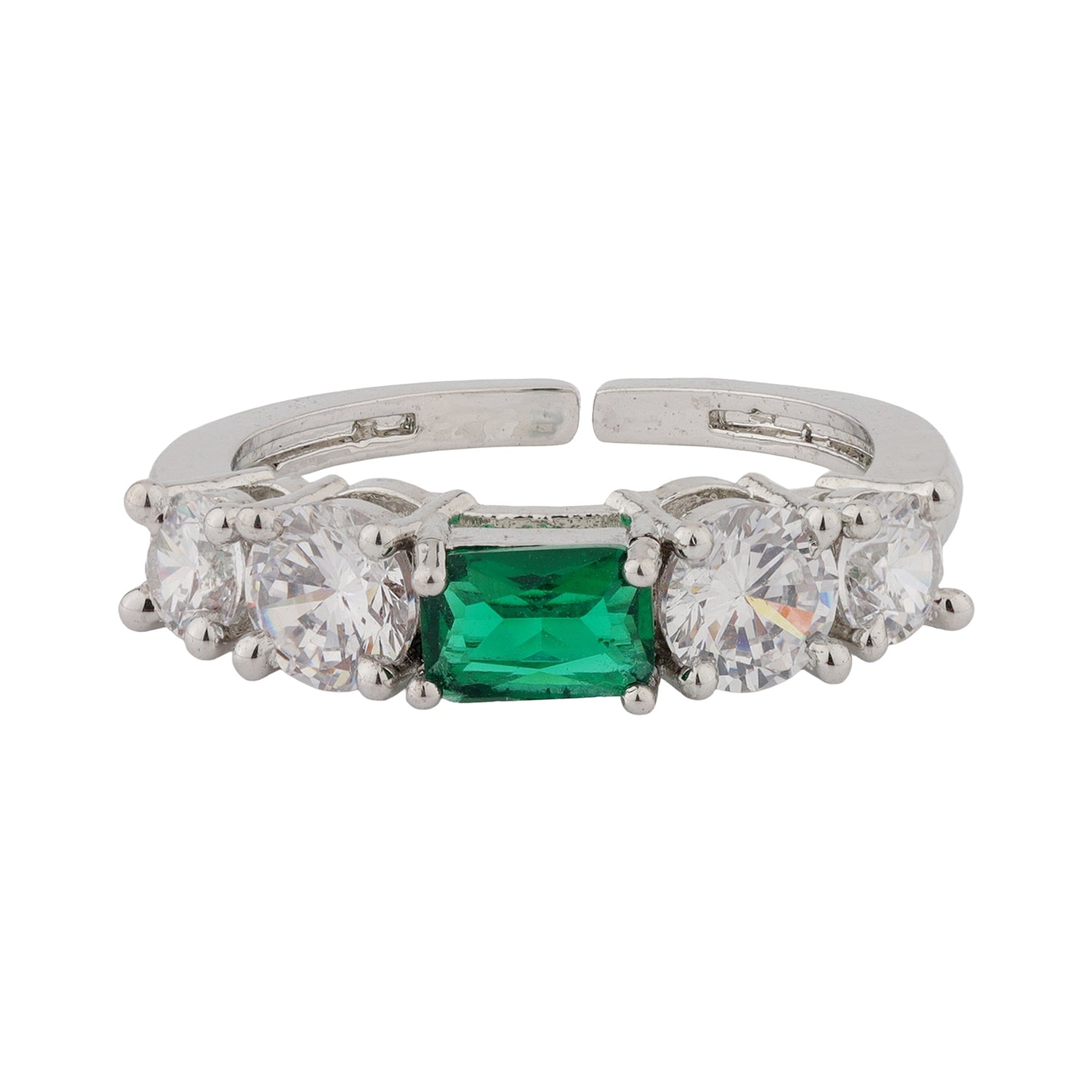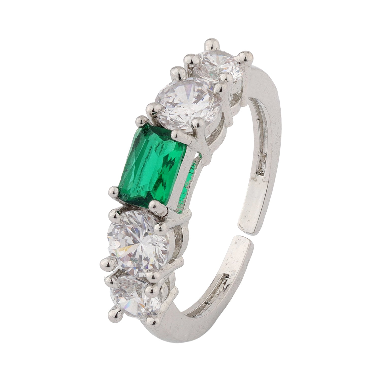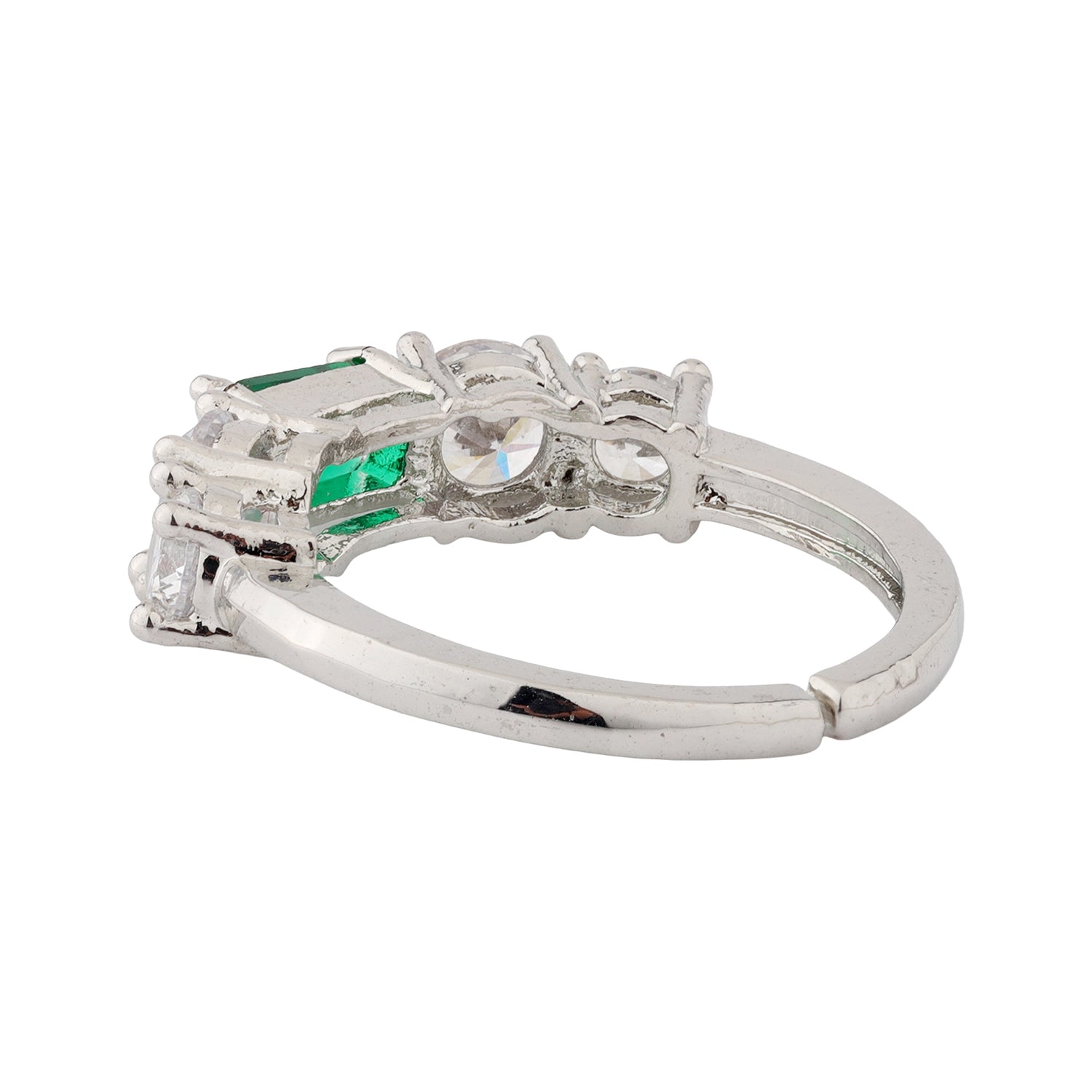 Embrace refined sophistication with the Sparkling Elegance Collection presenting the Emerald Radiance Statement Ring for women, a true embodiment of class, poise, and timeless charm. Crafted from premium brass and coated in luxurious white rhodium plating, this stunning ring showcases a vivid emerald-green rectangular CZ stone at its center. The captivating centerpiece is framed by delicate marquise-cut white CZ stones, gracefully set along a split band encrusted with sparkling crystals, creating a perfect harmony of brilliance and balance. The Emerald Radiance Ring is a flawless blend of elegance and modern artistry, ideal for those who appreciate understated glamour. Whether styled for a wedding, festive event, or cocktail evening, this designer Ring adds a touch of sophistication to any outfit. It’s also a thoughtful gift for wife, gift for girlfriend, or gift for women who appreciate the allure of fine jewelry.