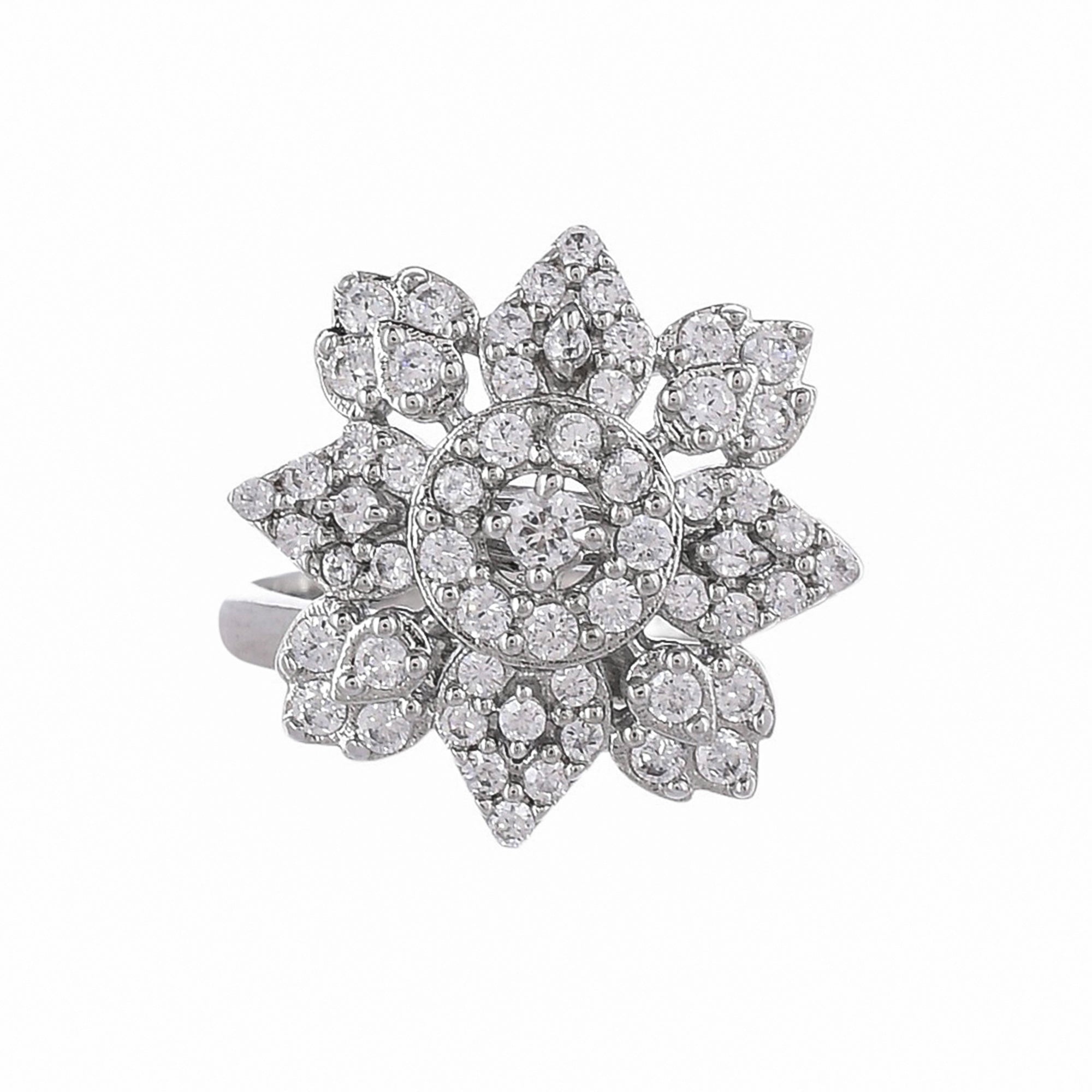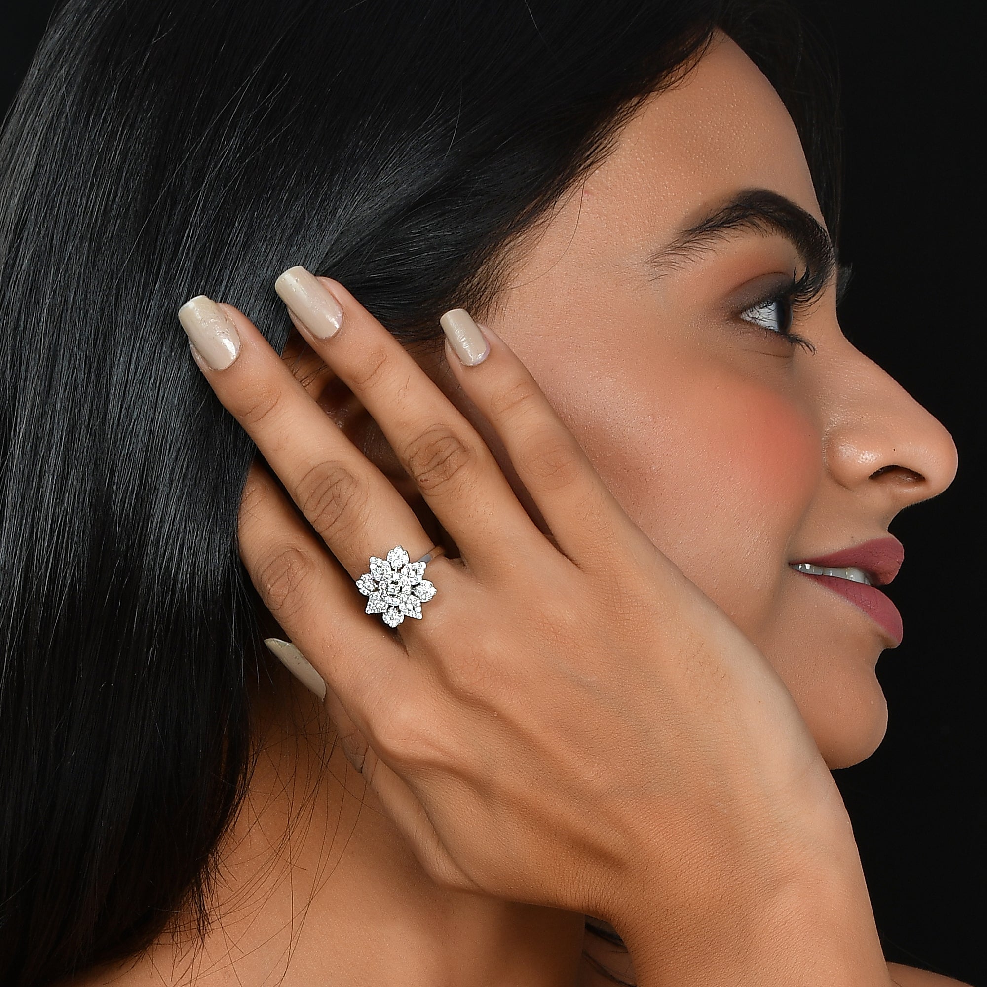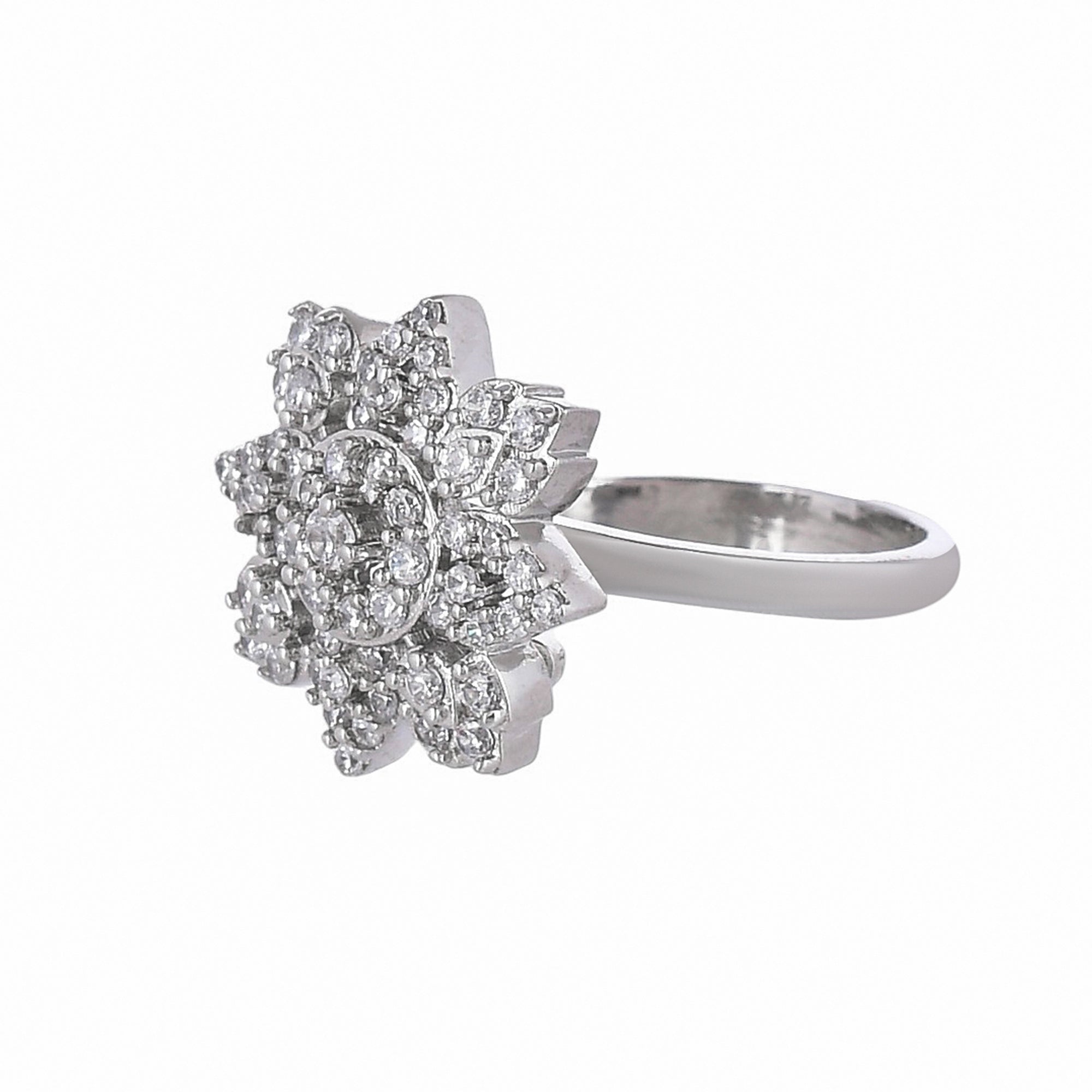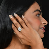 Step into the spotlight with the Halo Essence Floral Radiance Statement Ring—a dazzling fusion of vintage charm and modern elegance. Crafted in premium brass and finished with a luminous white rhodium plating, this American diamond ring features a radiant CZ...